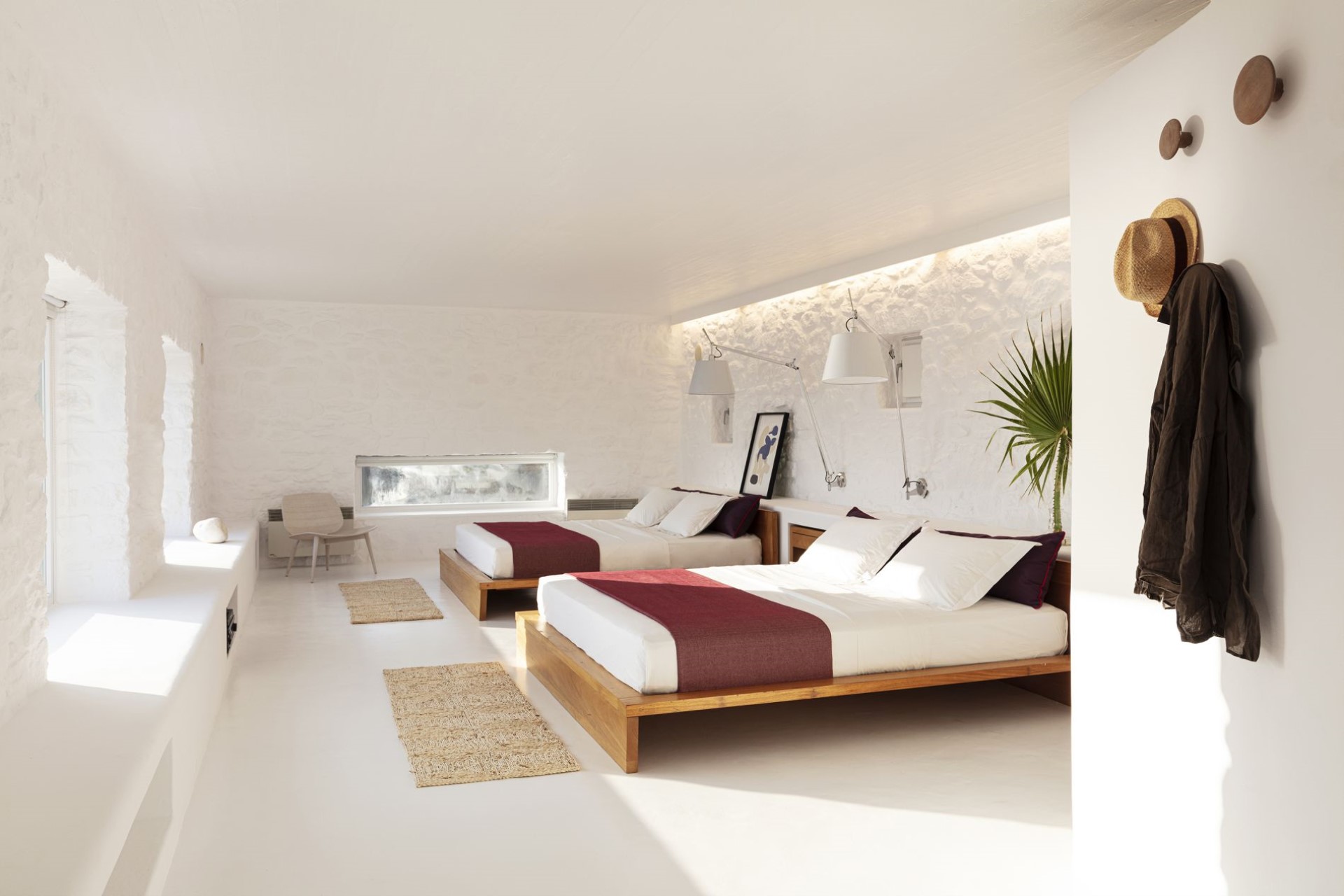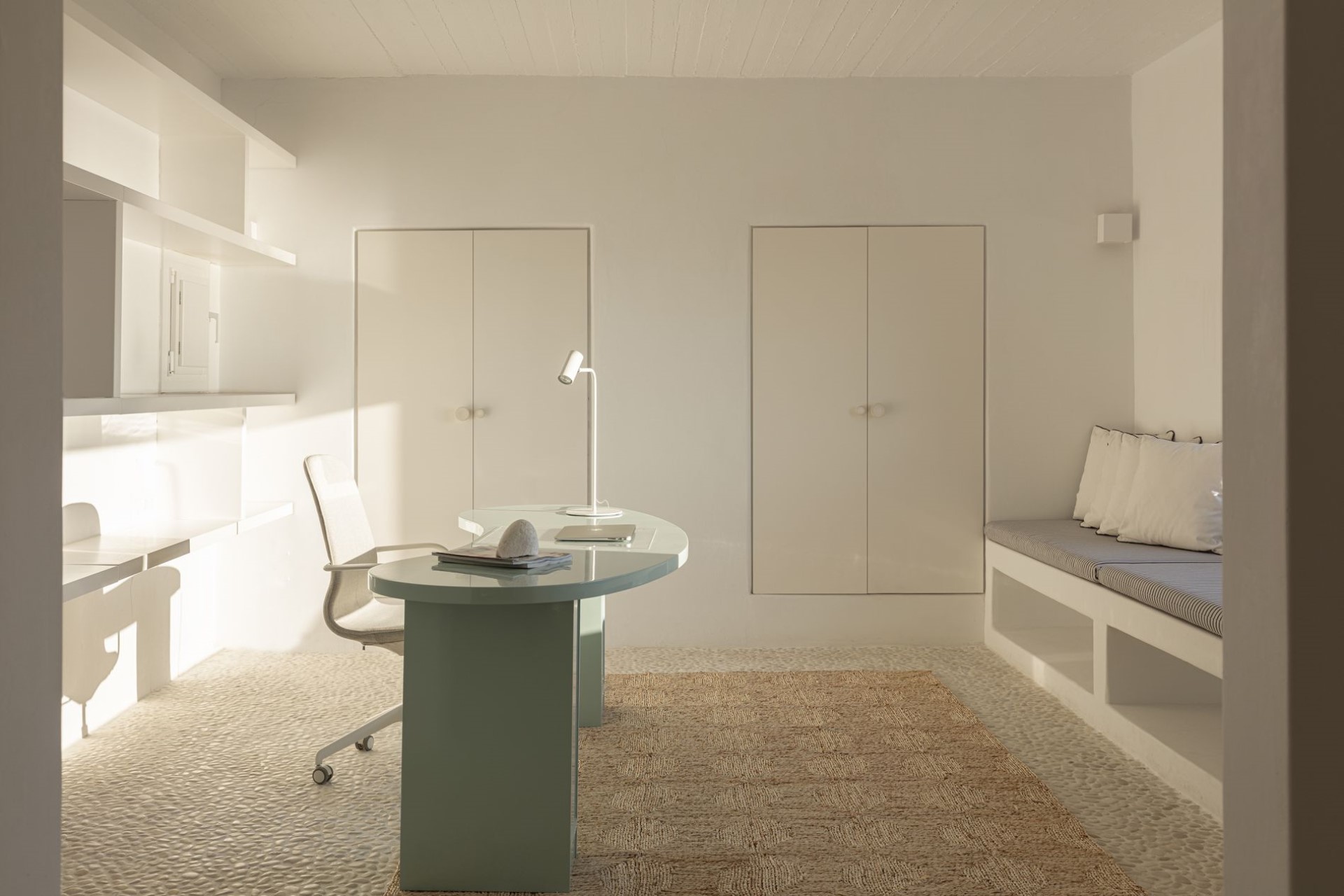 The property accommodates up to six guests in the main villa and six in the guest houses within well-appointed, en-suite bedrooms. Occupying an independent wing of the main villa, the master suite features an atrium, a walk-in closet, a large outdoor Jacuzzi, and a private garden with seating area and sea views. The other two bedrooms of the main villa are on the first floor – one twin and one double, both with access to a sea-view terrace.