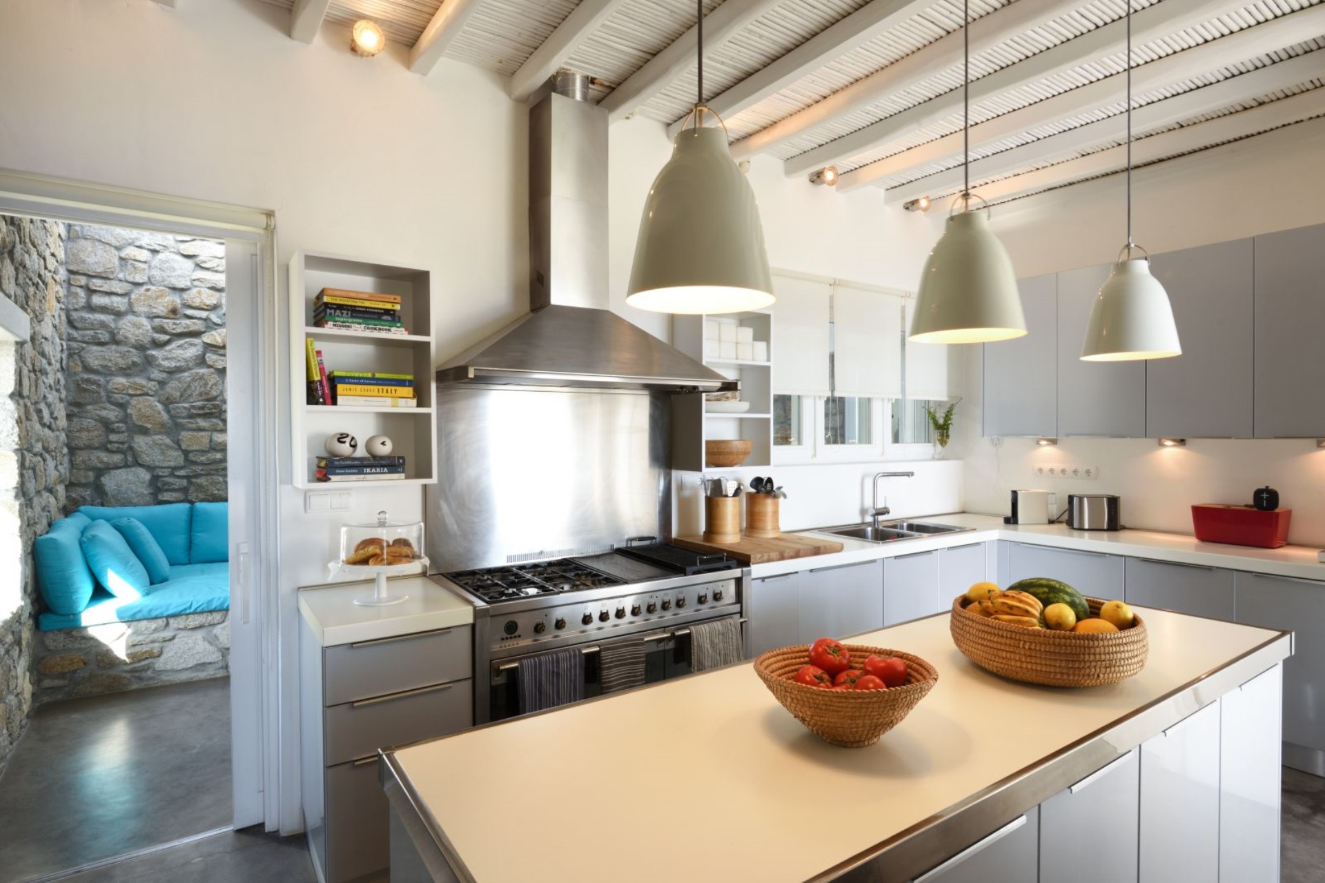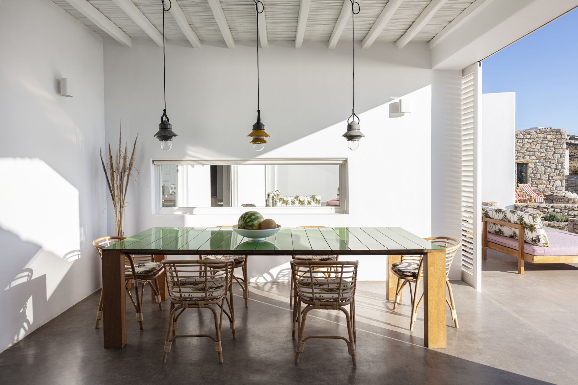 The villa also boasts extensive indoor communal spaces where guests can gather and socialise, including a large living and dining room with high, vaulted ceilings and a deluxe modern kitchen, fully-equipped for cooking up gourmet feasts.