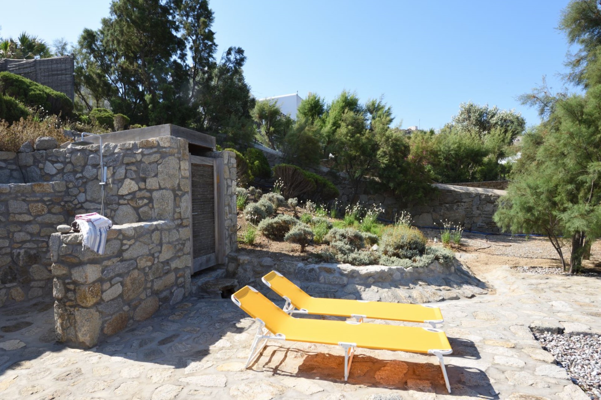The 5,000 square meters of landscaped grounds include terraced gardens full of olive trees, bamboo plantations, flowers, and aromatic herbs. A garden pavilion takes advantage of the wonderful views, and a gate leads to a secluded sandy beach.