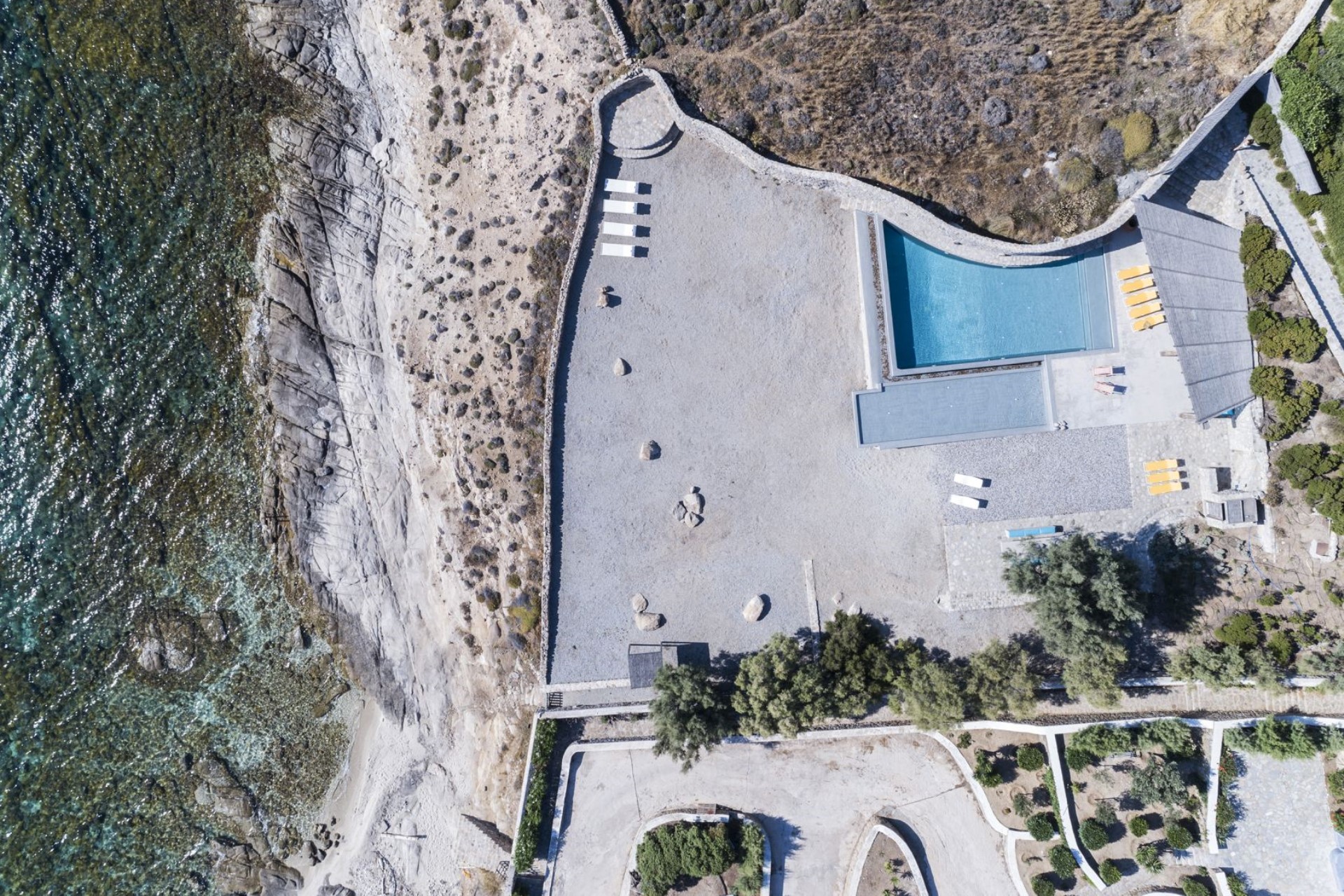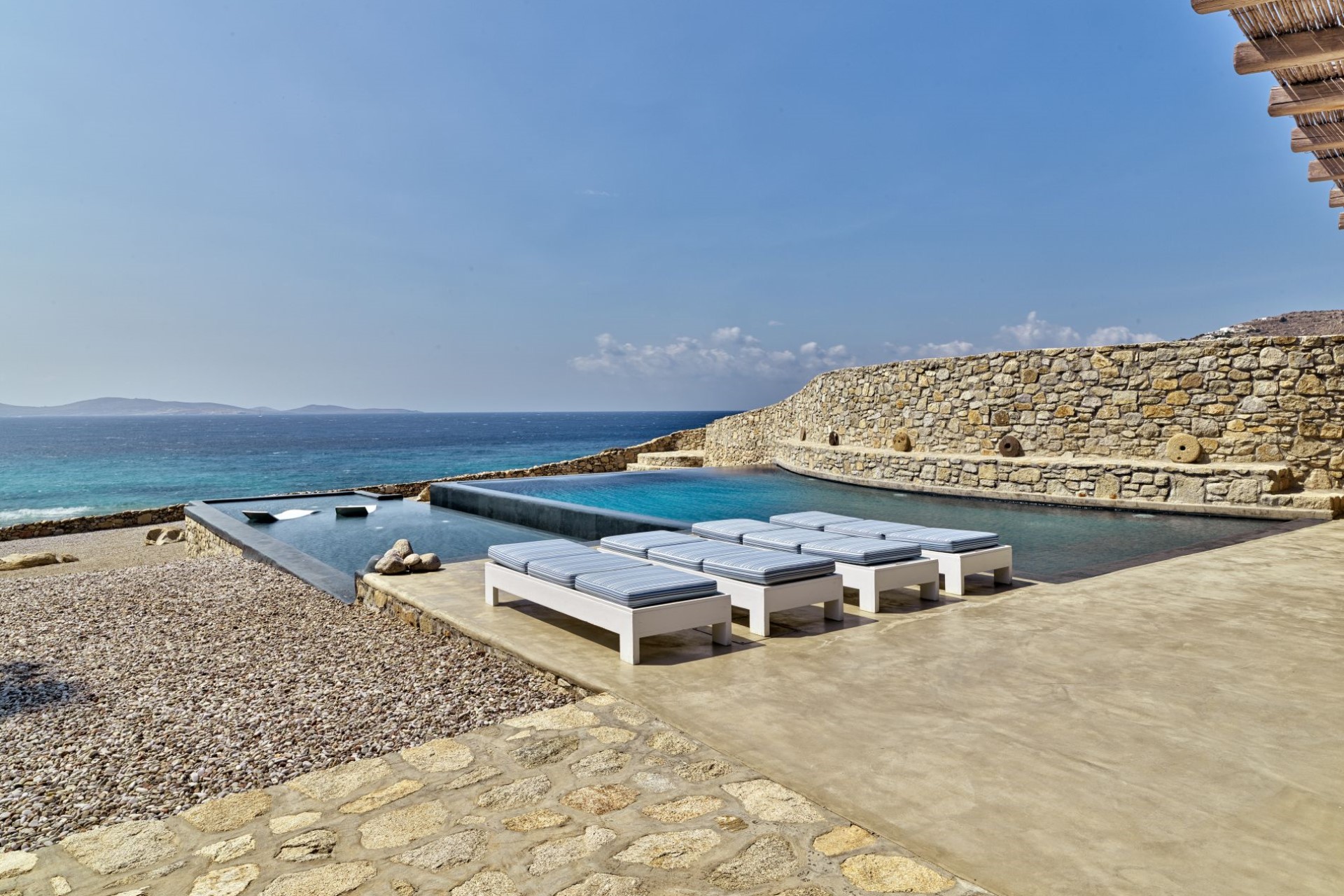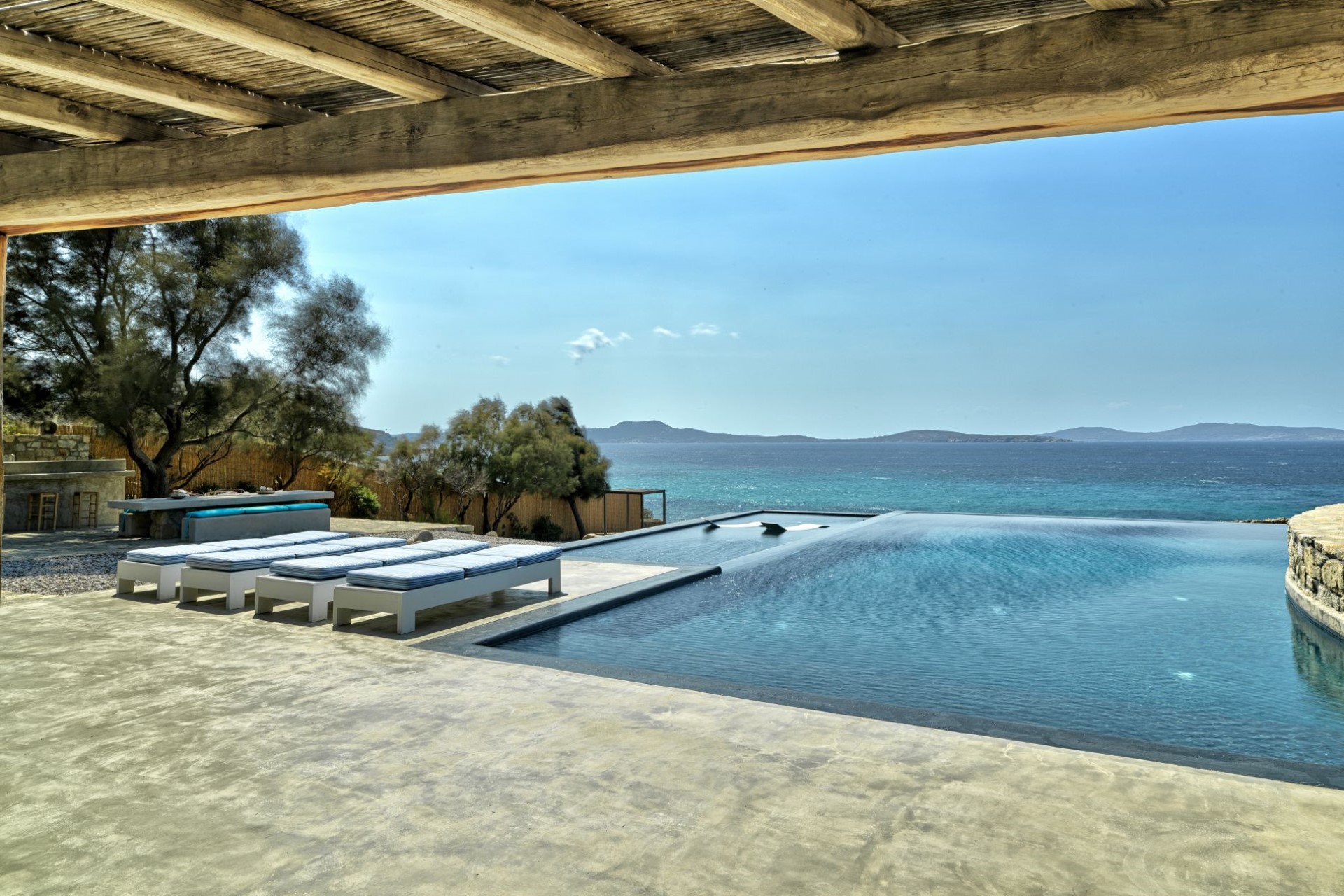 Surrounded by extensive terraces, boasting seating areas covered by a pergola and a poolside bar adjacent to the stunning infinity pool overlooking the Aegean Sea.