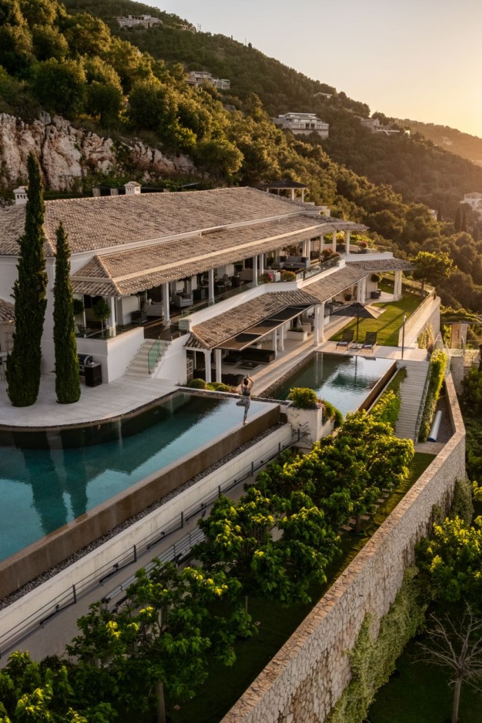 A discreet roadside entrance leads through to a peaceful courtyard, with Indian-style archways and water features. However, it’s when guests make their way to the back of the property, that the villa’s sheer scale and opulence become clear. Guests are greeted by 180-degree views over glistening waters and a magnificent two-tiered swimming pool, connected by a waterfall spilling from one terrace to the next.