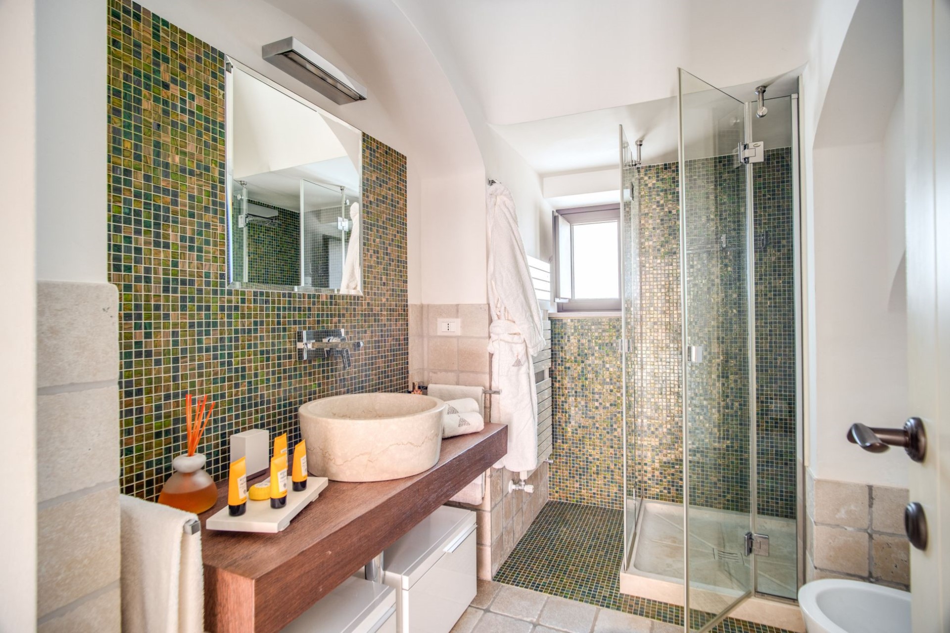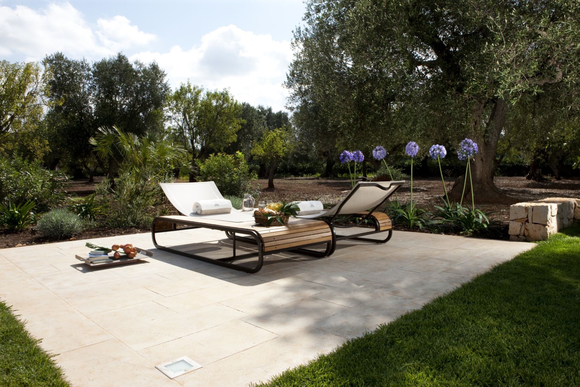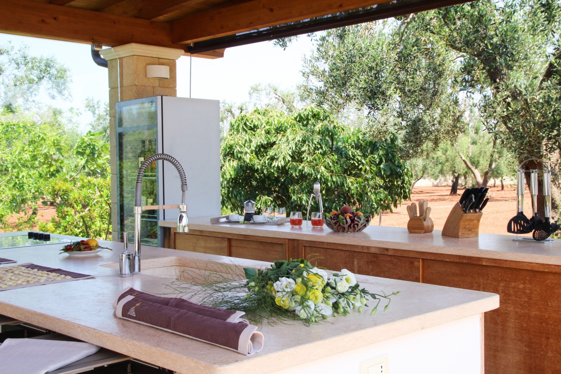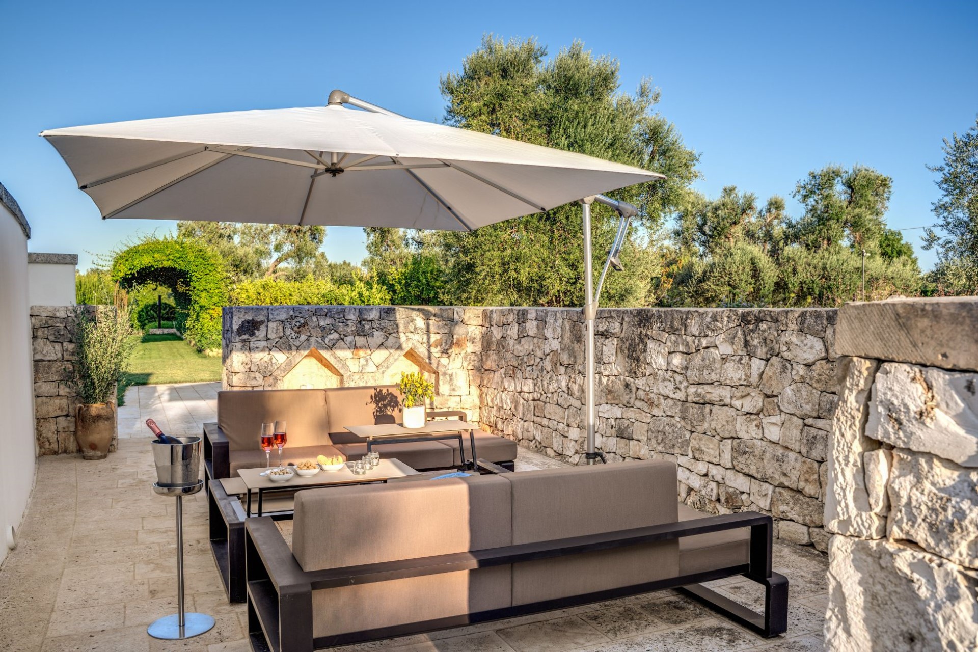 Set in an oasis of olive, walnut and fruit trees, the villa sits at 130 metres above sea level and also boasts stunning sea views.
