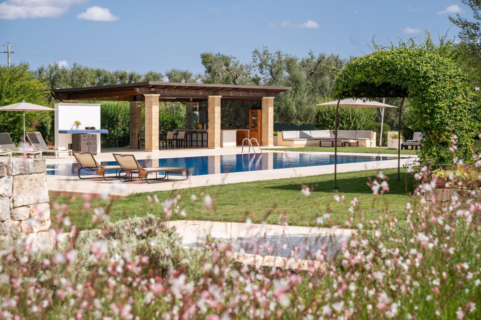 The villa has a stunning swimming pool surrounded by sun loungers, and various outdoor lounge areas perfect for relaxing with a glass of wine and a good book. There’s also a large gazebo equipped with a spacious, well-equipped outdoor kitchen and bar, a built-in barbecue, plus an outdoor dining area perfect for enjoying al fresco feasts in the sunshine.