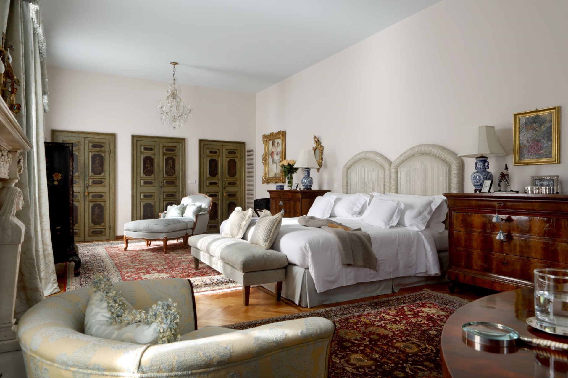 Master Suite – king-size bed, sitting area with fireplace, study, en-suite bathroom with bathtub & separate shower, and private balcony with garden & lake views