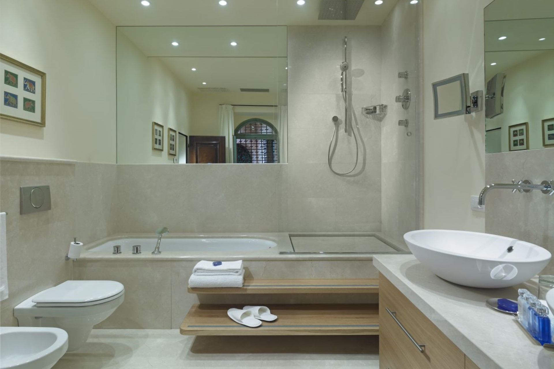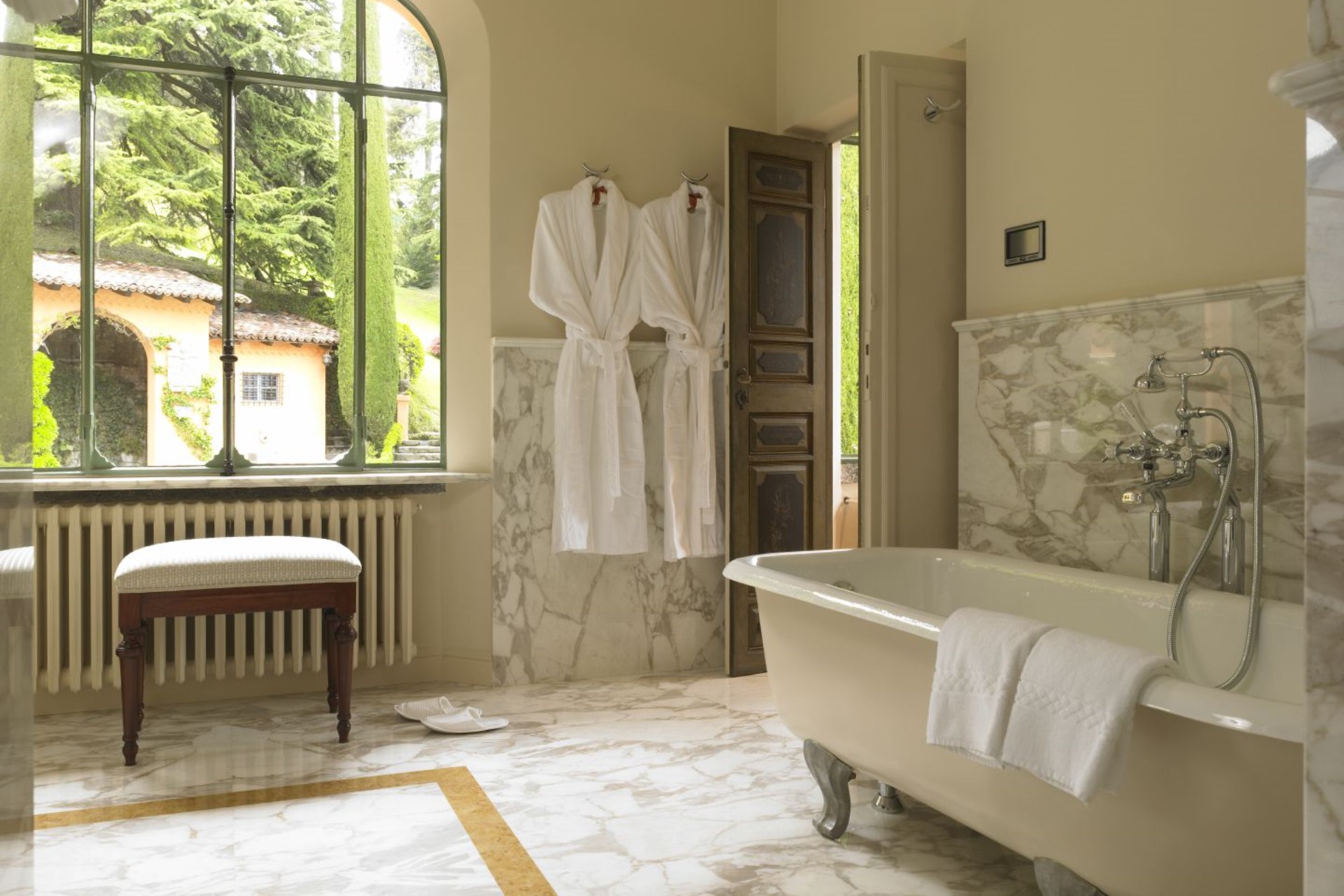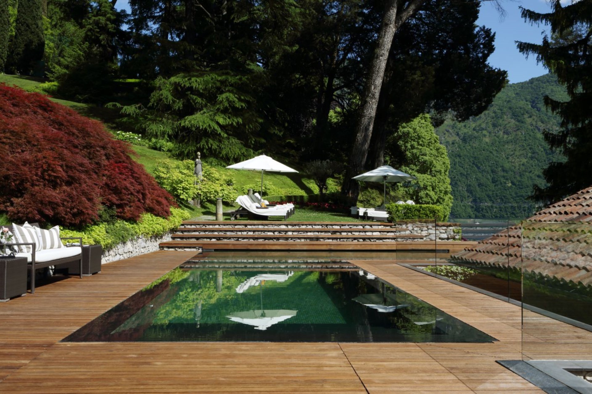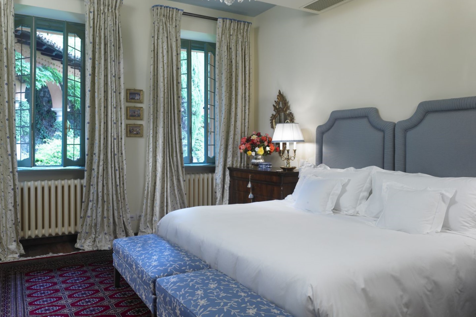 Terrace Bedroom – twin beds (converted to double on request), private bathroom with shower, and terrace with garden & lake views