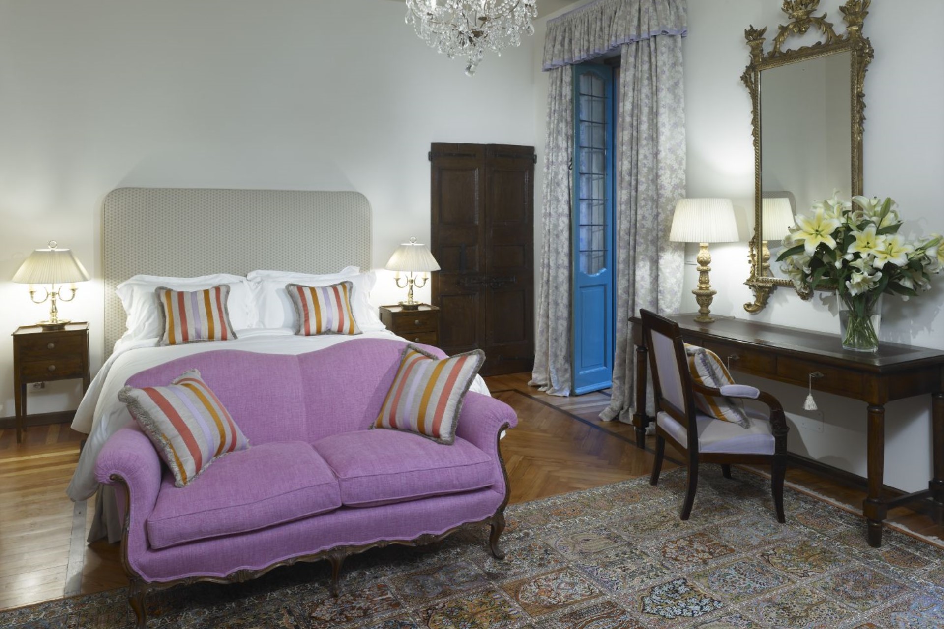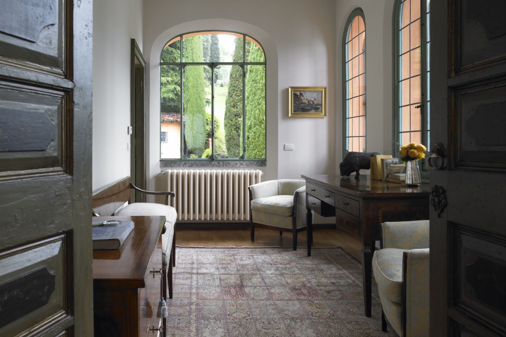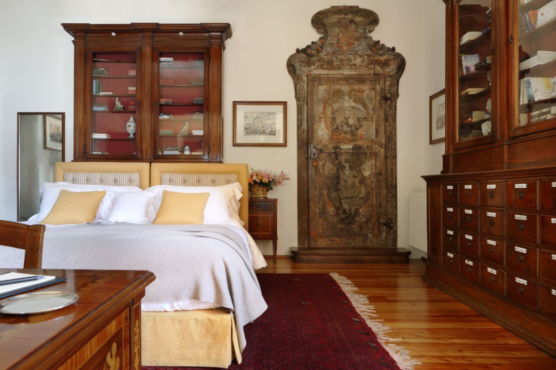 Yellow Suite – twin beds (converted to double on request), antique pharmacy cabinets and medieval doorframe & door, private bathroom with shower, and lake views