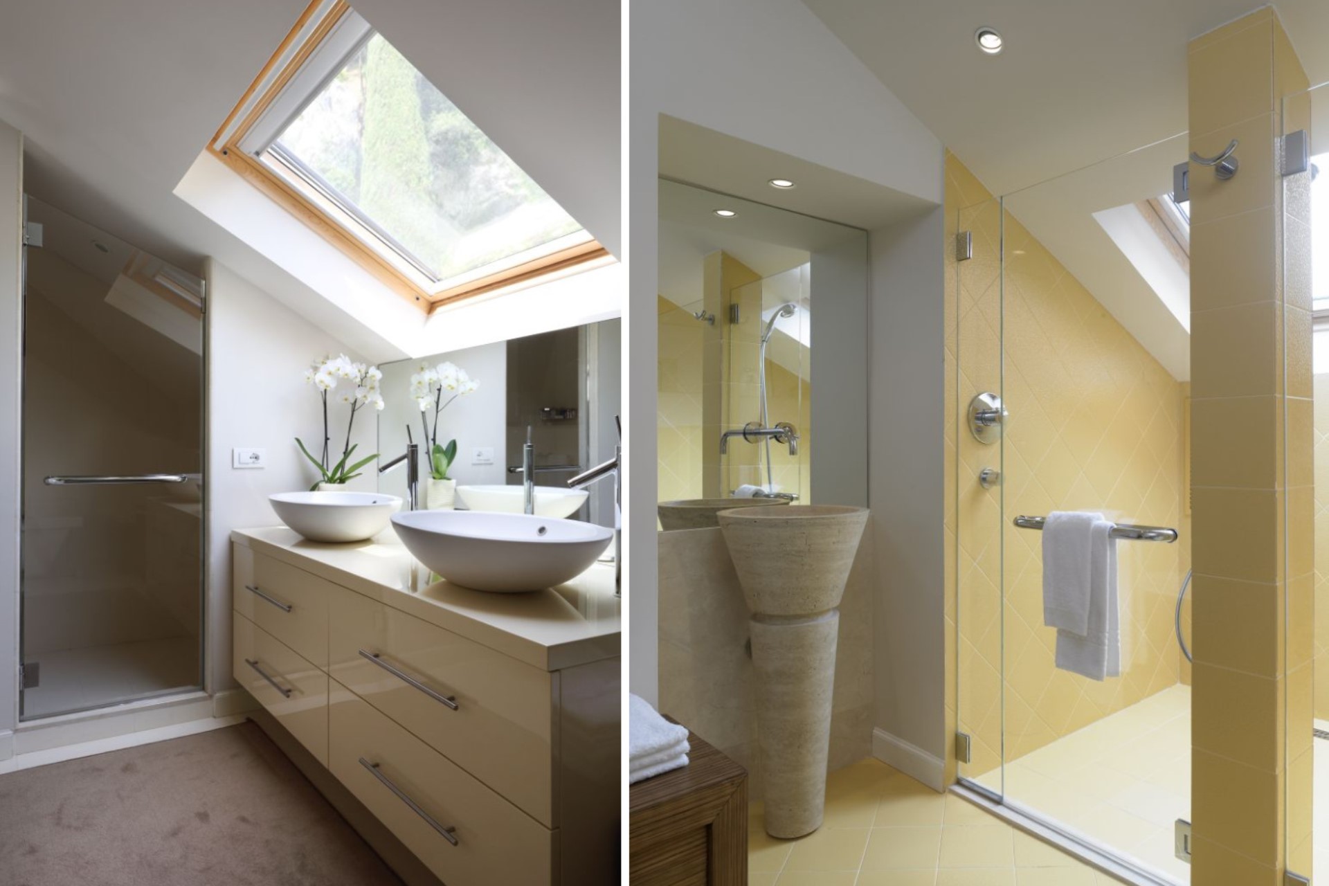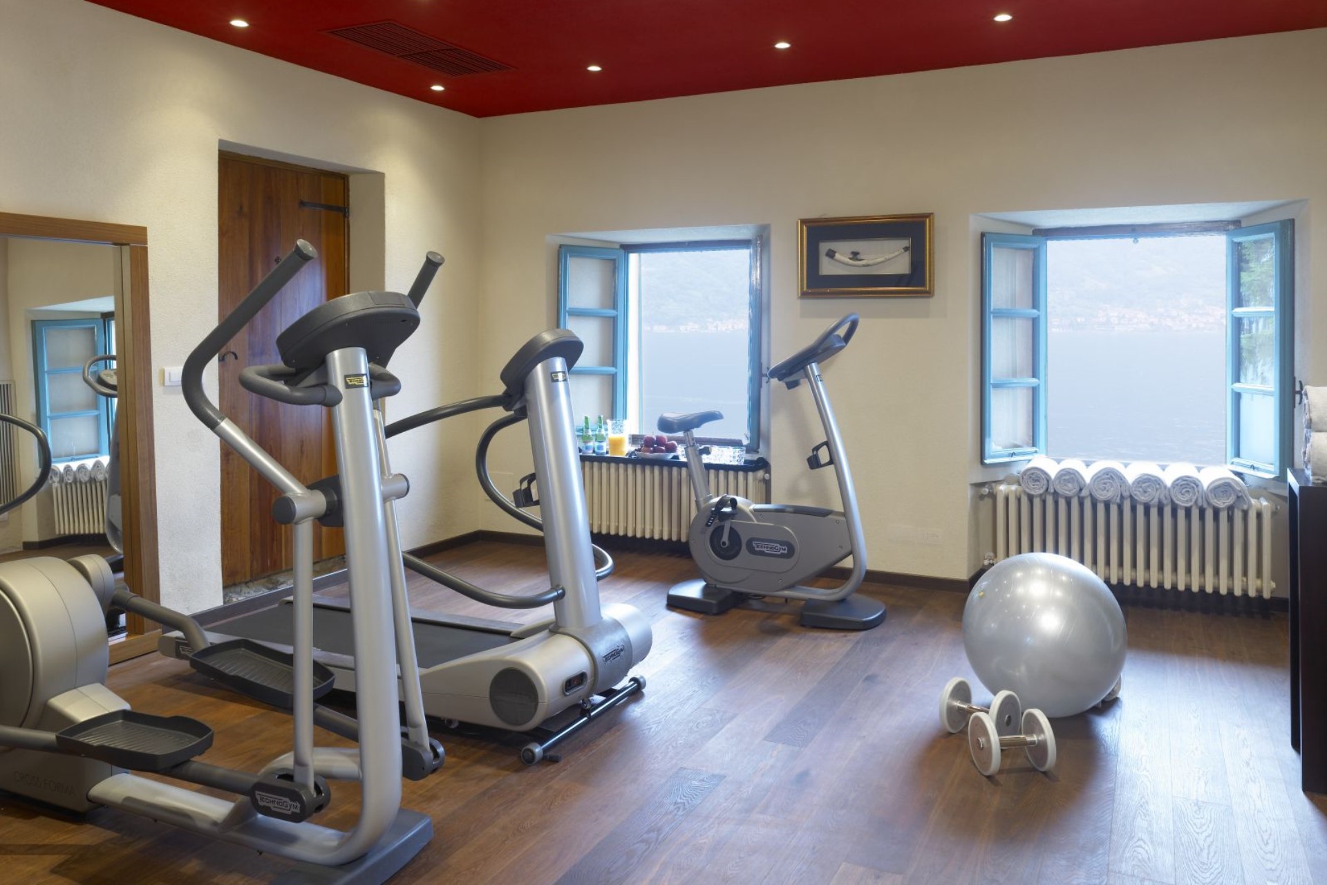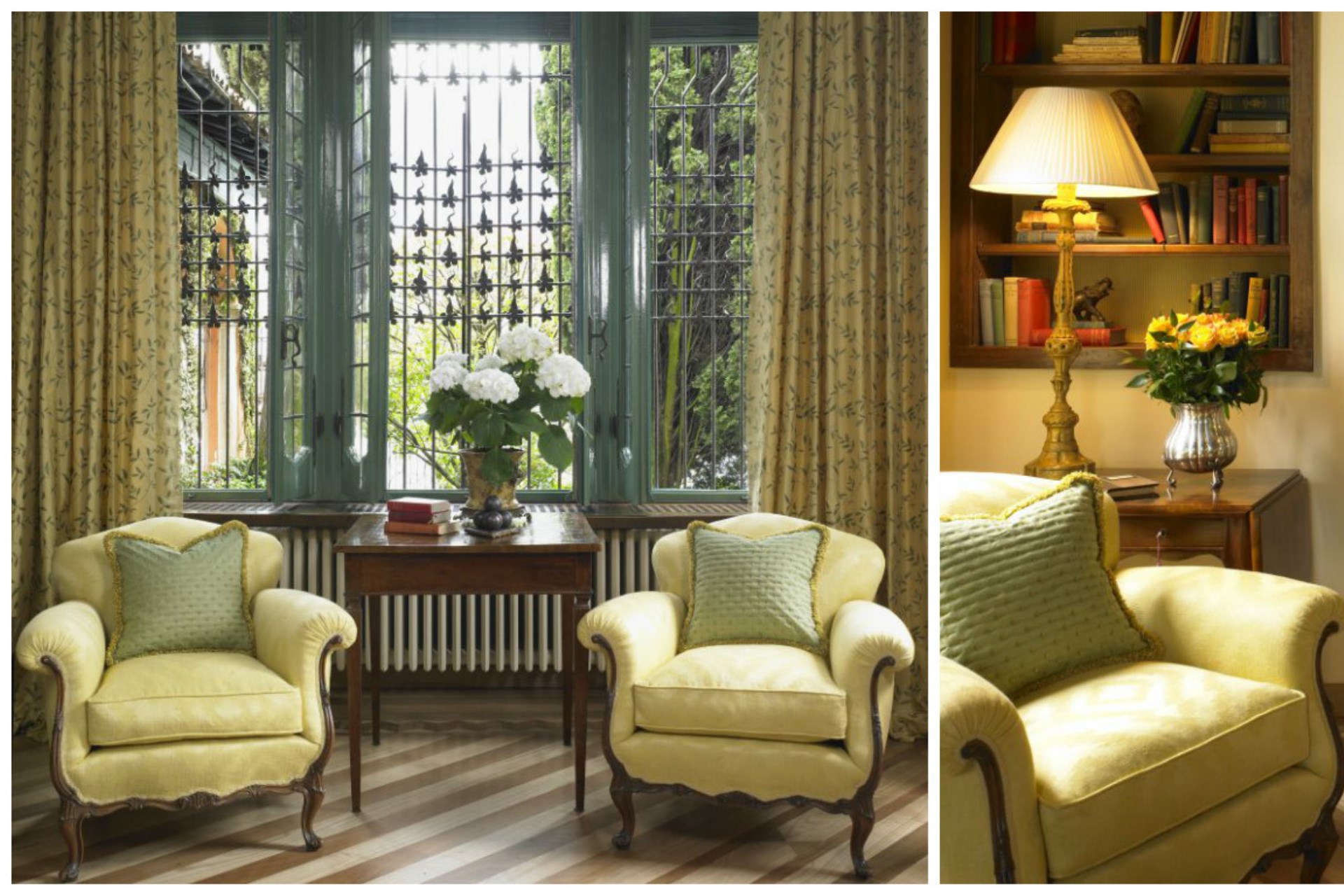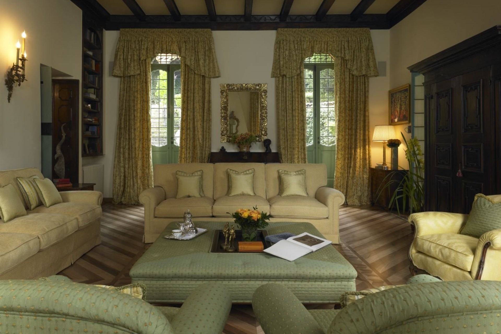 Yellow Suite – twin beds (converted to double on request), antique pharmacy cabinets and medieval doorframe & door, private bathroom with shower, and lake views