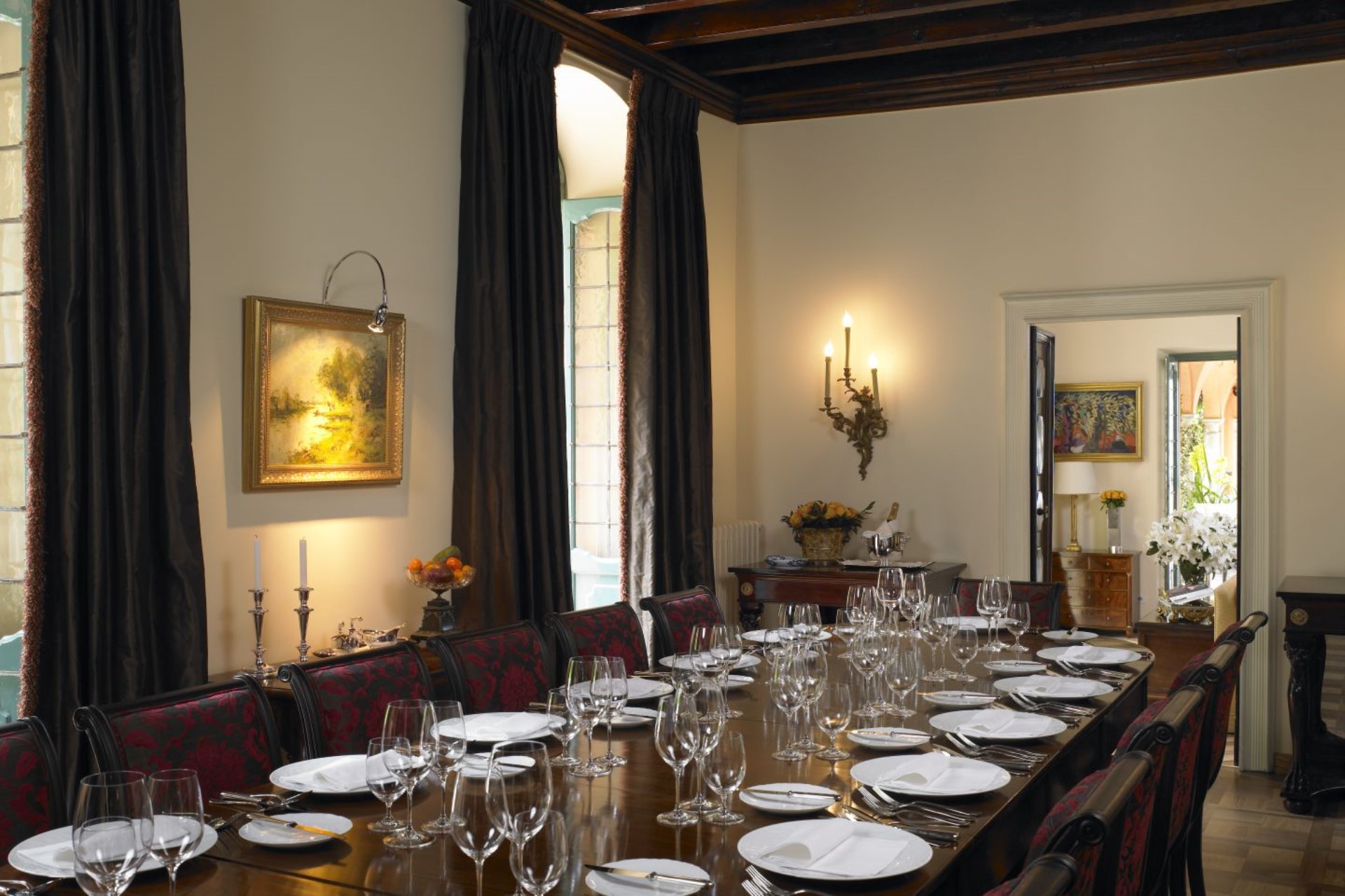 Within the main house, guests will find a grand lobby which features Senese marble floors and elegant wrought iron railing, a formal living room with wooden flooring, a marble fireplace and ample seating. An elegant dining room seats with ample seating and working fireplaces. Next to the dining room is a pantry which connects to the professional kitchen. Finally, there are six elegant bedrooms with en-suite facilities.