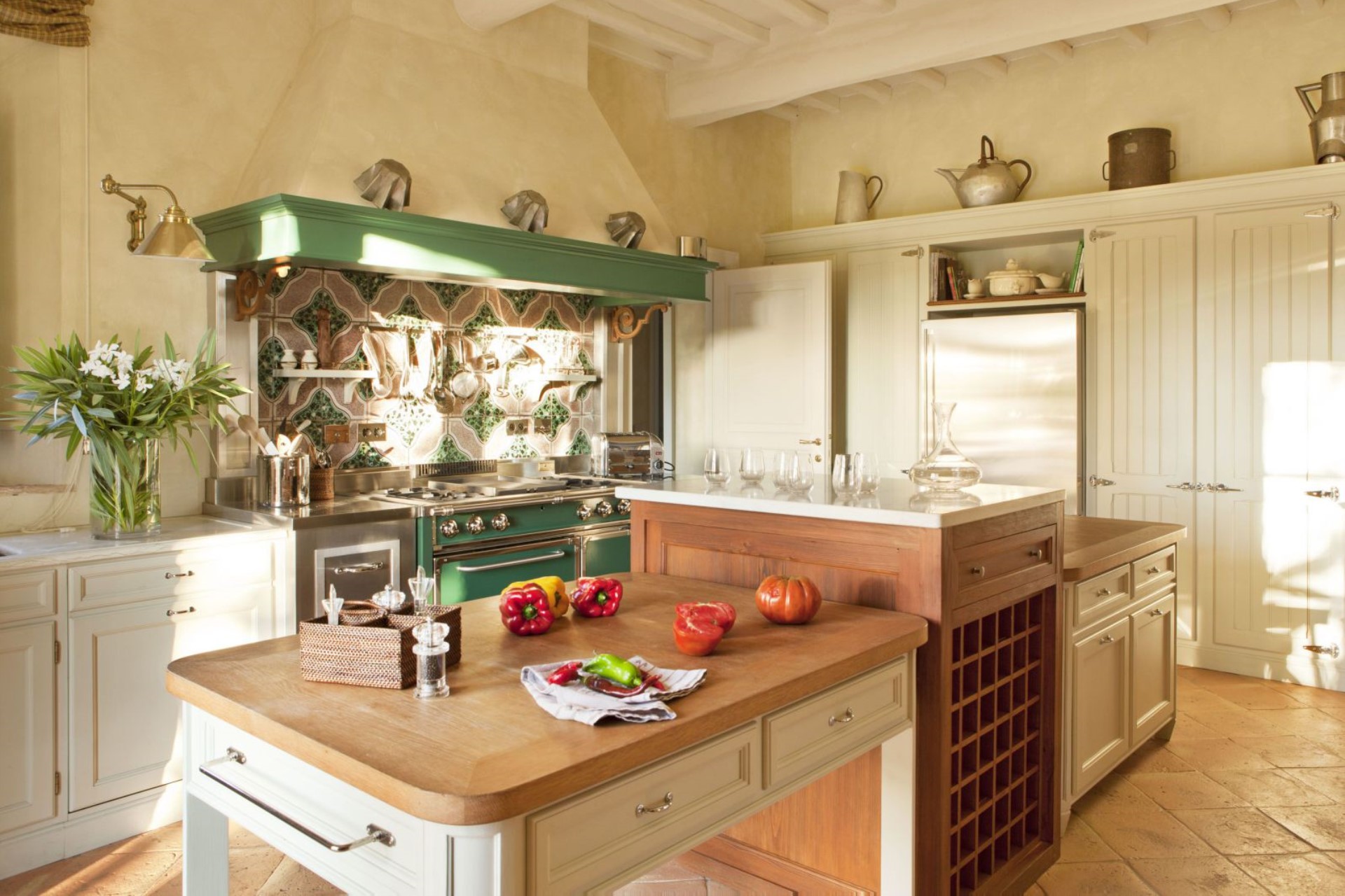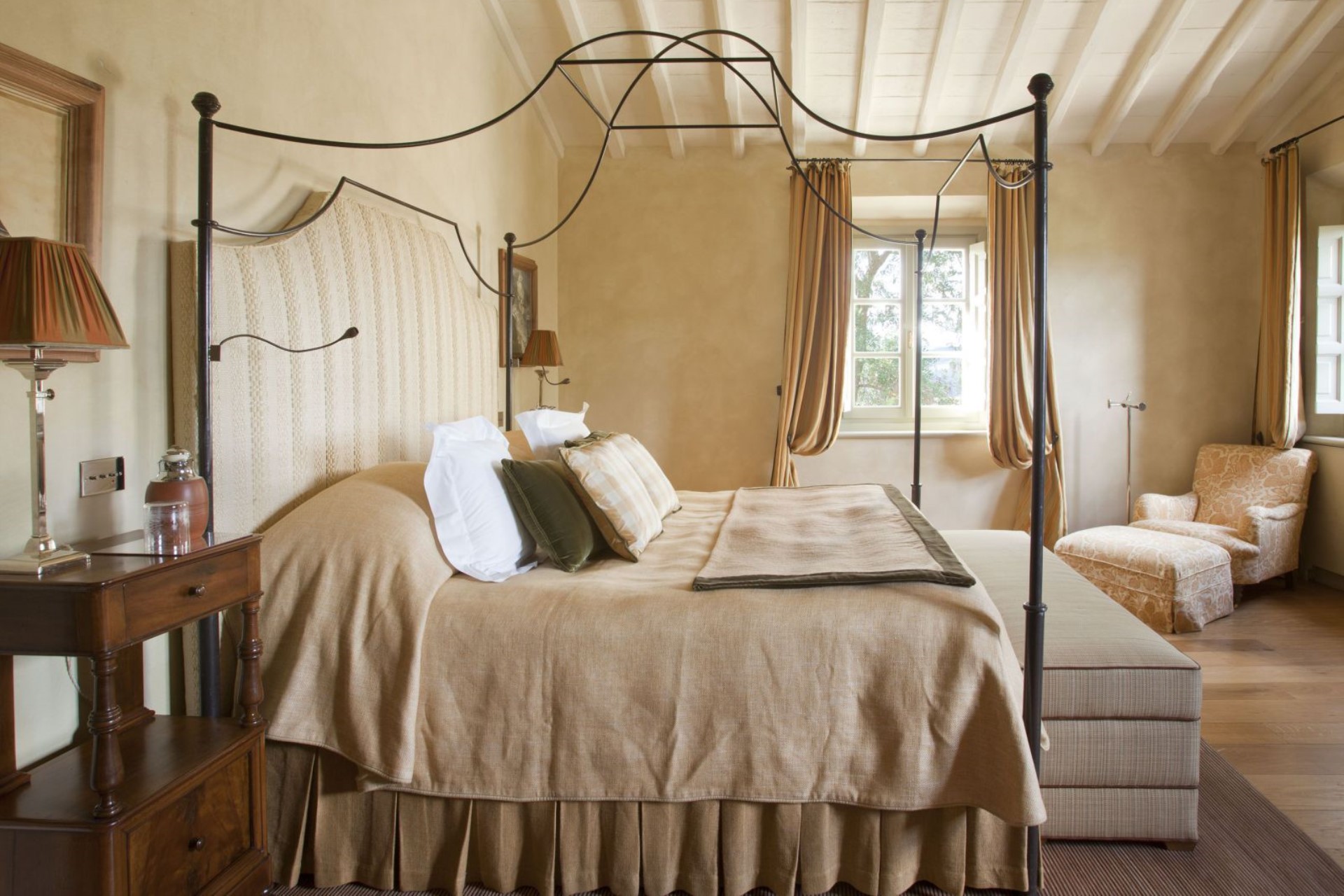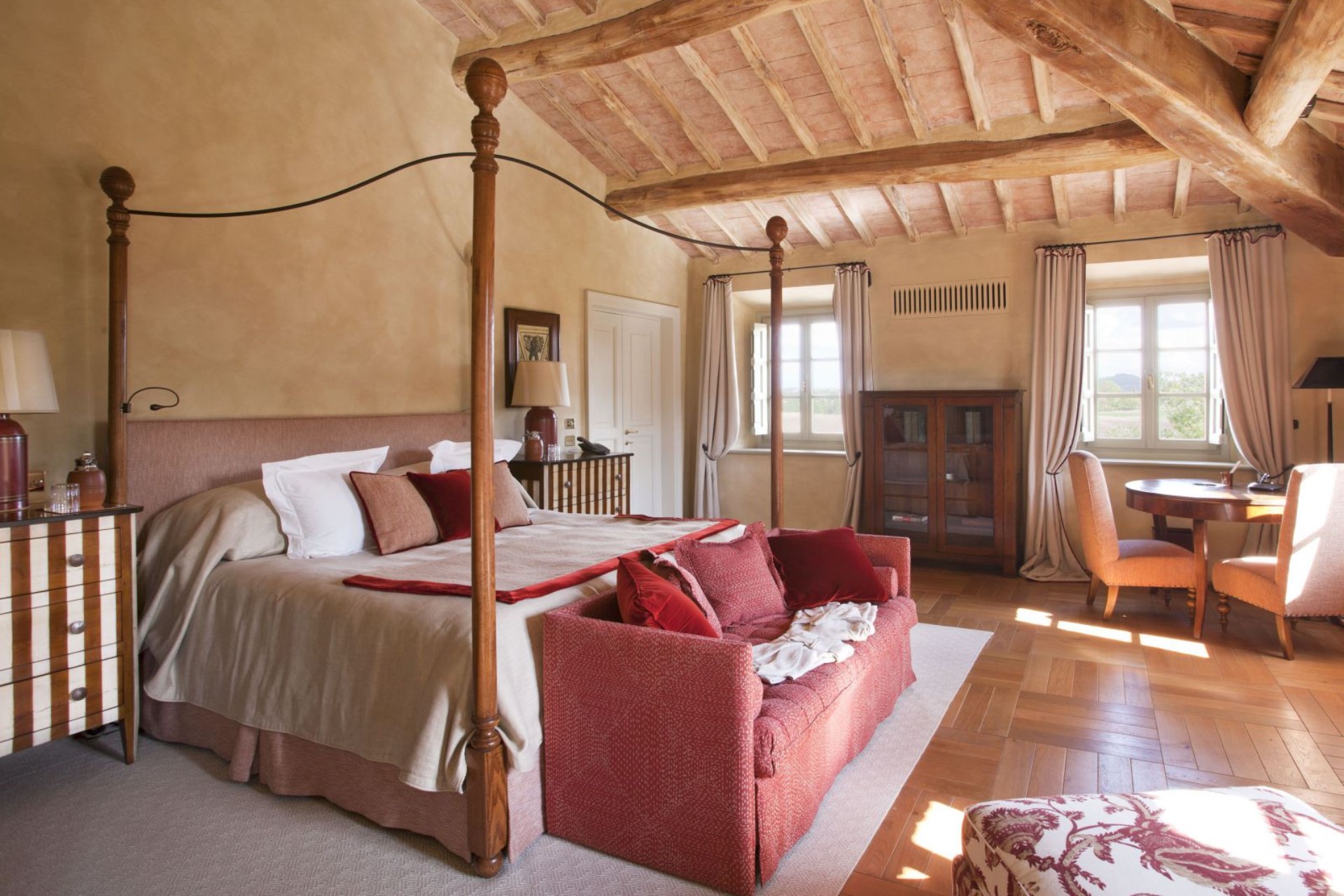 Floor-to-ceiling glass doors lead in from the terrace to the main living room with its comfortable sofas, beamed ceilings, and authentic Tuscan fireplace. Adjoining the living room is the elegant dining room, perfect for enjoying feasts cooked up in the fully-equipped, country-style kitchen.