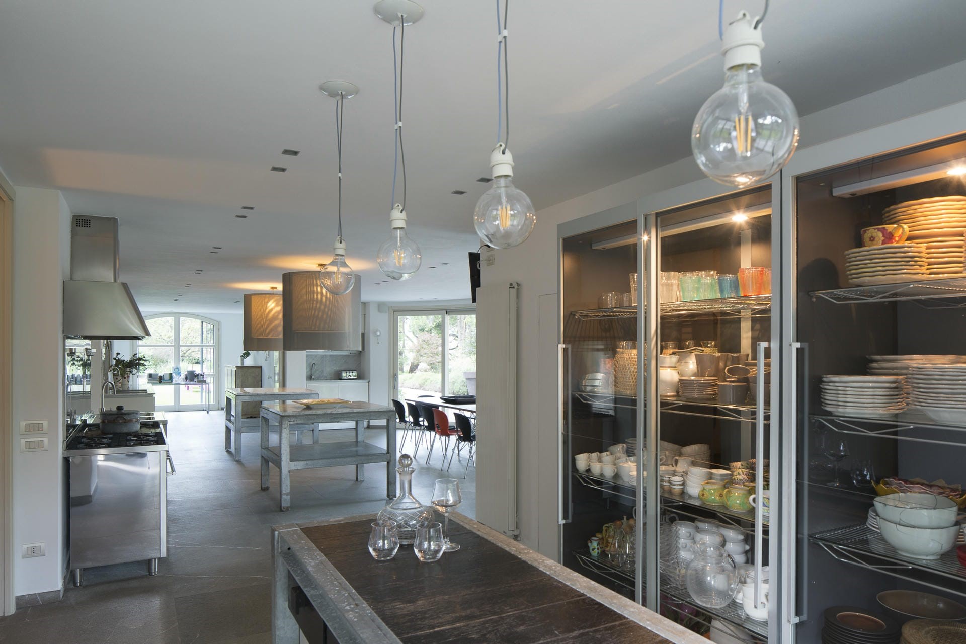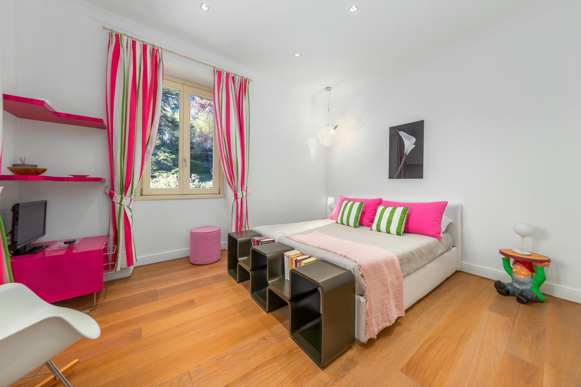 Inside, the villa is spread over four generous floors, offering both communal gathering spaces and quiet corners to retreat to. It features a large formal living room with open views of the lake, as well as a library and a study for quieter moments. The main kitchen is professionally equipped and used by staff, with an additional guest kitchen and kitchenette available for more casual meals or family groups.