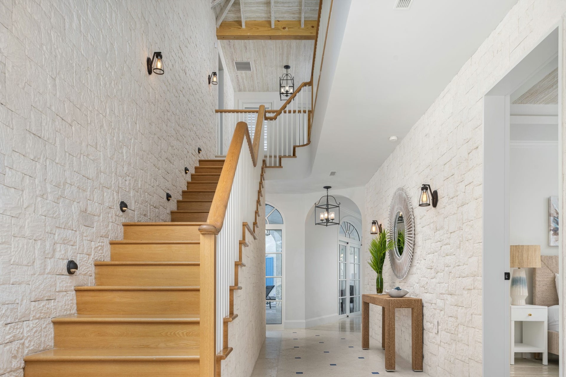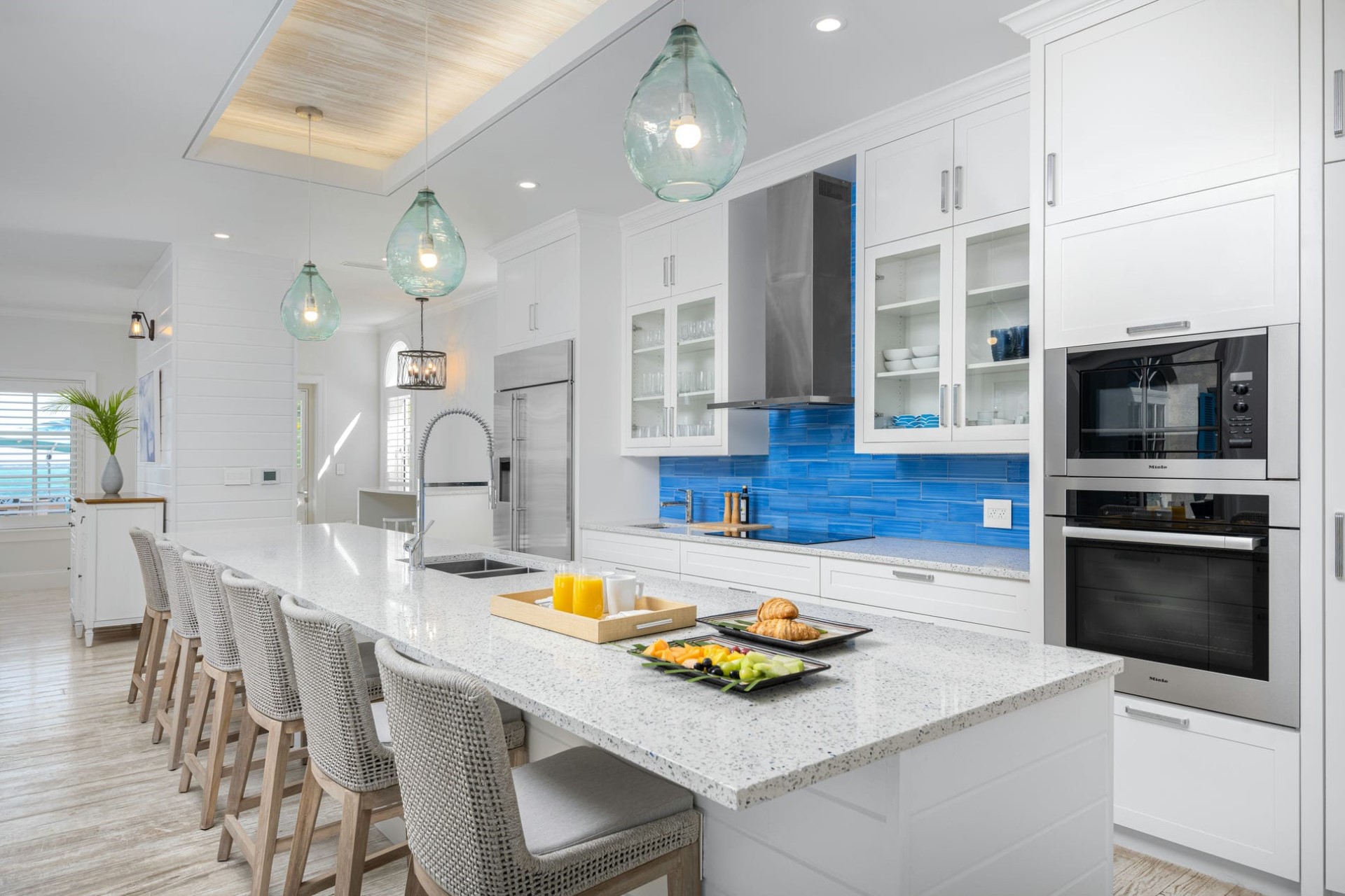 Inside, Villa Azzurra is a blend of modern elegance and comfort, featuring high ceilings and plush sofas in the lounge, which opens directly onto the terrace for a seamless indoor-outdoor flow. The dining area offers both indoor and outdoor seating with bar seating, ocean and garden views, and a smooth transition to the terrace for al fresco meals. The spacious kitchen is designed for both functionality and style, boasting high-end appliances, a large island, a breakfast bar, and a dedicated coffee station. A fully equipped gym provides a private space for wellness, while the villa’s airy layout and thoughtful design ensure a relaxing and luxurious retreat.