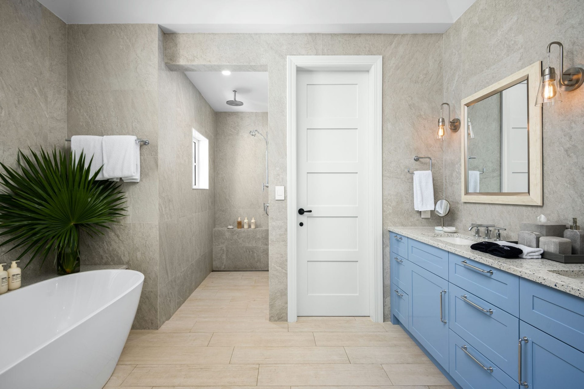 Bedroom 1 – king-size bed, walk-in wardrobe, en-suite bathroom with shower and bathtub, private balcony with ocean views