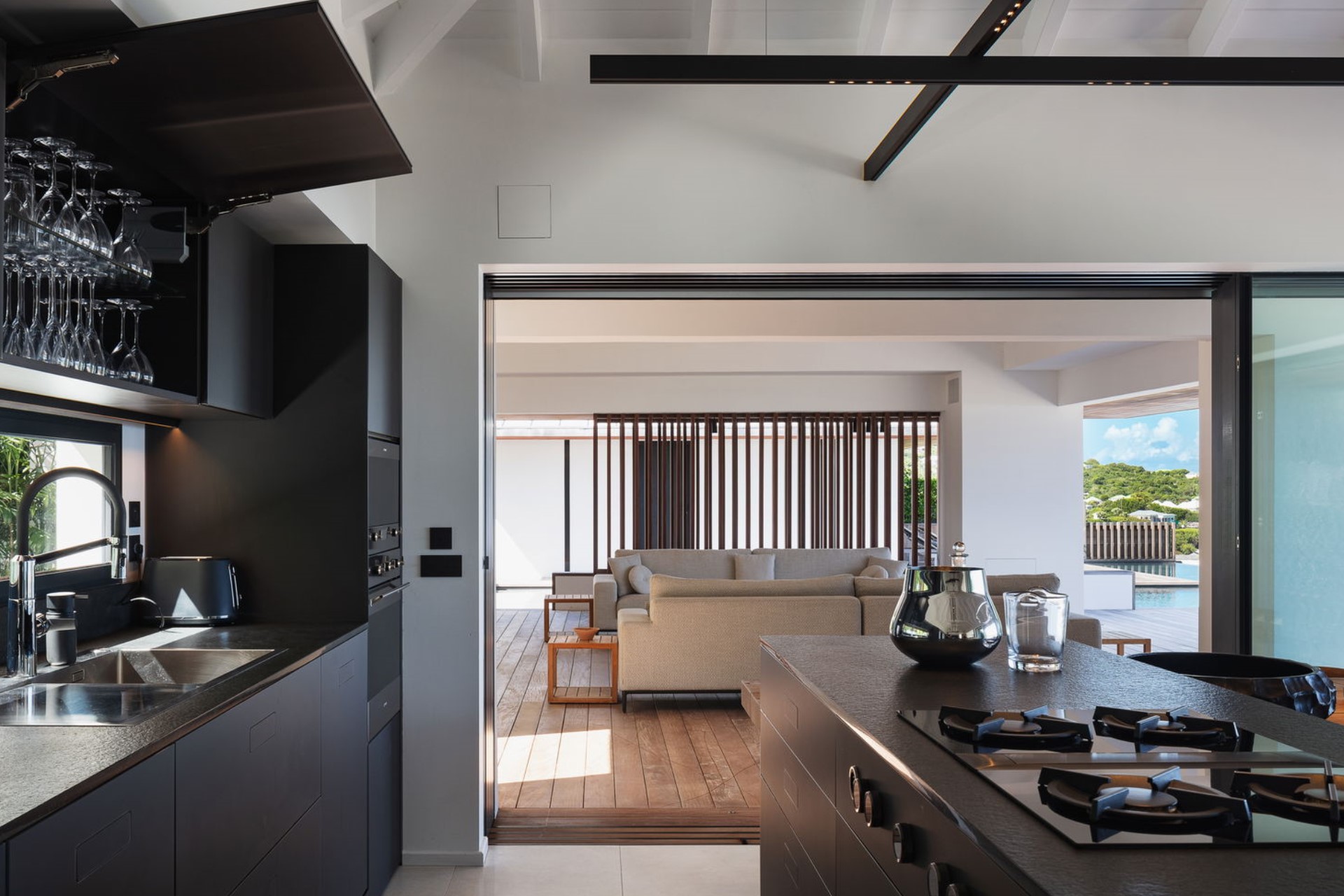 Inside, the villa’s design seamlessly blends indoor and outdoor living. The spacious living room flows directly onto the main terrace, with large glass doors allowing natural light and breezes to fill the space. A modern kitchen is fully equipped with high-end appliances, ensuring a seamless cooking experience for gourmet meals or casual snacks.