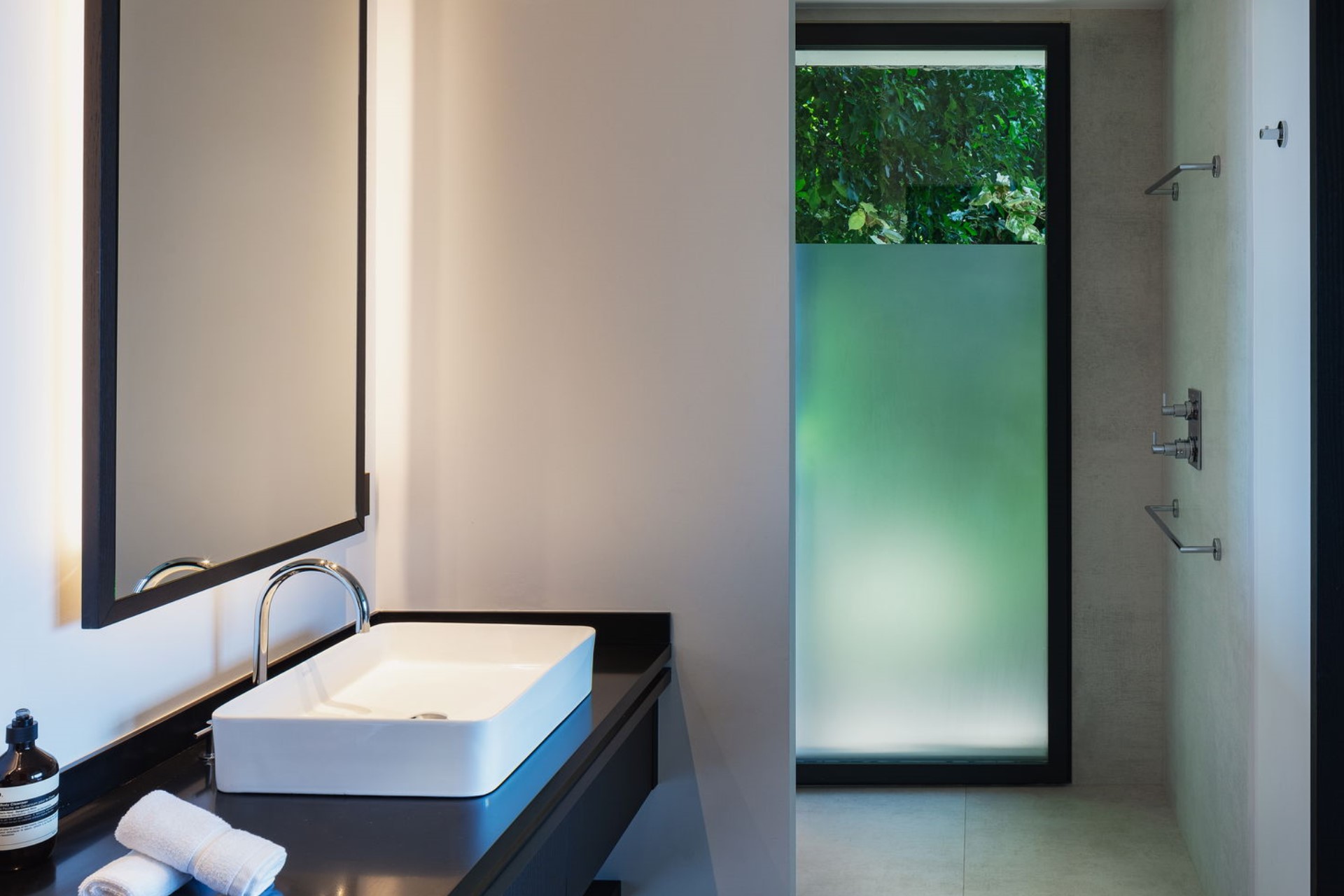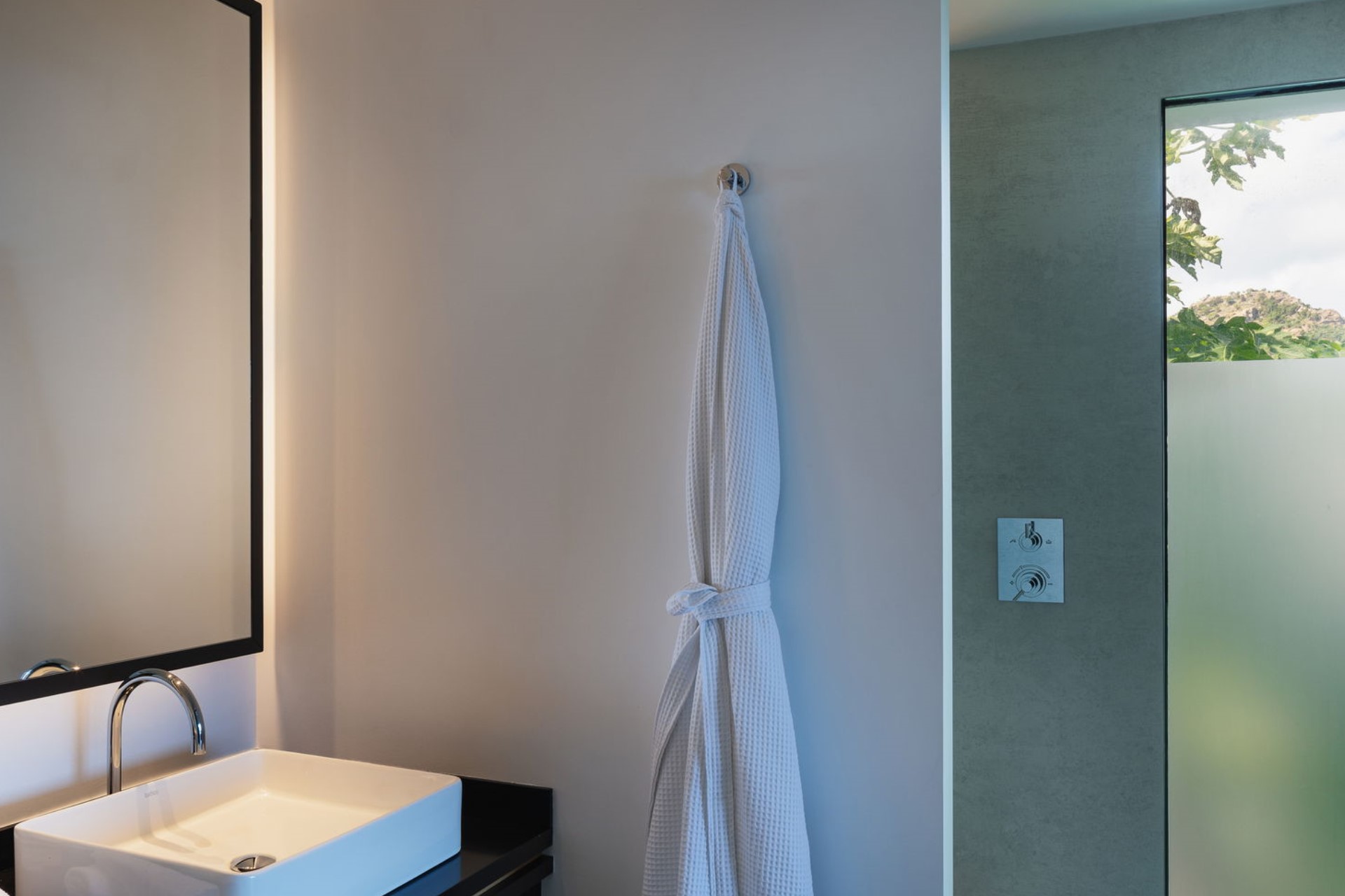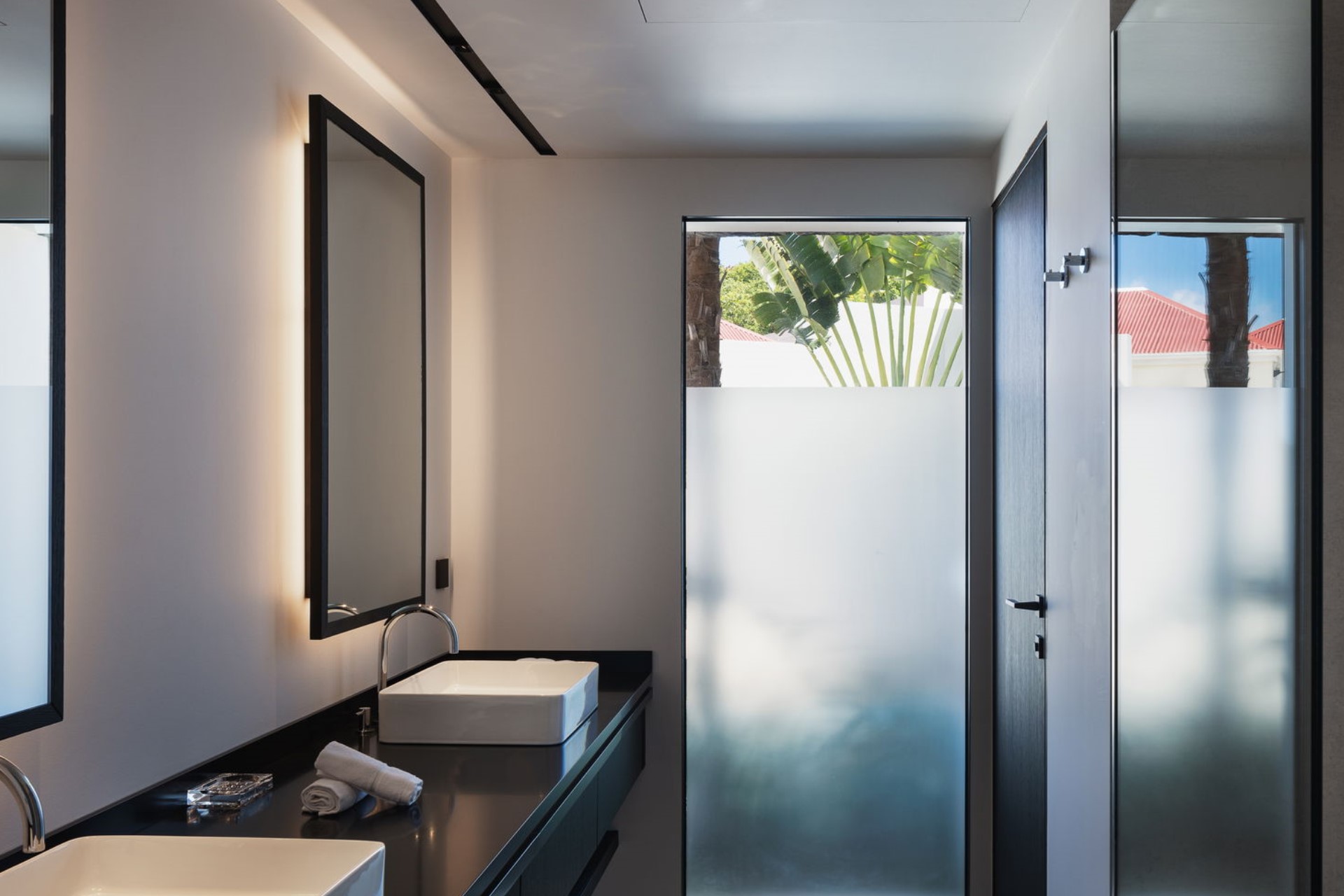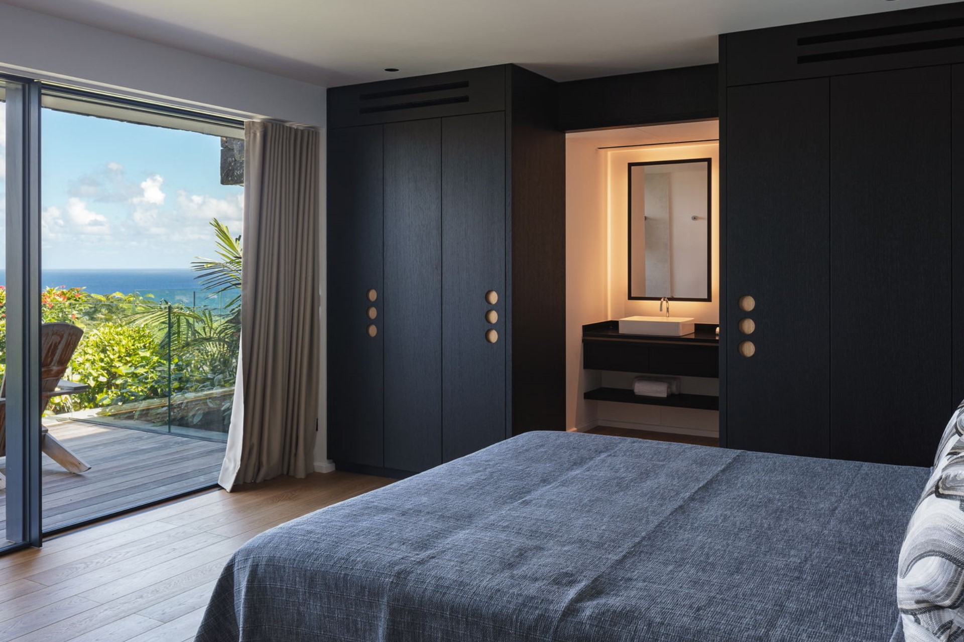 The villa’s four beautifully appointed bedrooms are perfect for a restful night’s sleep. On the main level, two king-size bedrooms feature en-suite bathrooms with showers and direct access to the terrace, offering stunning ocean views. On the lower level, two additional king-size suites provide privacy and comfort, each with en-suite bathrooms featuring double sinks and Italian-style indoor showers. Both rooms open onto their own private terraces, creating serene retreats for guests.