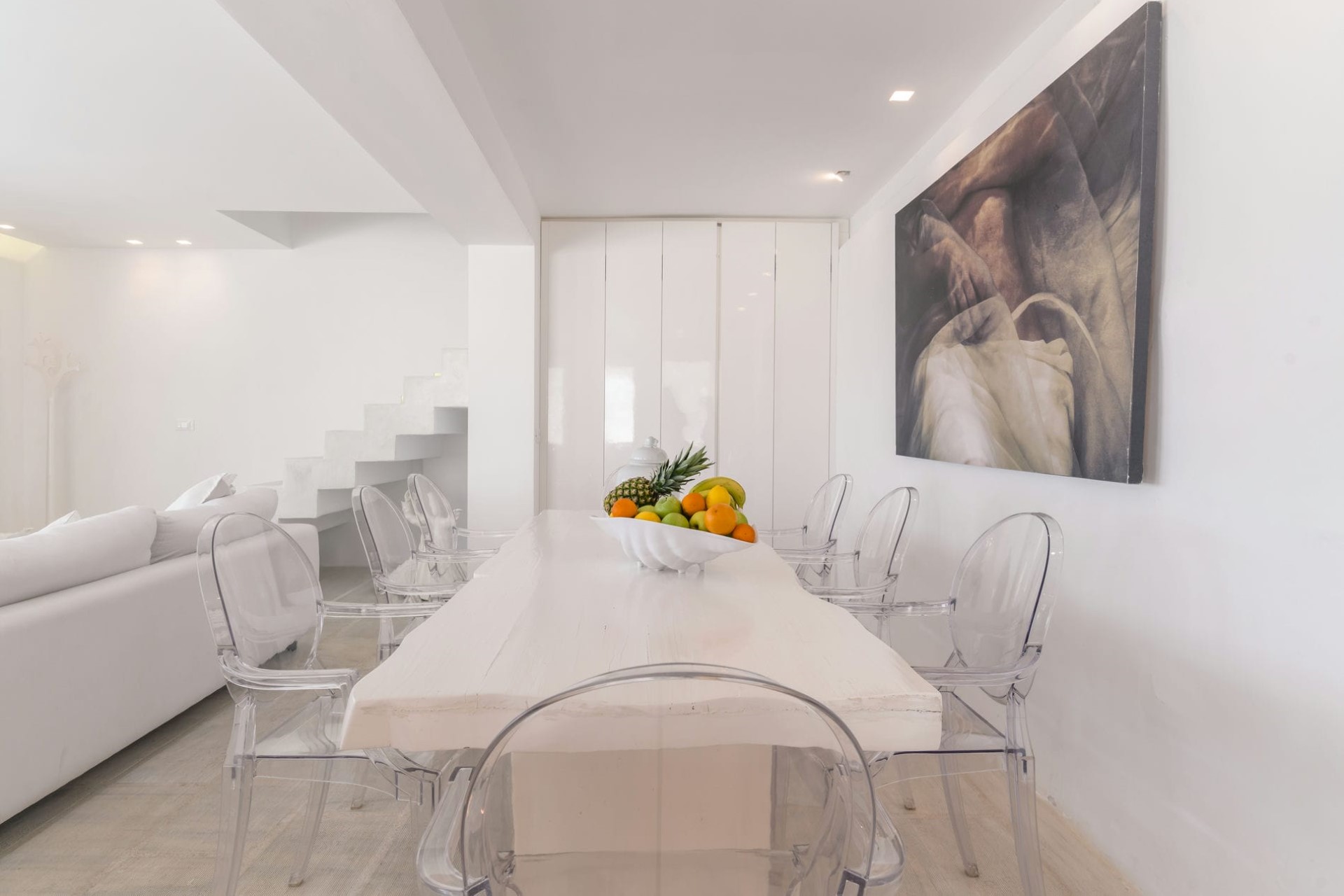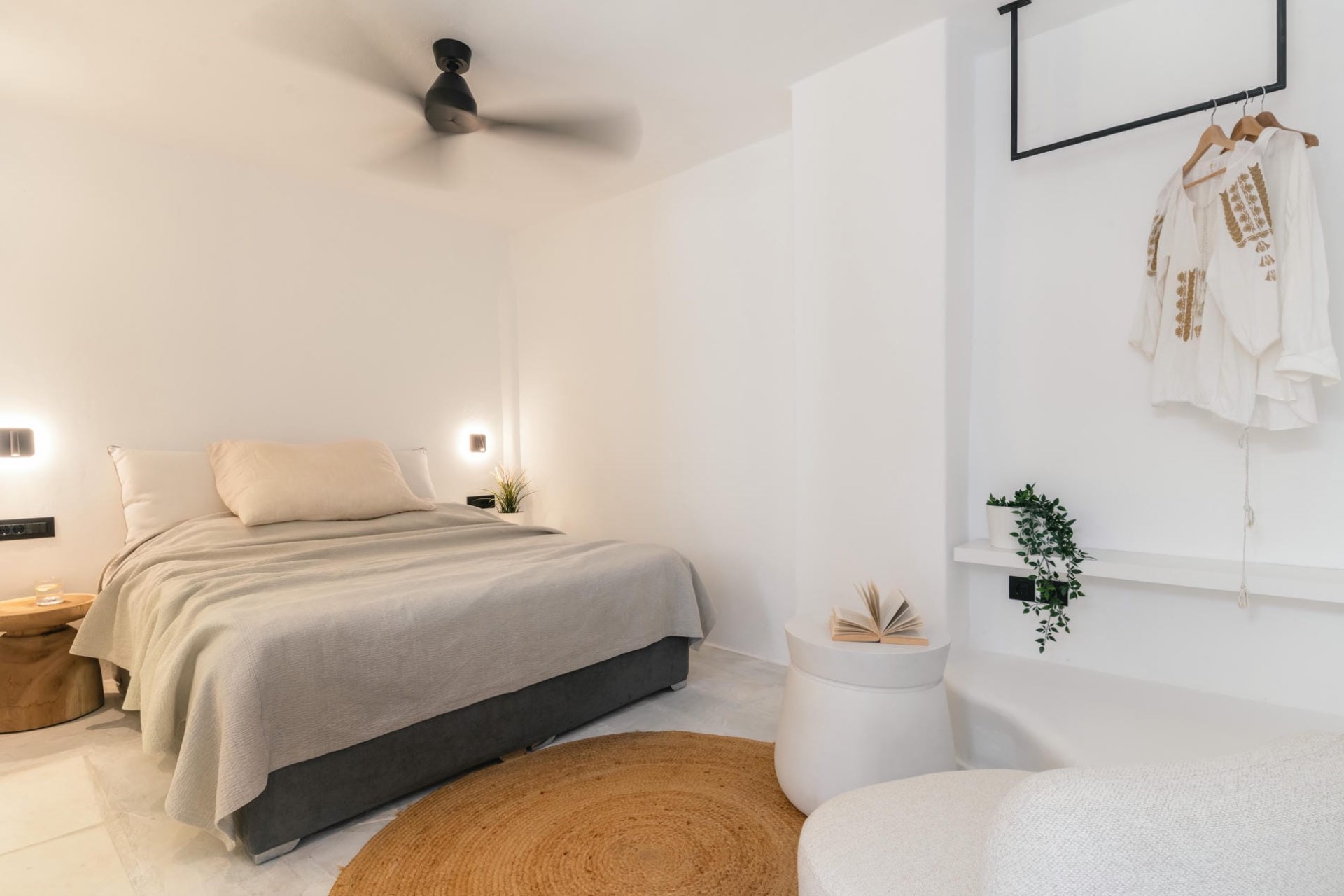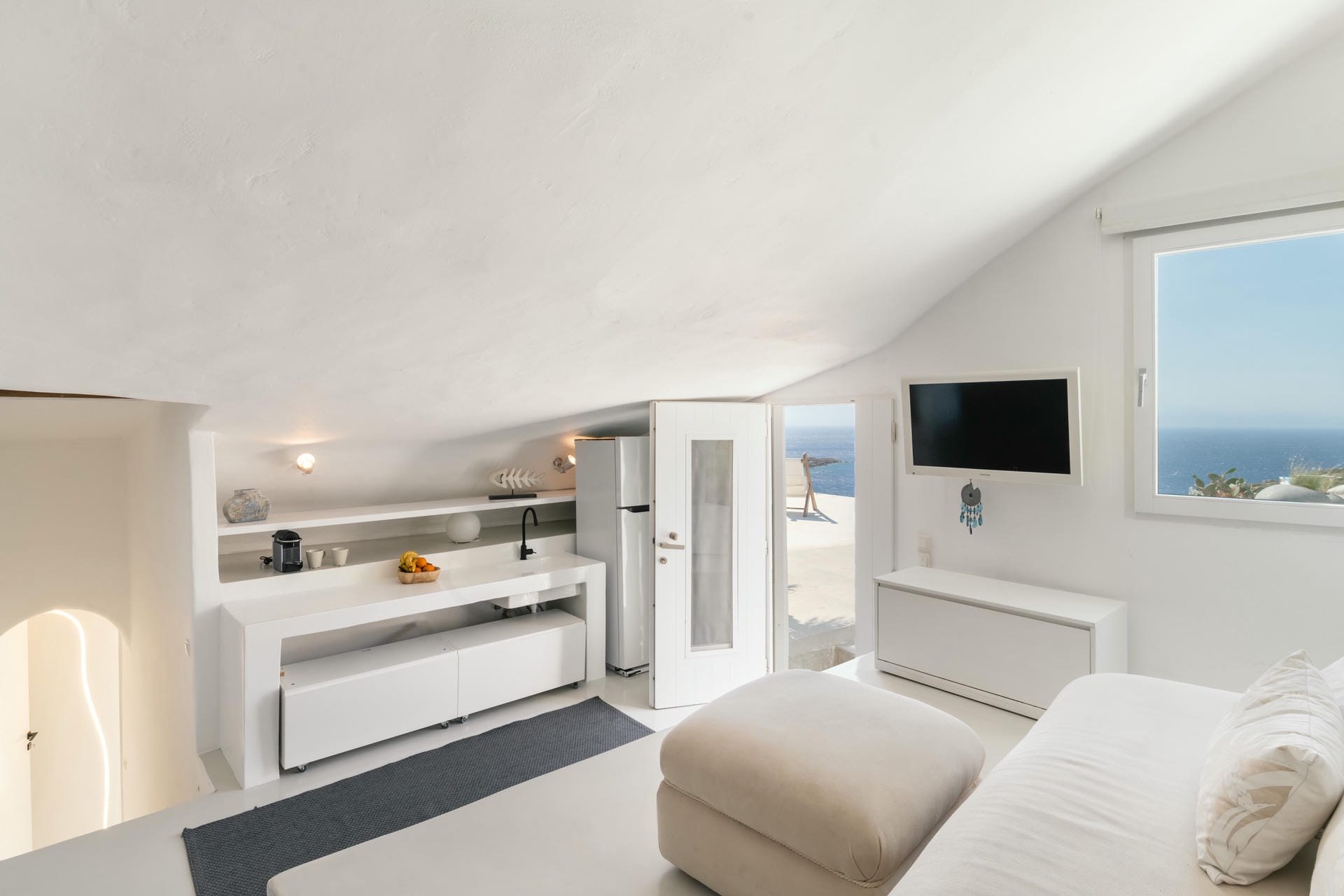 Villa Psarou makes exceptional use of space, with its sleek white architecture and minimalist aesthetic taking cues from classic Mykonian design. The interiors are elegant and light-filled, with modern furnishings and an open-plan kitchen and living area that opens directly onto the terrace—ideal for entertaining or unwinding with family and friends.