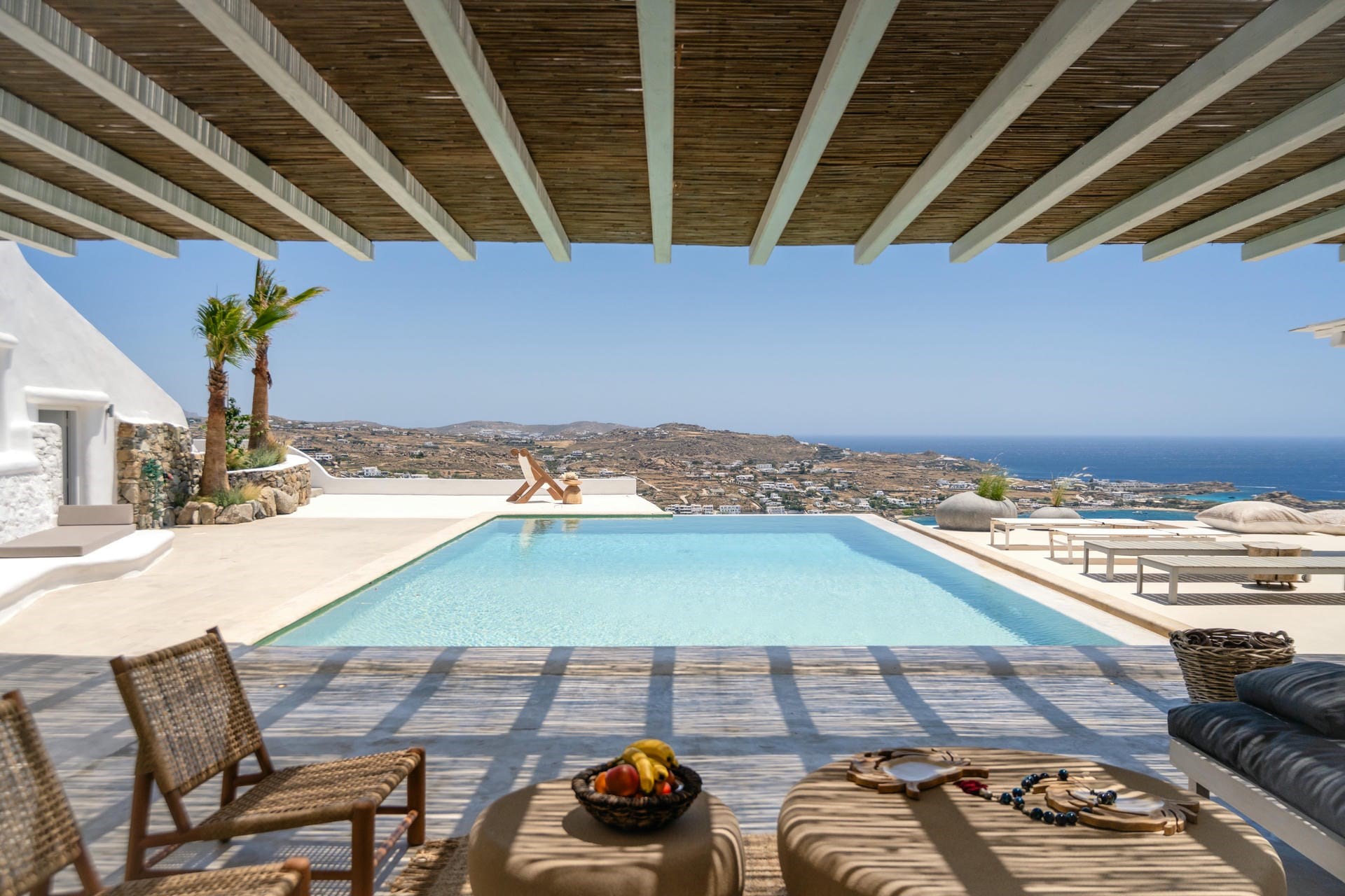 A chic hillside villa with sea views and an infinity pool, near Psarou Beach