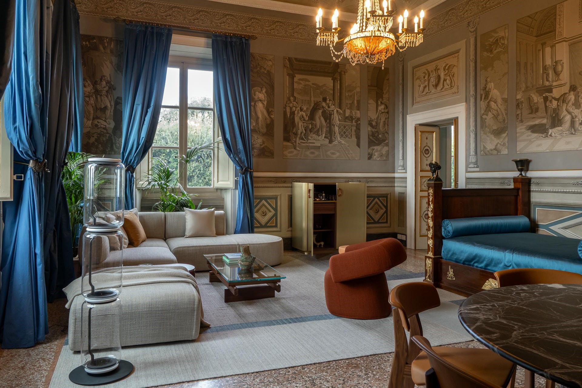 The interiors of the main villa are a fascinating blend of styles, with remnants of Renaissance, Baroque, and Neoclassical elements. Throughout the many living rooms, libraries, and dining rooms, high ceilings, polished marble floors, detailed wall frescoes, and opulent wooden furnishings create a sense of grandiosity. A professional kitchen provides space for the private chef to prepare delicious meals while guests relax in the bar, perhaps sampling a drop from the villa’s wine cellar.