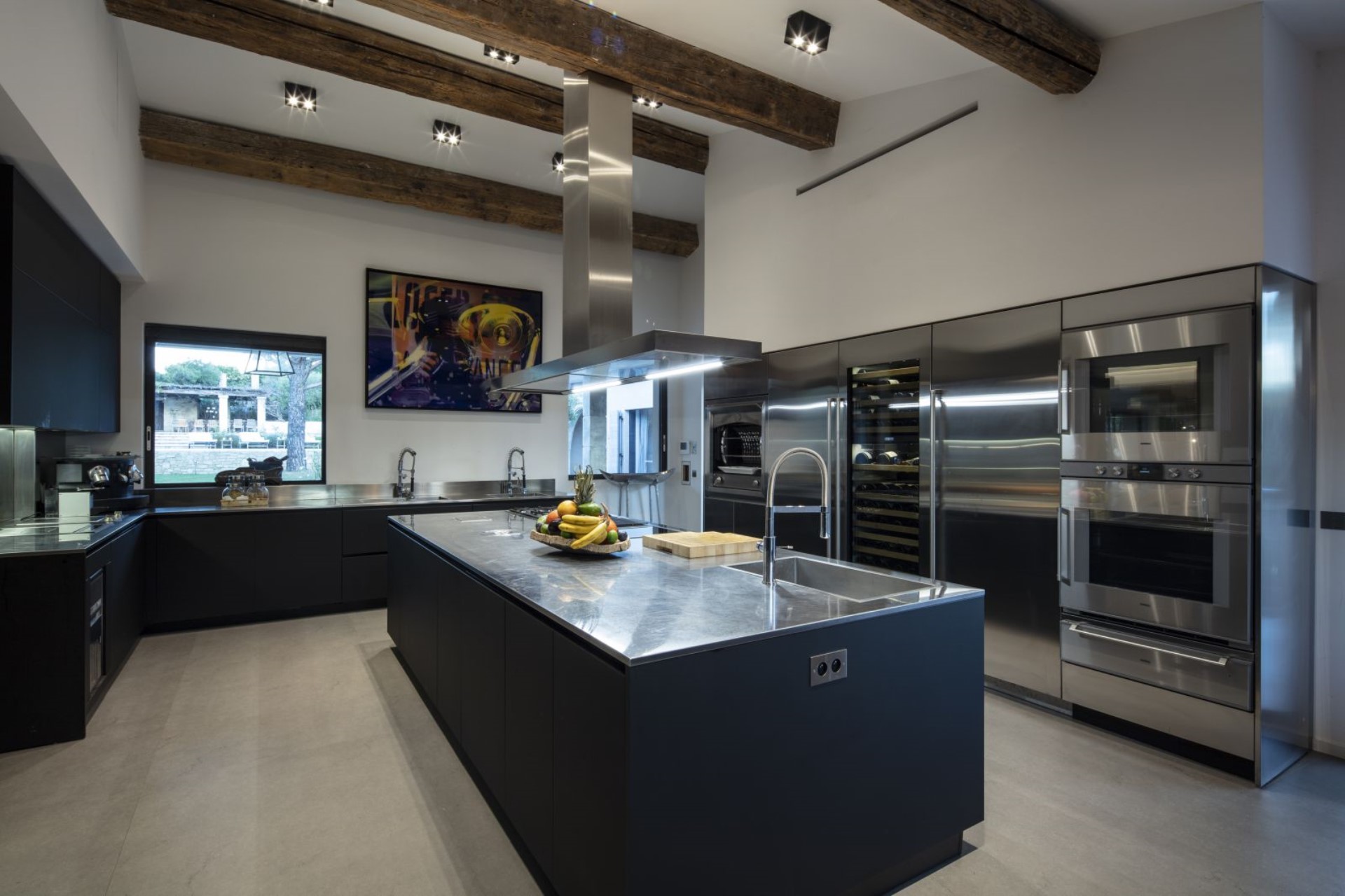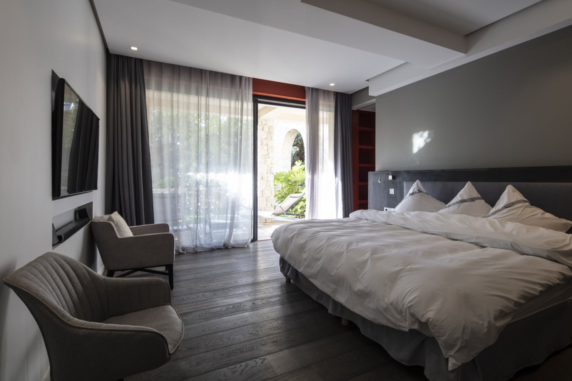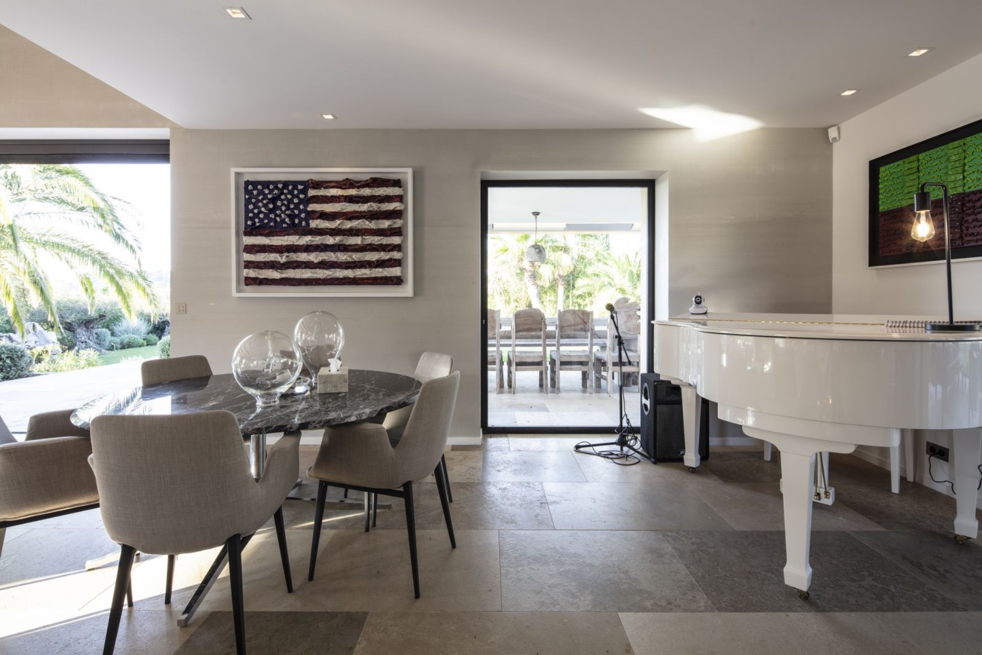 With an open-plan design, natural light floods the villa through large open windows and French doors that lead onto the terrace. There’s a neutral colour palette, with natural accents in the ceiling beams for a traditional feel, blending old and new seamlessly. Sumptuous sofas in the living room are strategically placed create a social atmosphere. Whether guests wish to have a few aperitifs before dinner, catch up on the day, or be a music maestro on the piano, the space is dynamic for multi-purpose use.