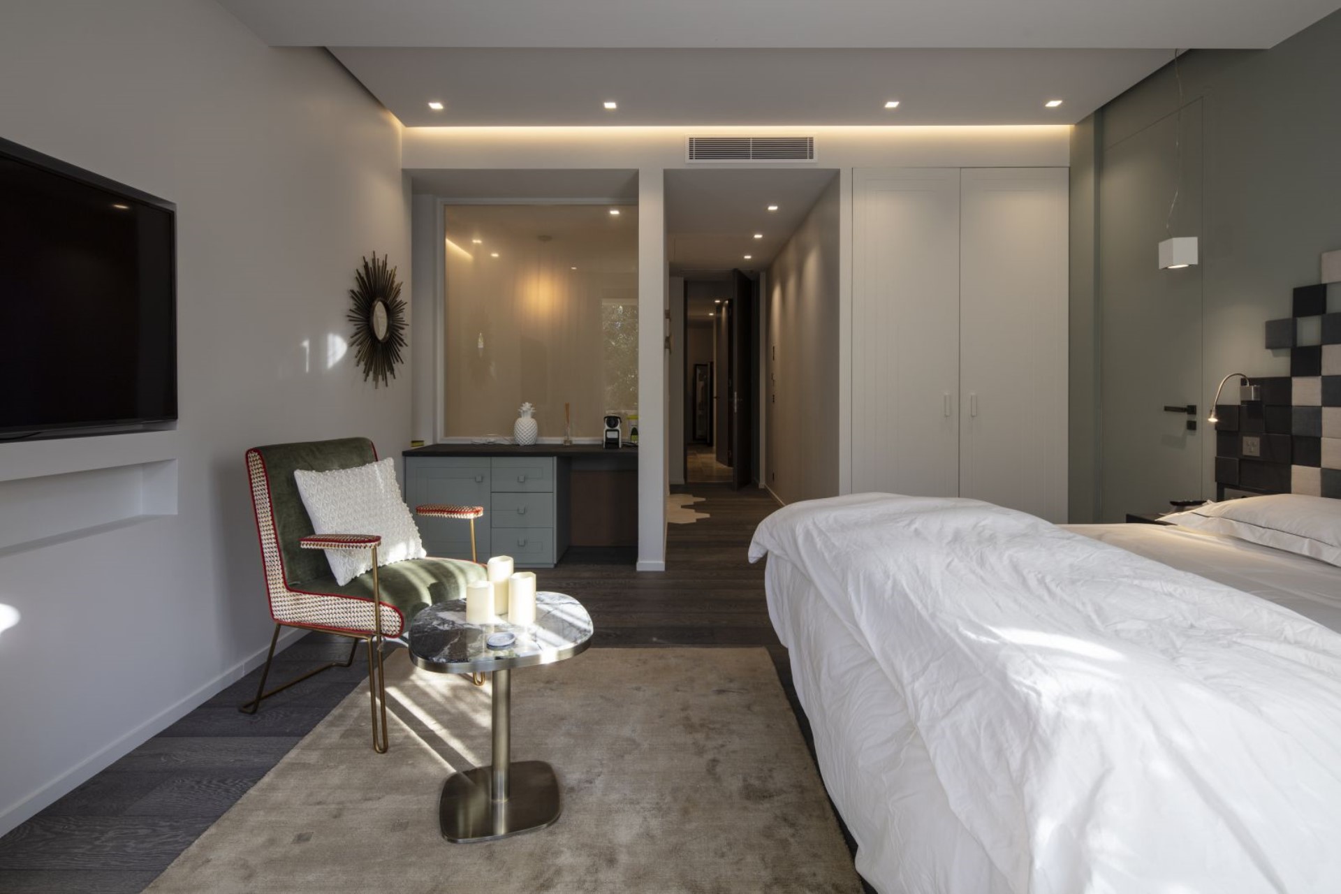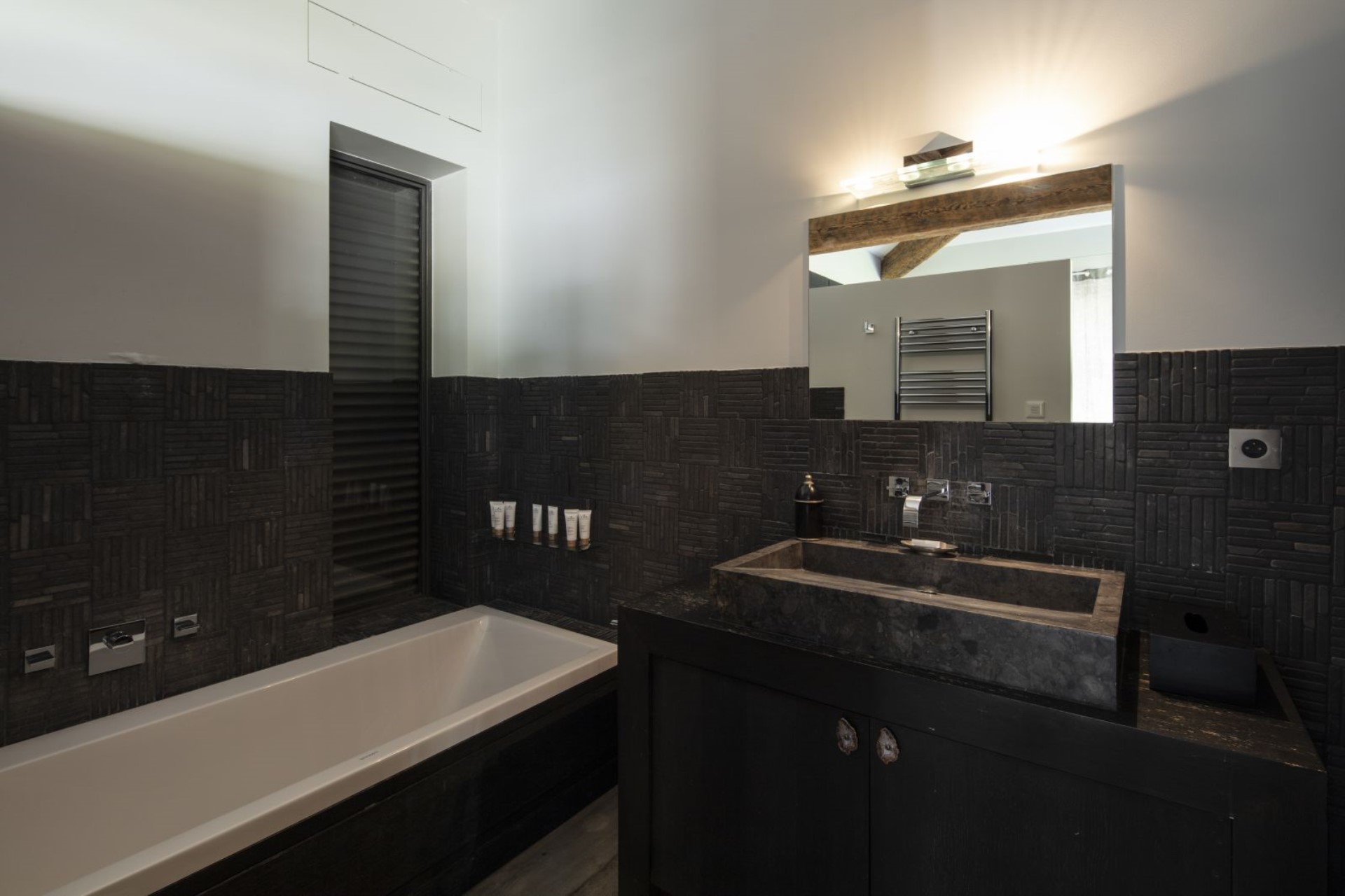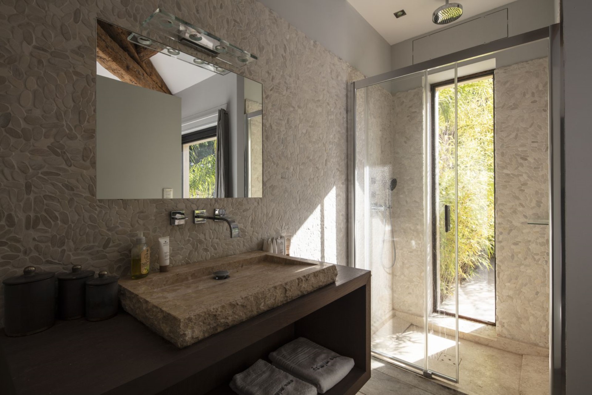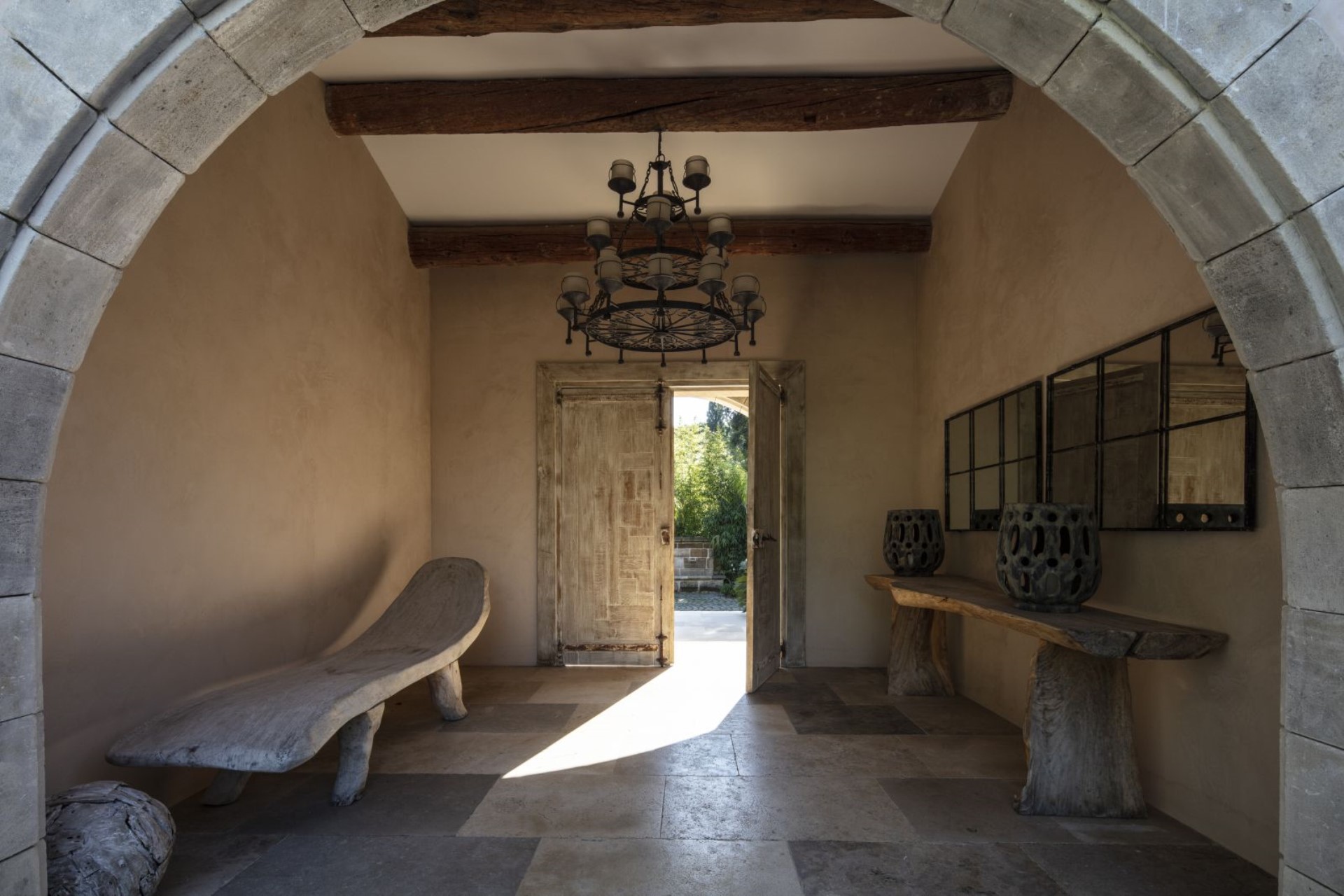 With an open-plan design, natural light floods the villa through large open windows and French doors that lead onto the terrace. There’s a neutral colour palette, with natural accents in the ceiling beams for a traditional feel, blending old and new seamlessly. Sumptuous sofas in the living room are strategically placed create a social atmosphere. Whether guests wish to have a few aperitifs before dinner, catch up on the day, or be a music maestro on the piano, the space is dynamic for multi-purpose use.