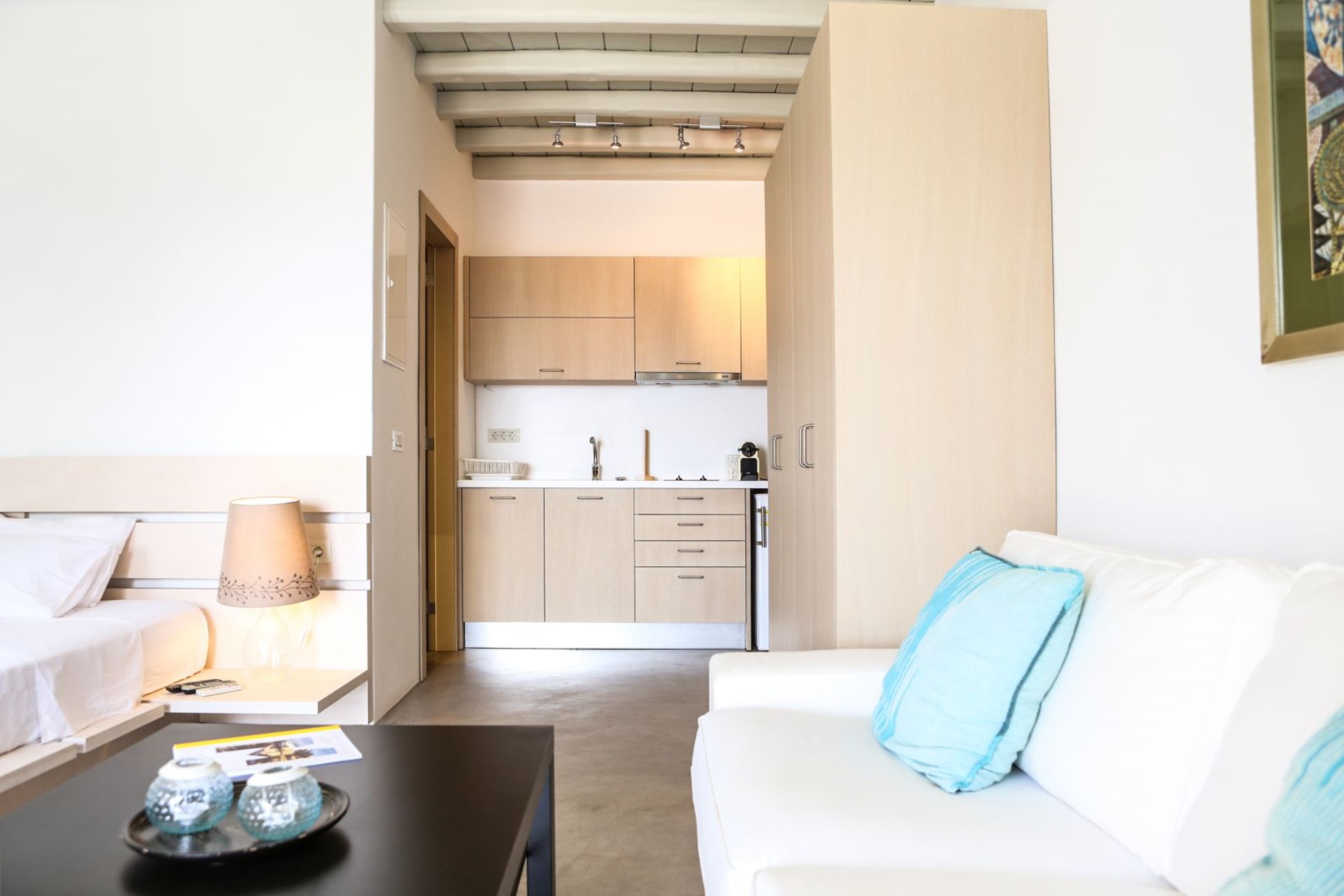 Bedroom 6 – double bed, sofa, small kitchen, bathroom with shower, direct pool & garden access, and sea views