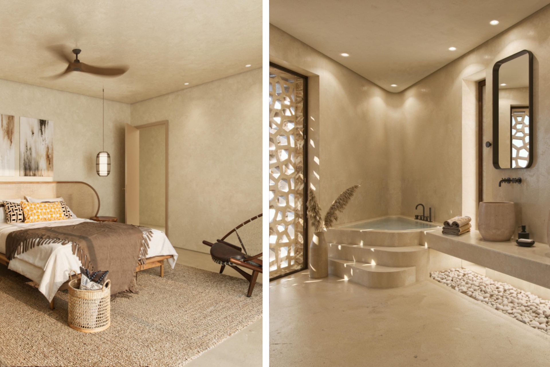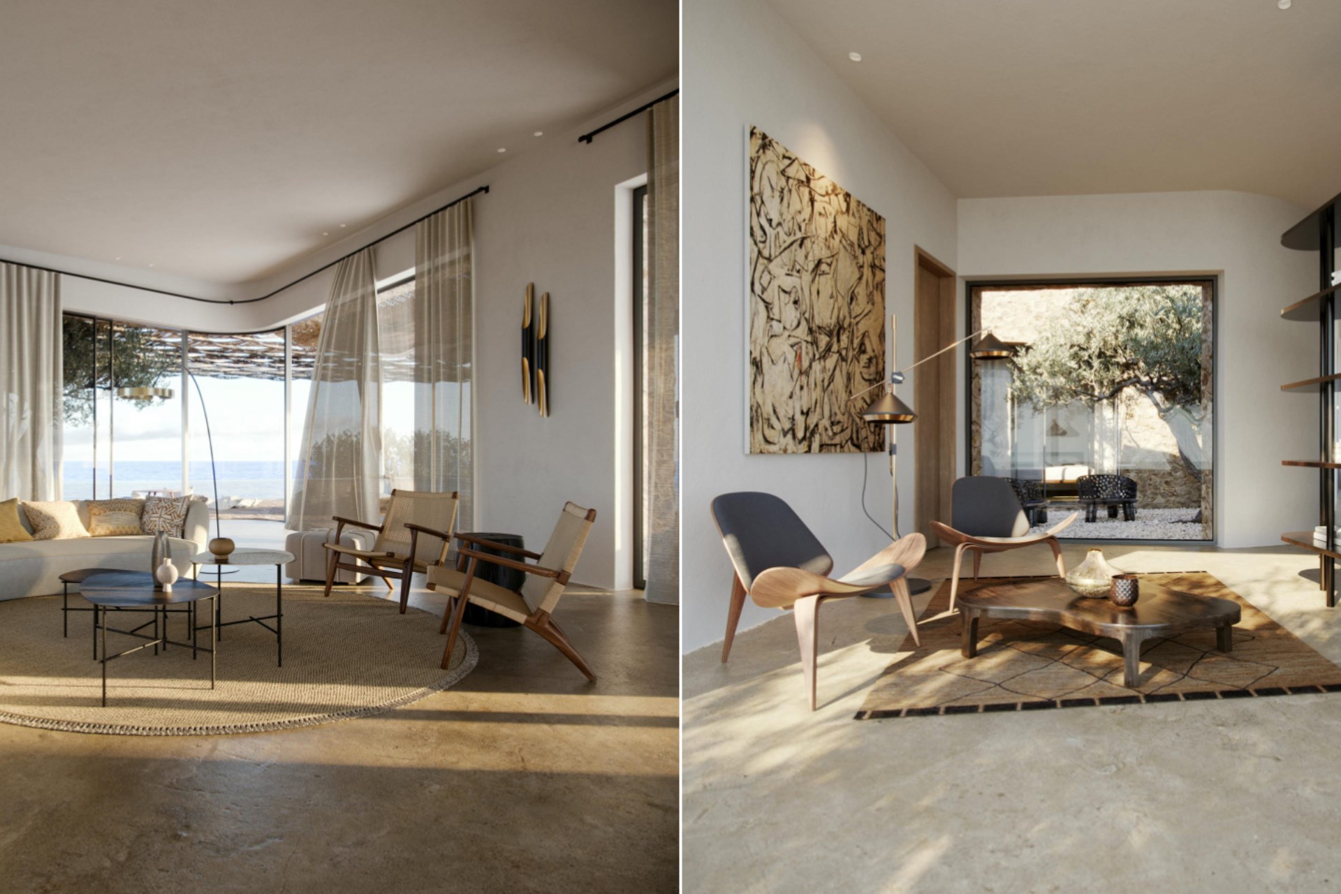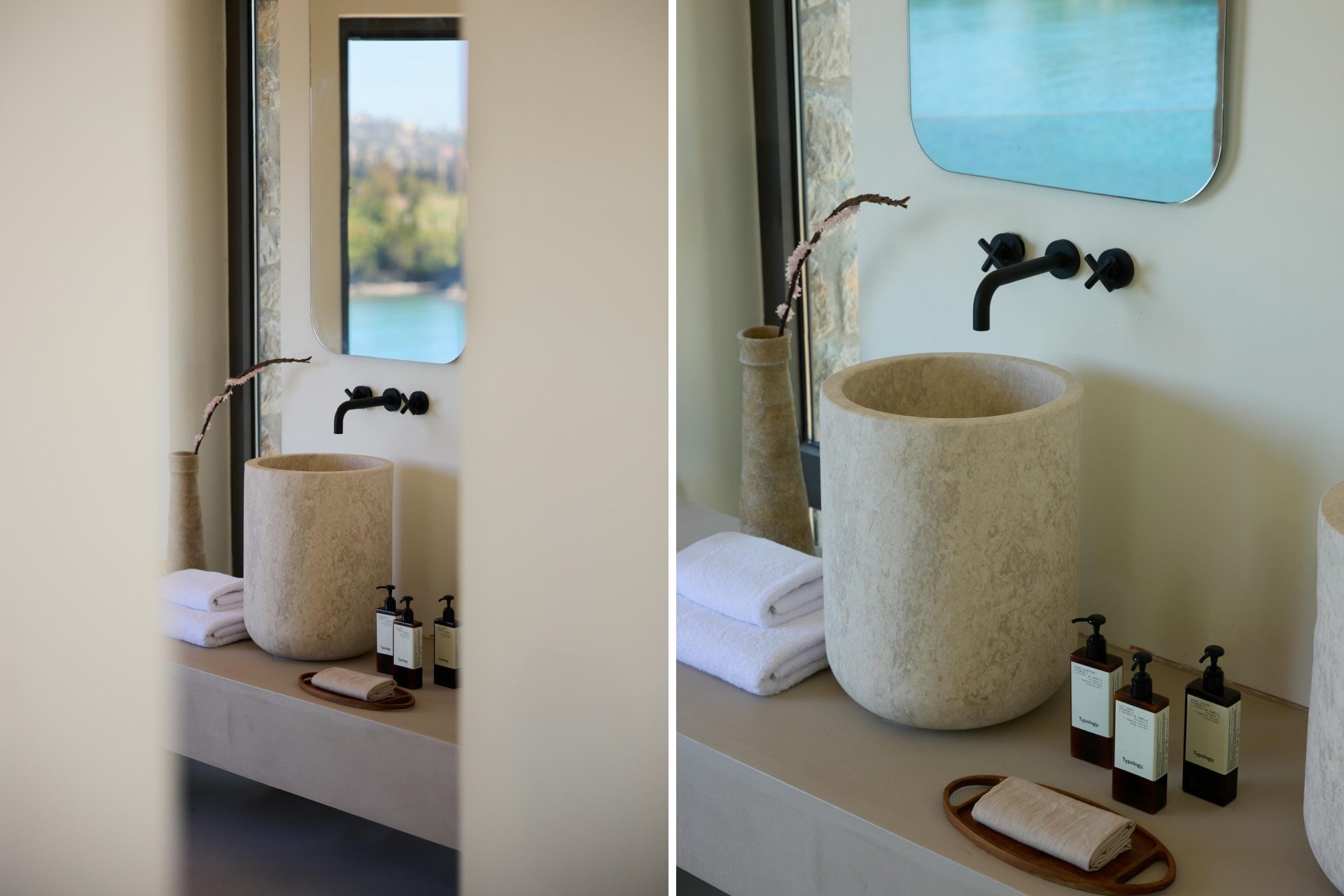 There are eight en-suite bedrooms in total, with four in each villa. The master suite in the North Villa includes a walk-in wardrobe, a sea-view terrace, and a marble bathroom with a freestanding tub. The South Villa’s master spans the entire top floor, with a luxurious bathtub and private roof terrace looking directly over the beach. All the other rooms offer beautiful views of the sea and landscaped gardens, and each has direct access to the outdoors. Every room is spacious, calm, and minimally styled, with a focus on comfort and natural light.