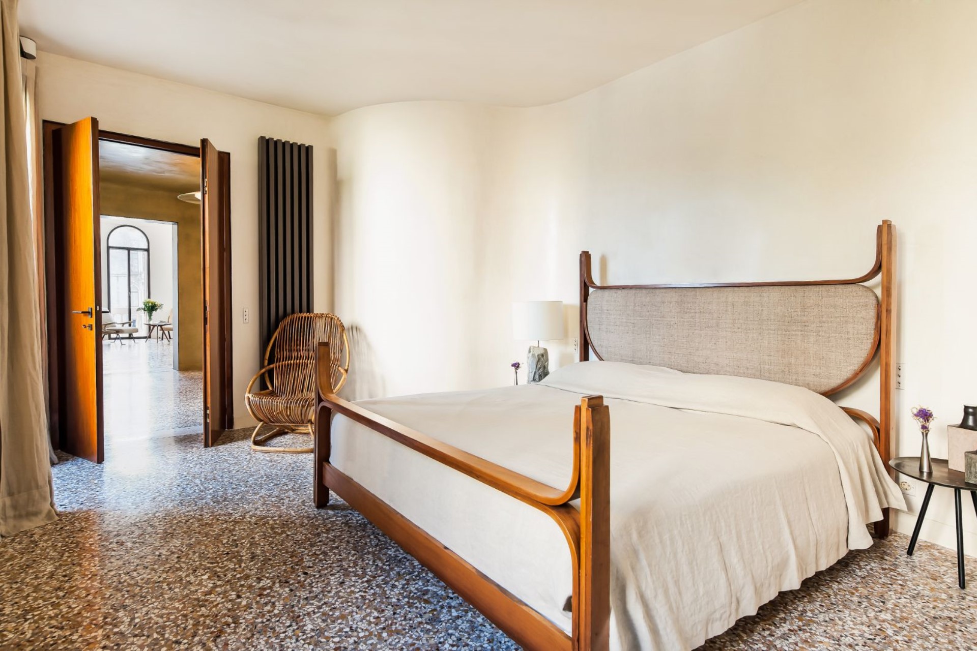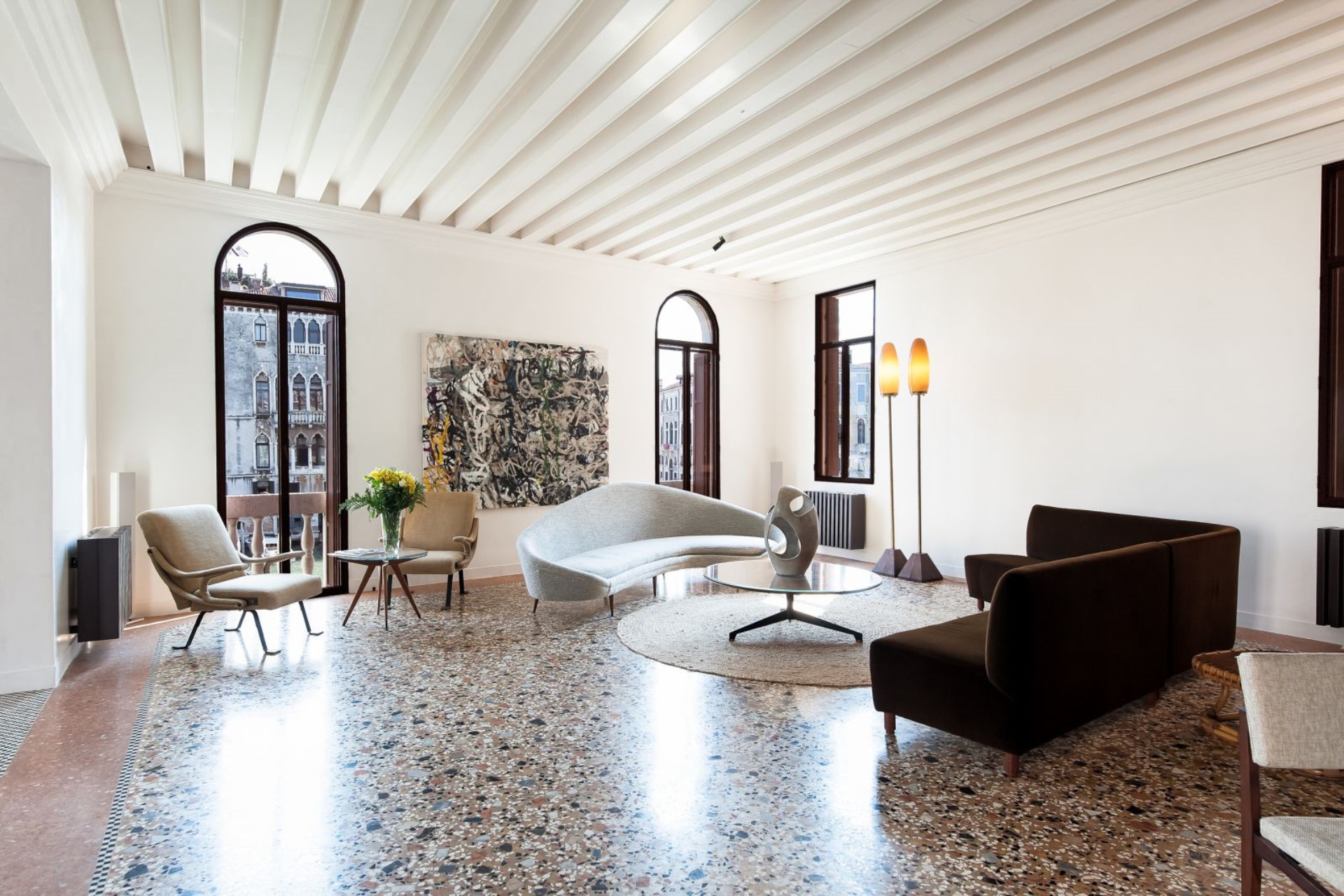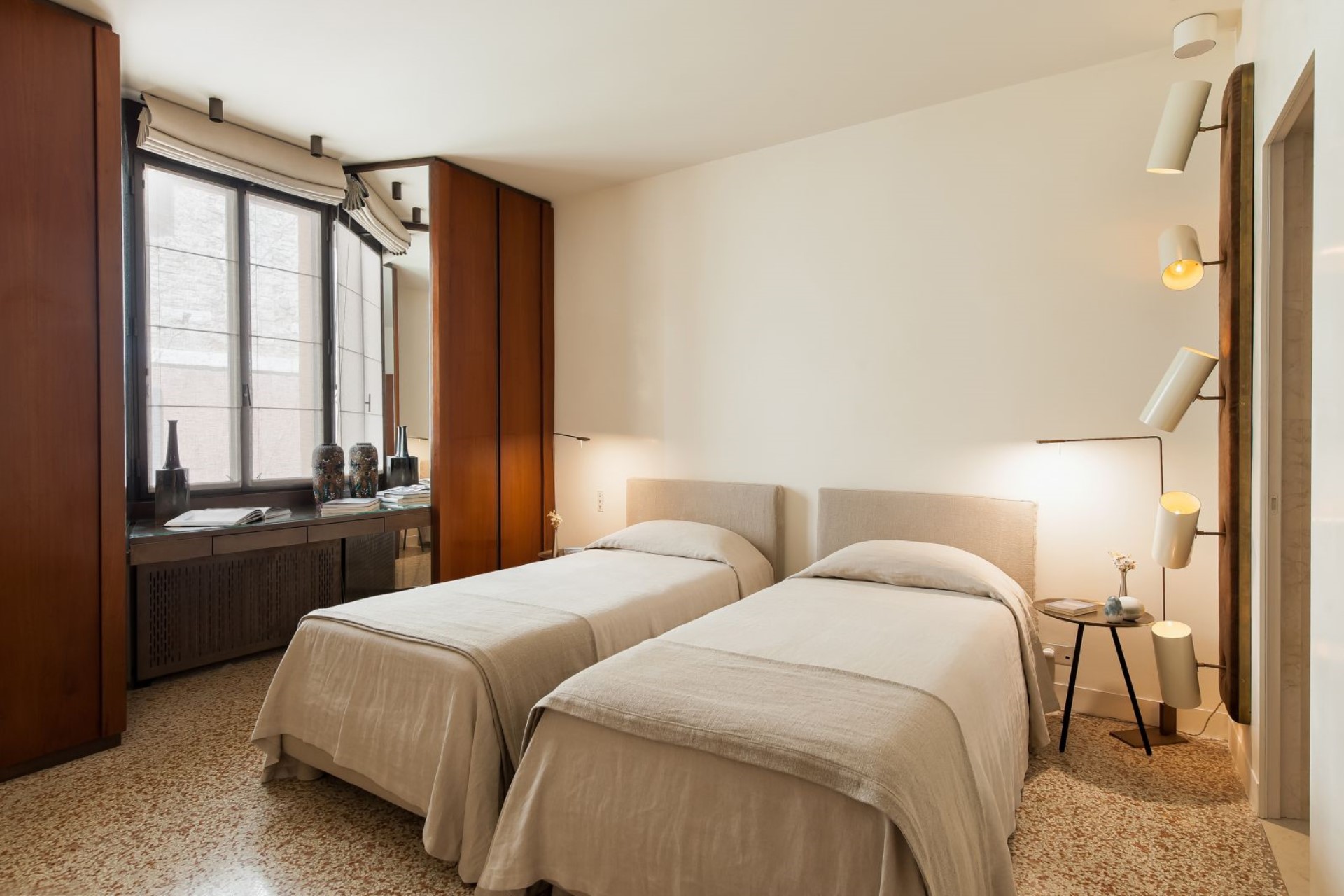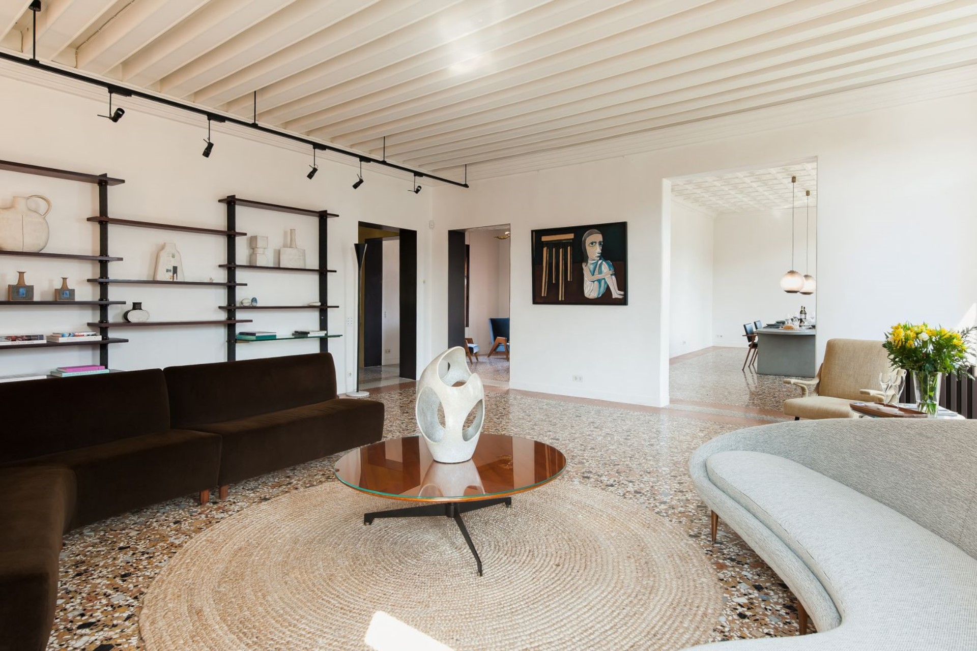 The apartment has been masterfully designed and decorated by one of Venice’s leading architects, in collaboration with one of France’s leading interior decorators, drawing inspiration from the work of Carlo Scarpa. Its elegant features include terrazzo floors, creamy Marmorino walls, bronze windows, and stunning marble bathrooms.