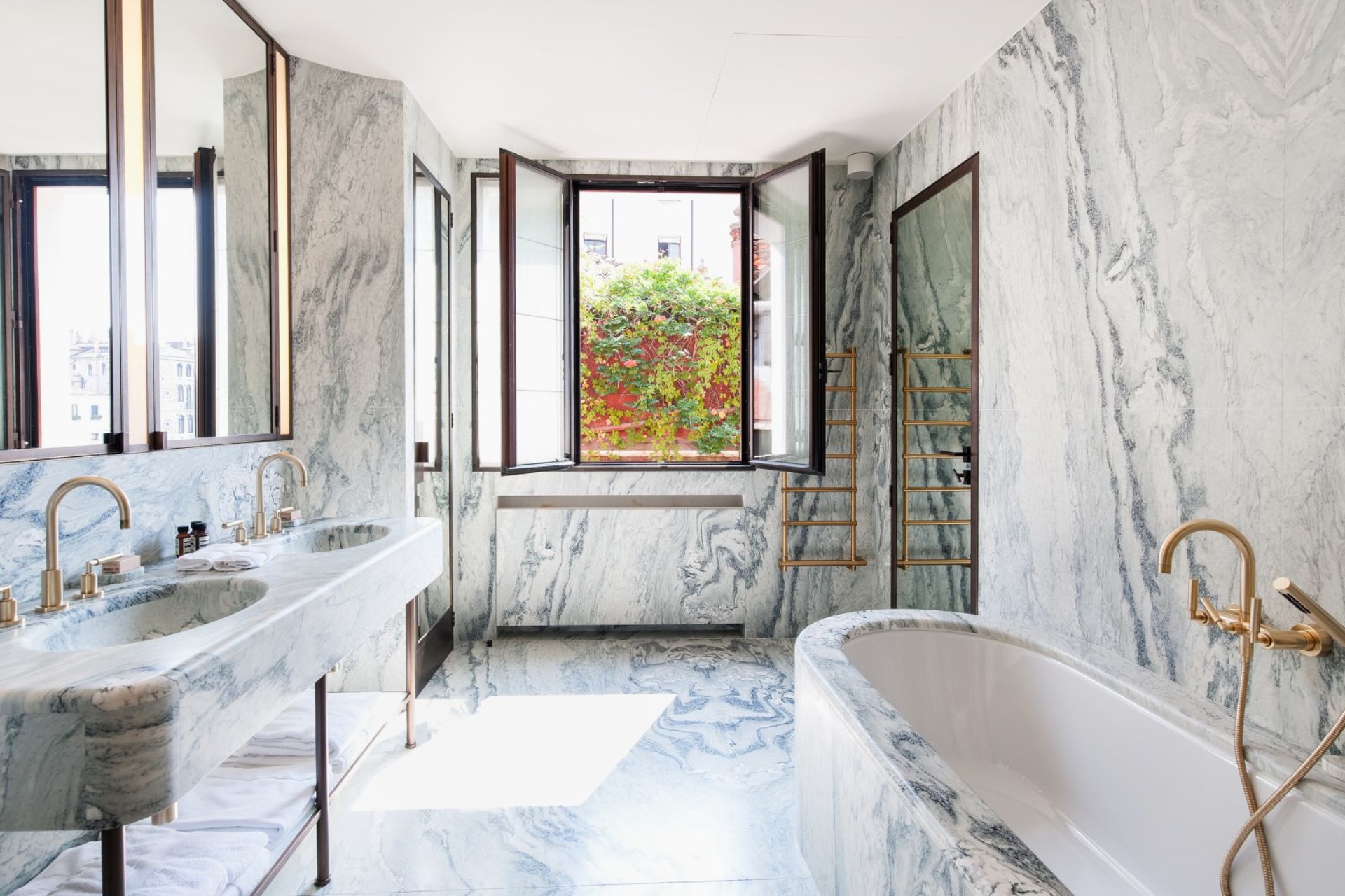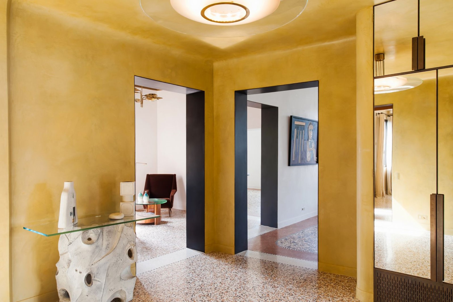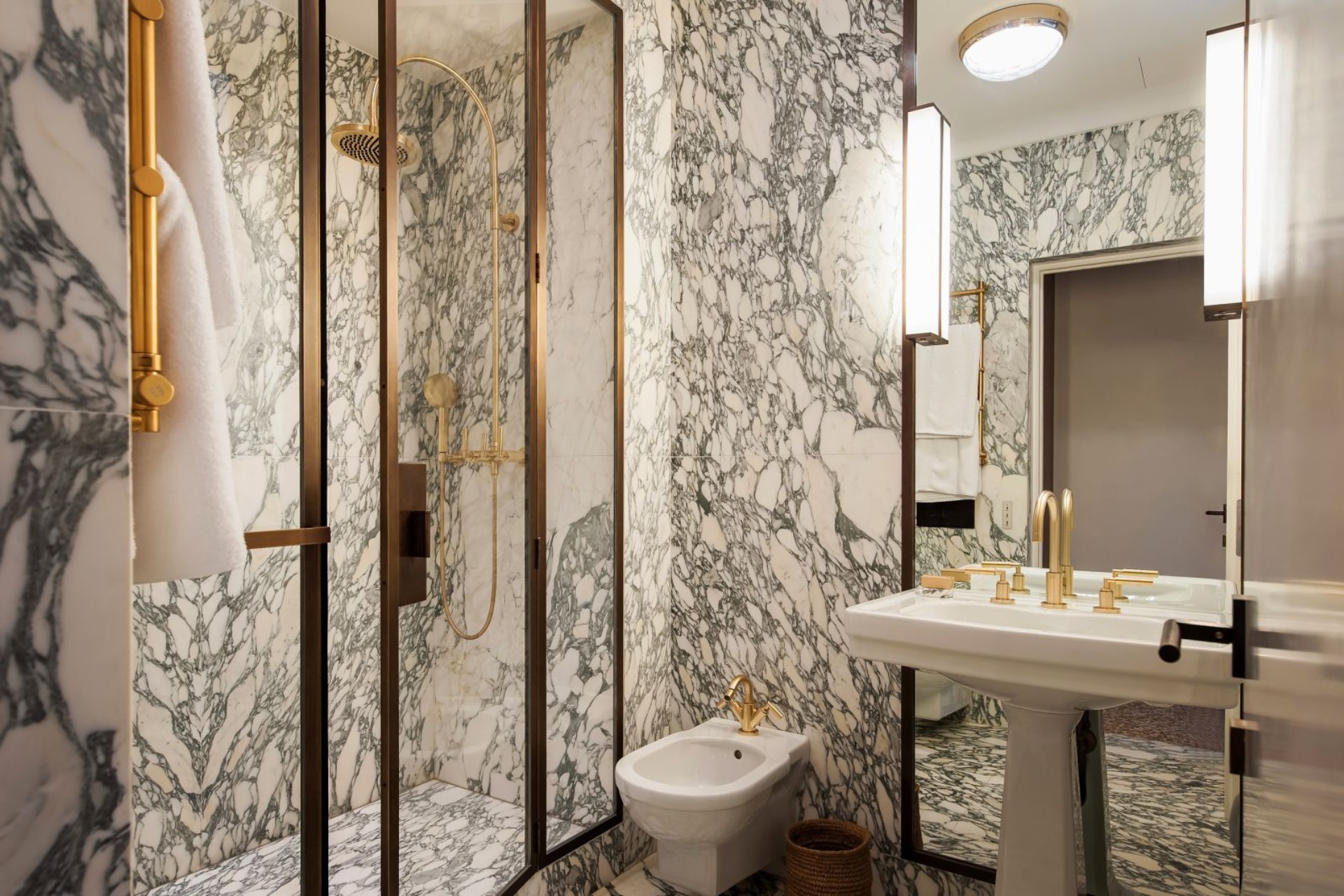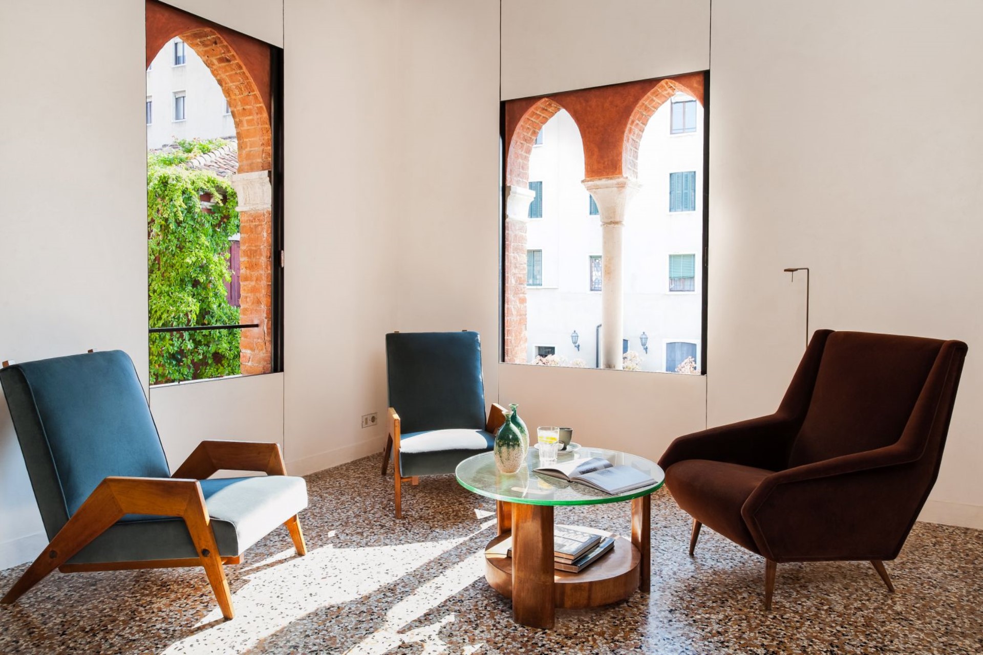 The apartment has been masterfully designed and decorated by one of Venice’s leading architects, in collaboration with one of France’s leading interior decorators, drawing inspiration from the work of Carlo Scarpa. Its elegant features include terrazzo floors, creamy Marmorino walls, bronze windows, and stunning marble bathrooms.
