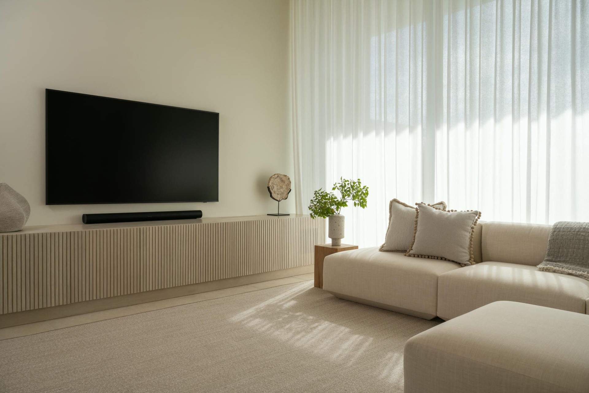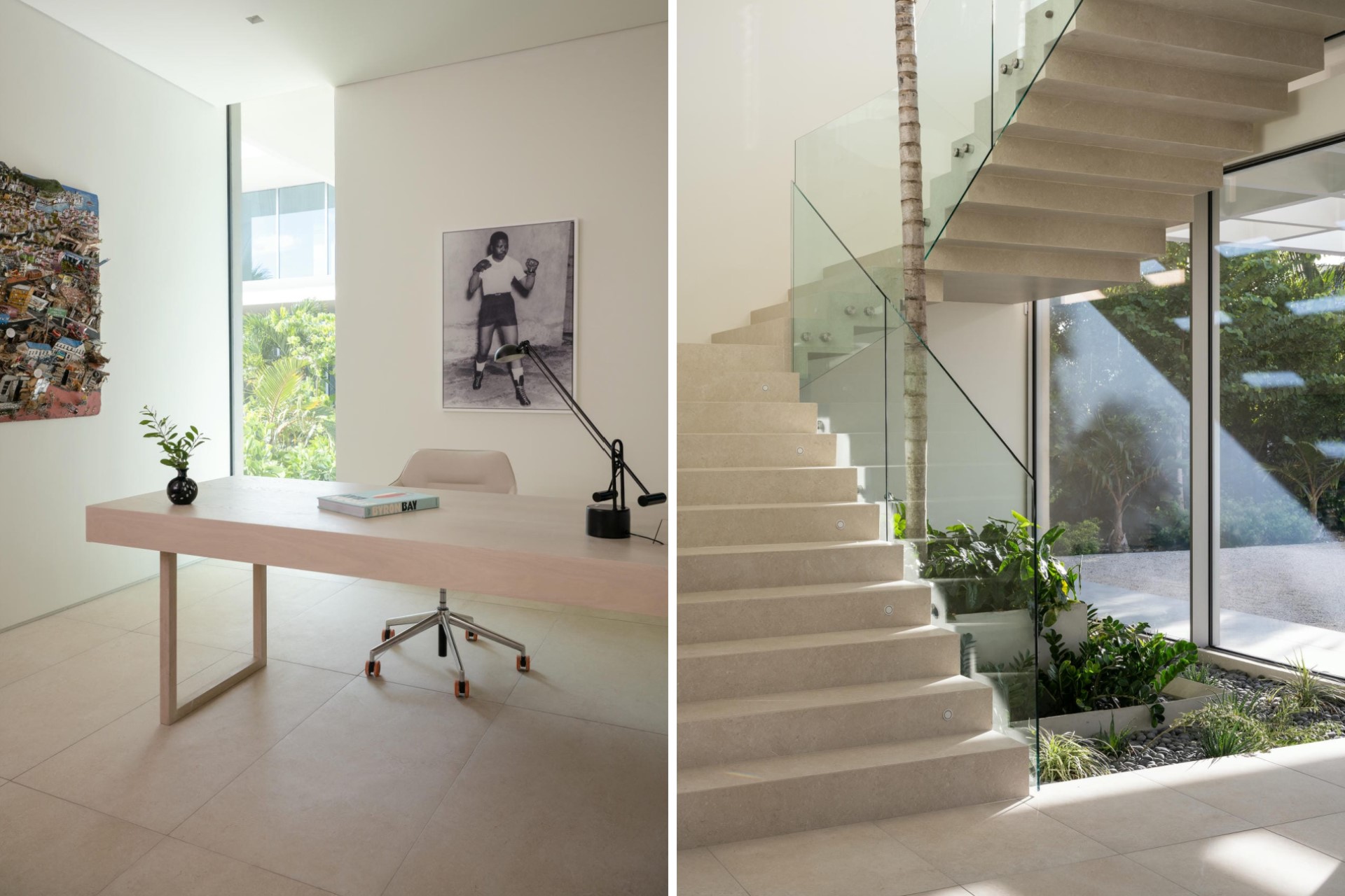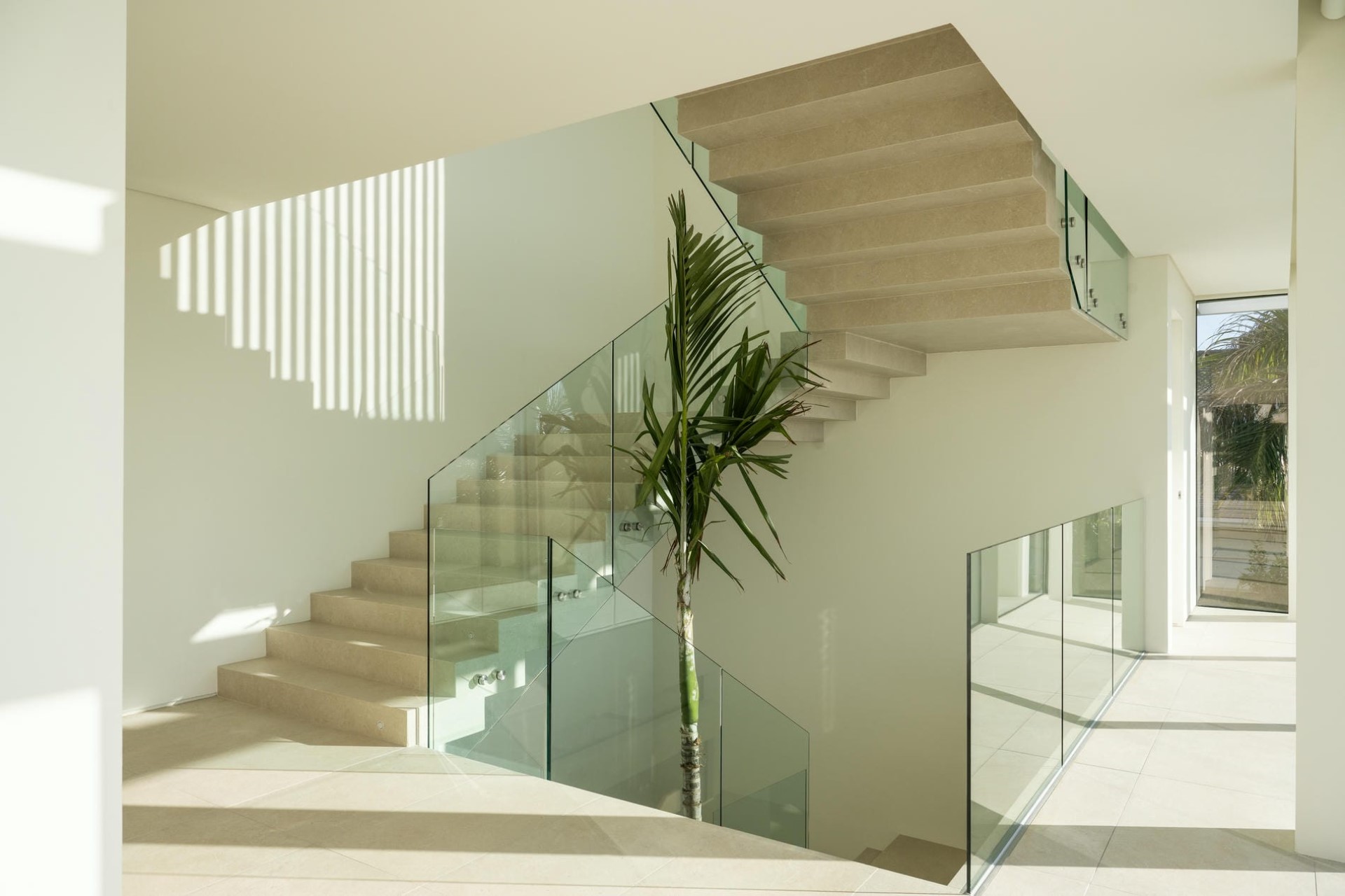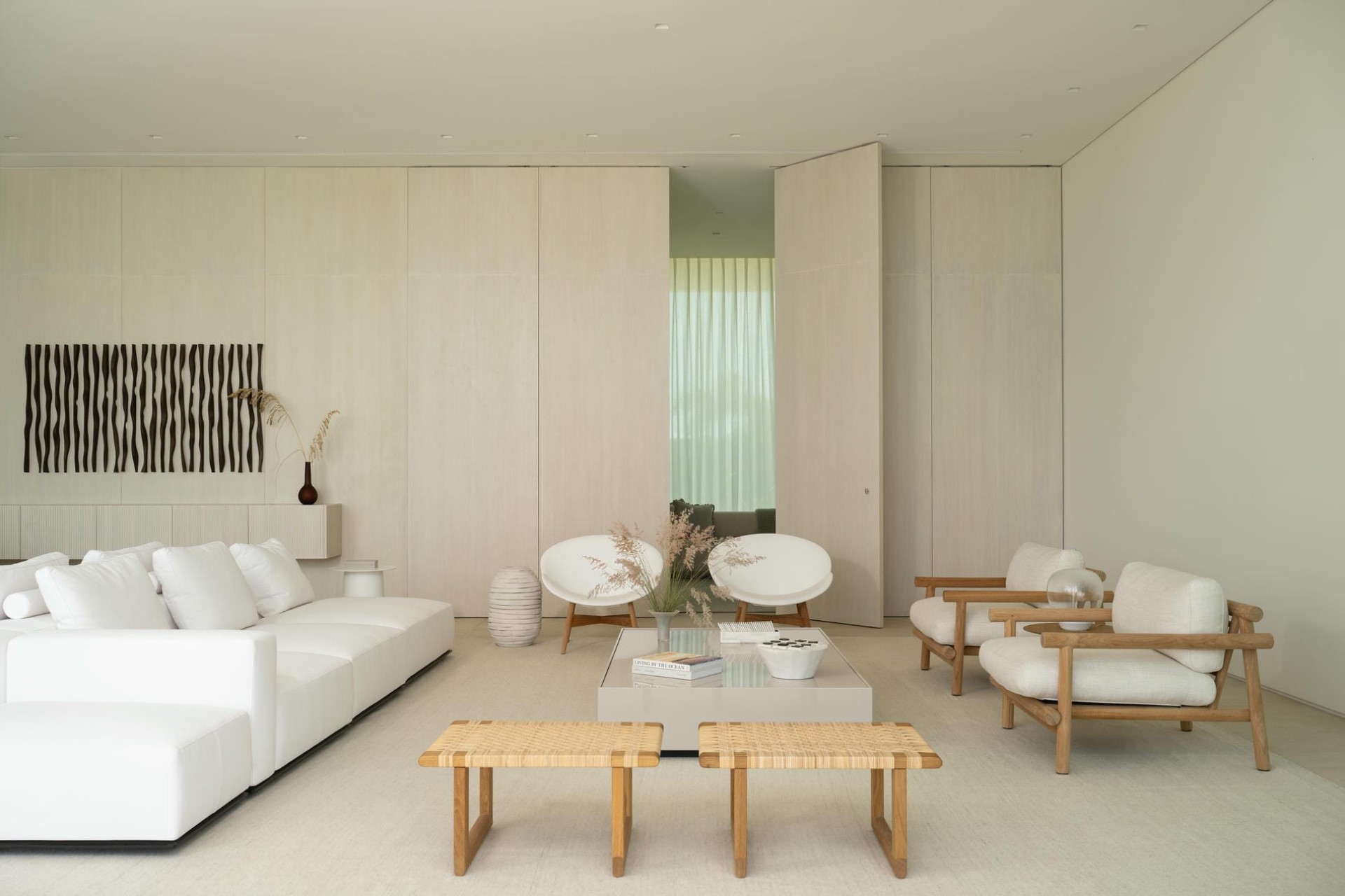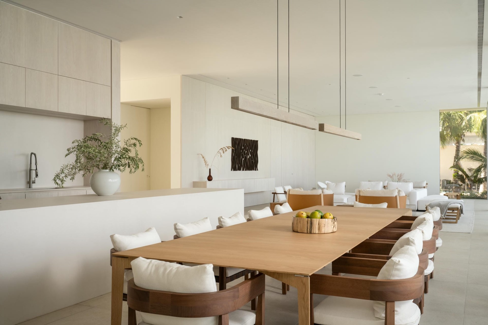 Sliding glass doors from the pool terrace blur the lines between outdoor and indoor living. The modern, open-plan interiors, with high ceilings and a neutral colour palette, create a bright and spacious feel.