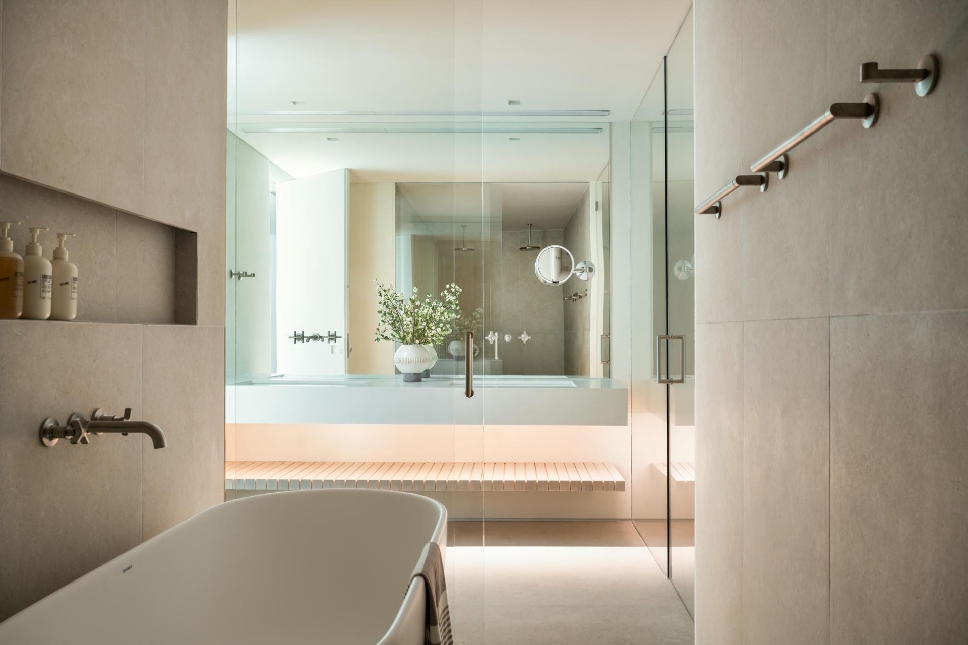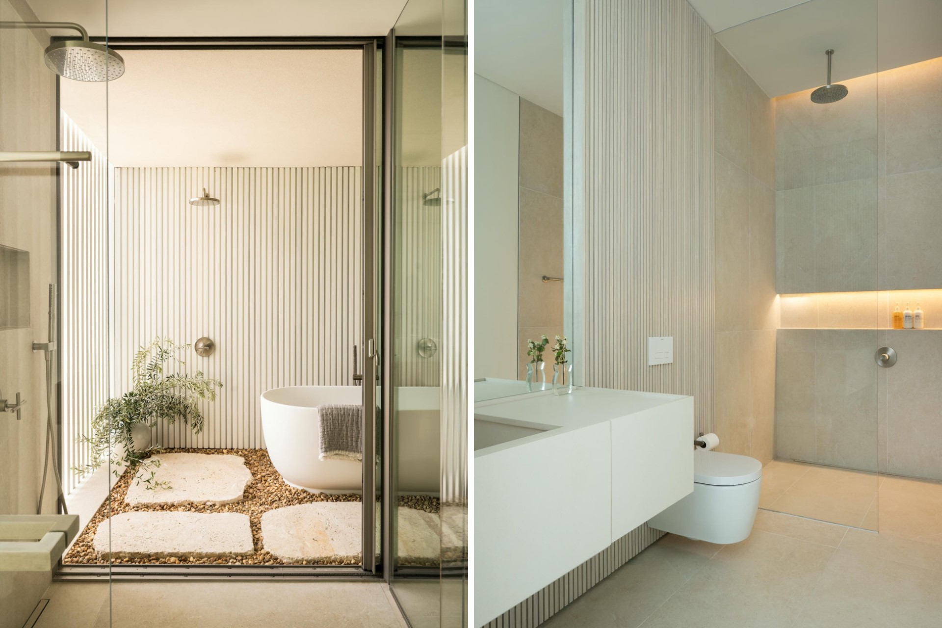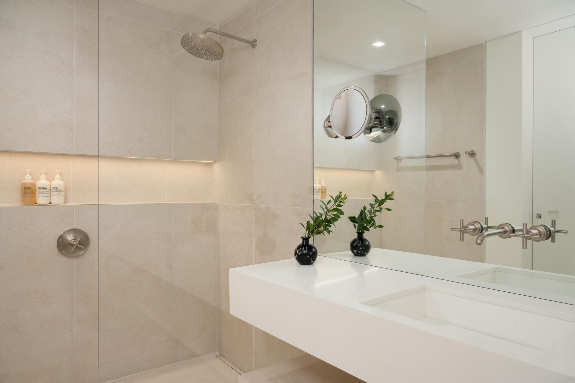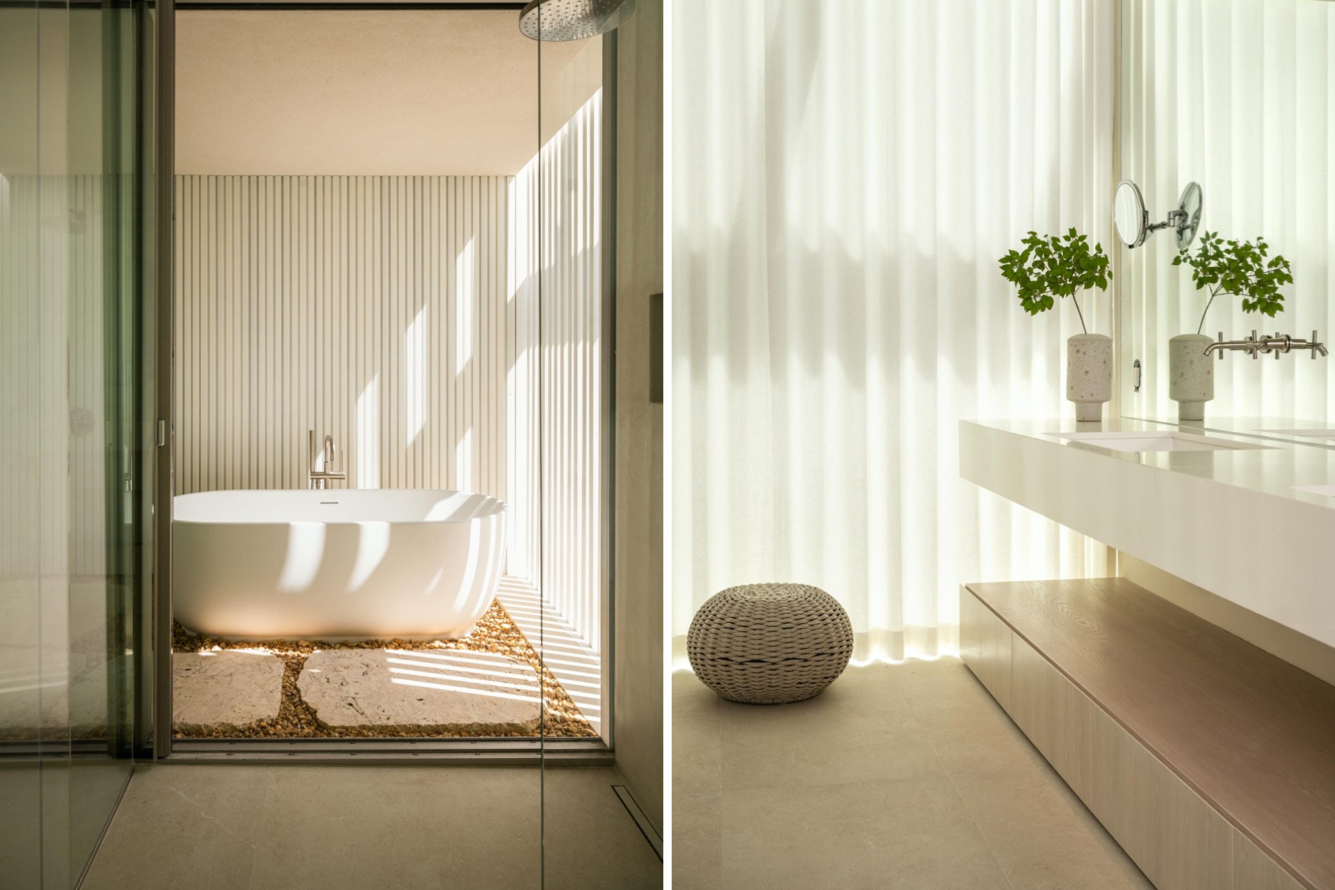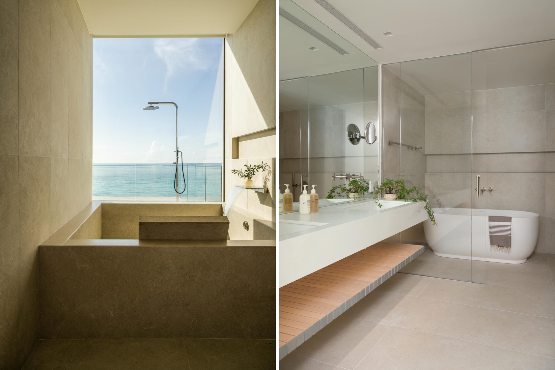 Master Suite – king-size bed, sitting area, walk-in wardrobe, en-suite bathroom with dual vanity, bathtub & separate shower, private terrace, roof terrace access, and ocean views