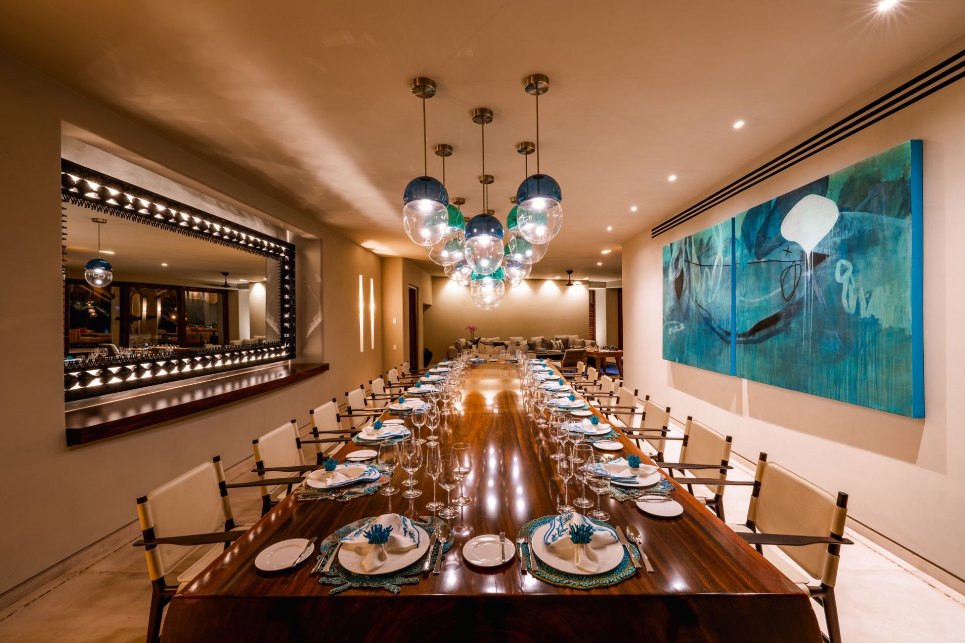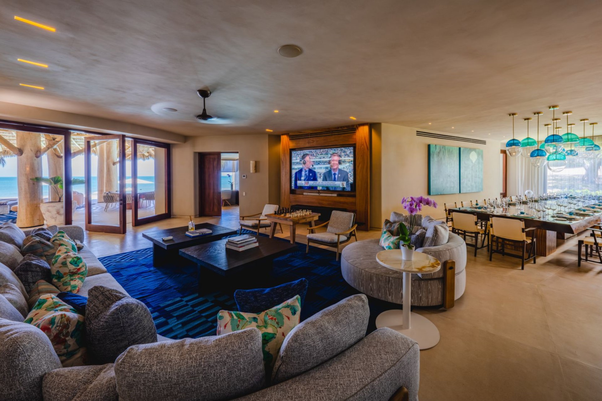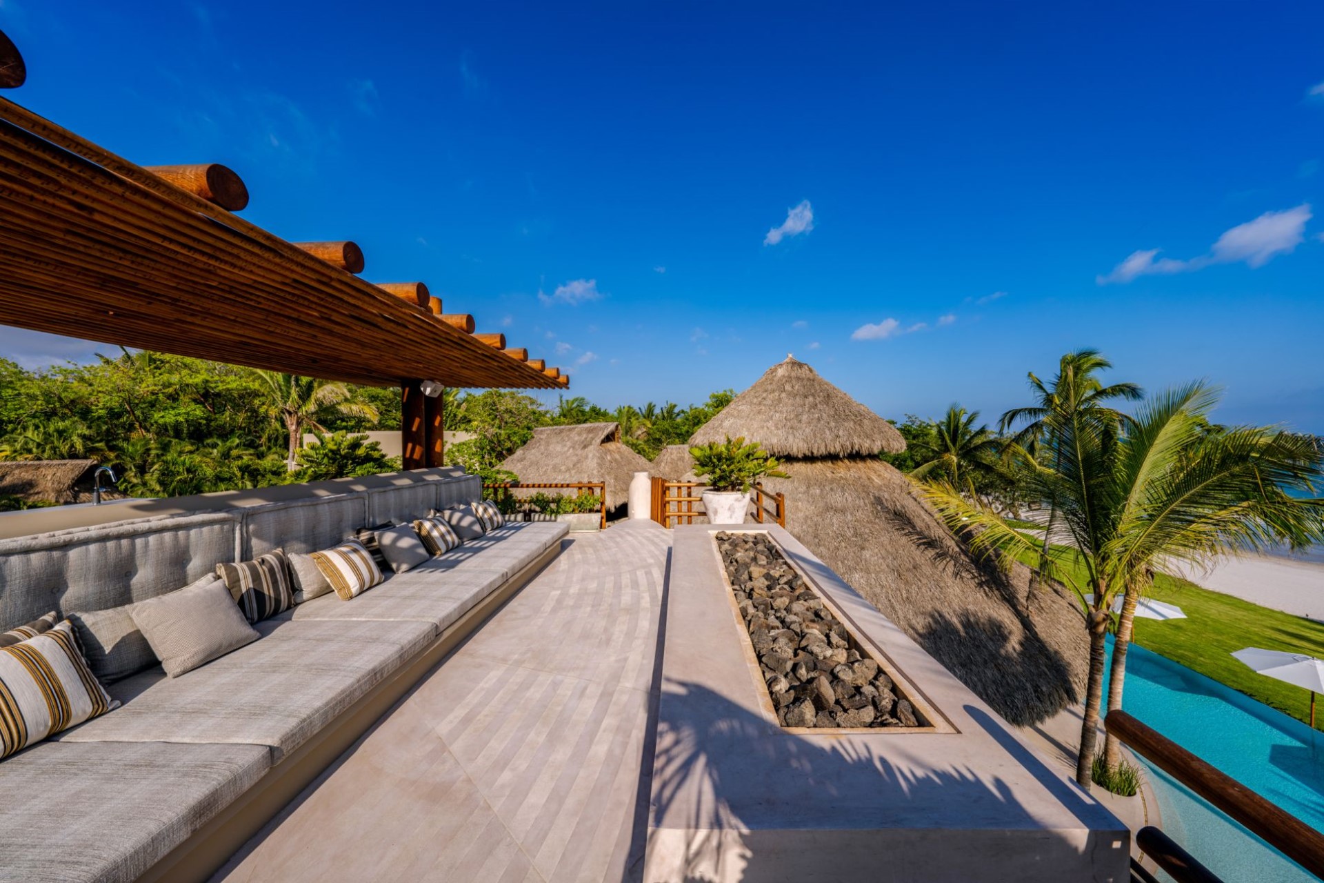 The heart of the villa is the grand palapa, a spacious open-air living area perfect for entertaining or simply relaxing. It offers plenty of lounge seating, a Tequila bar, and a beautiful dining table for relaxed al fresco meals.