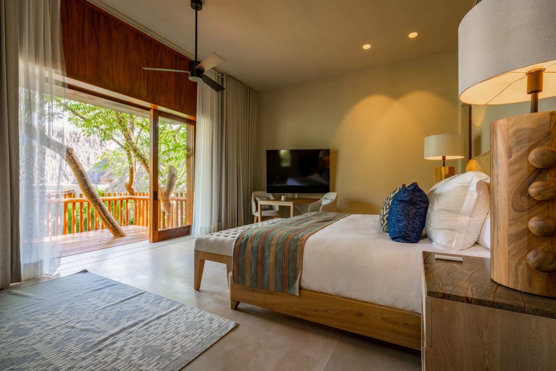 Bedroom 9 – king-size bed, lounge area, en-suite bathroom with dual vanity & shower, and private terrace with garden/partial ocean views