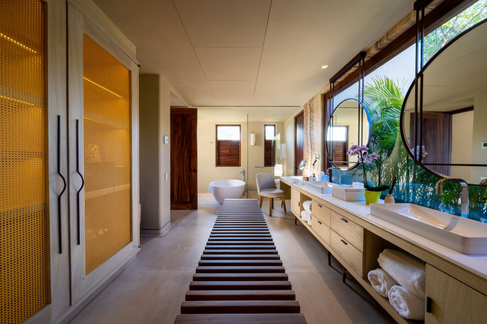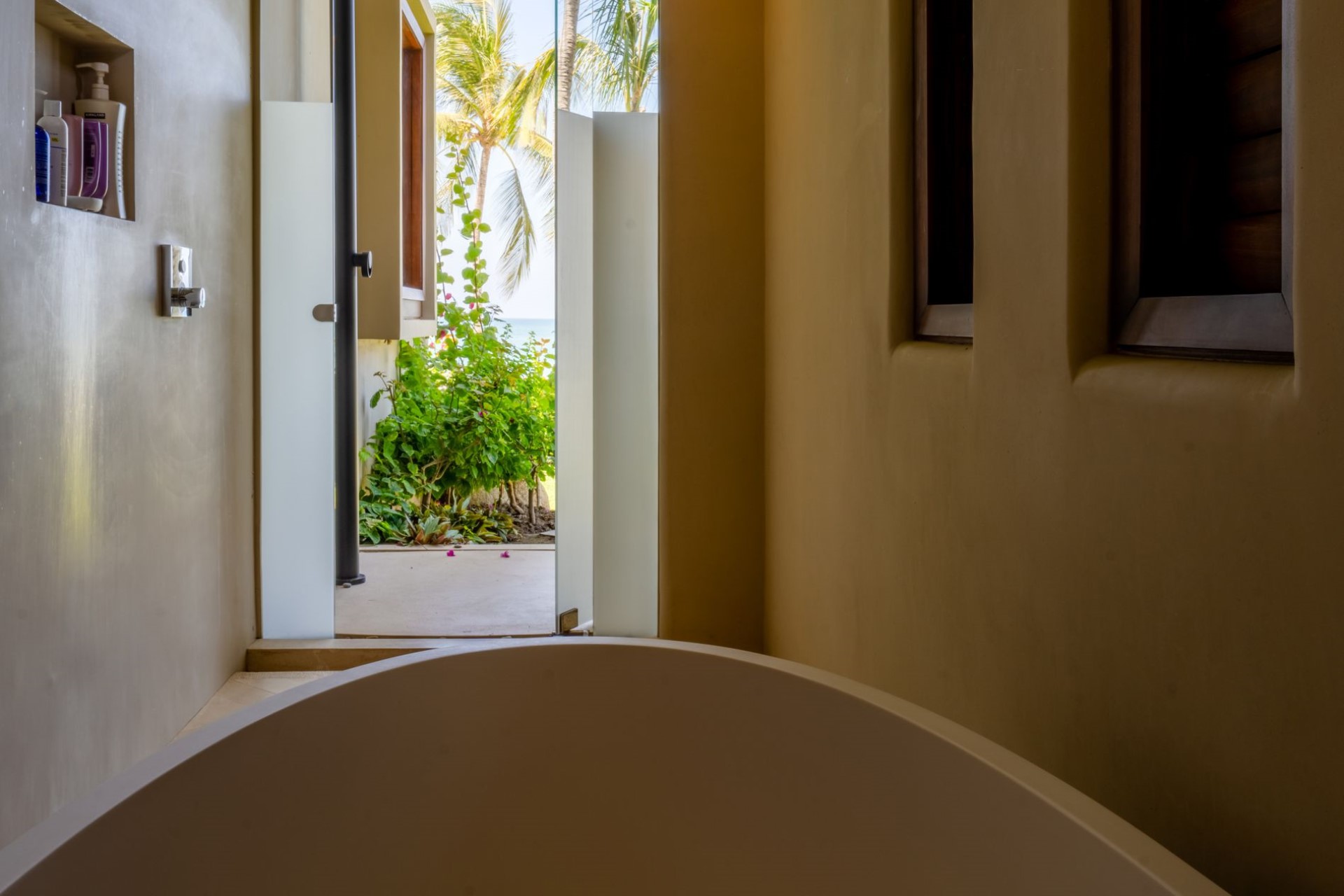 Bedroom 1 – king-size bed, lounge area, study, en-suite bathroom with dual vanity, bathtub & separate shower + outdoor shower, private terrace, and ocean views