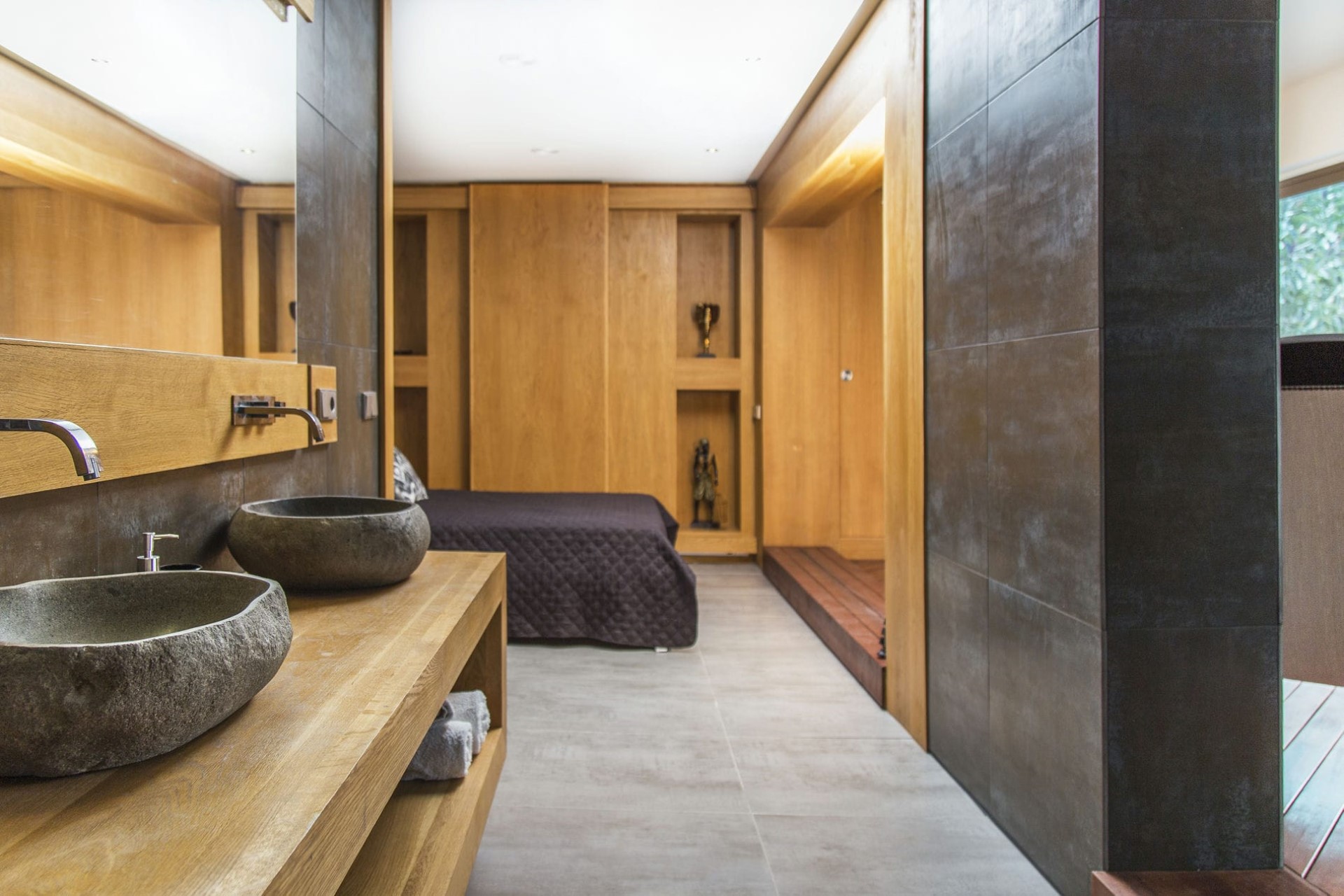 A modern luxury villa with two private pools and a yoga terrace surrounded by lush greenery
