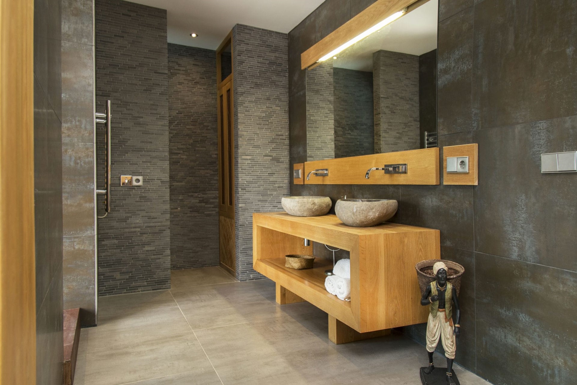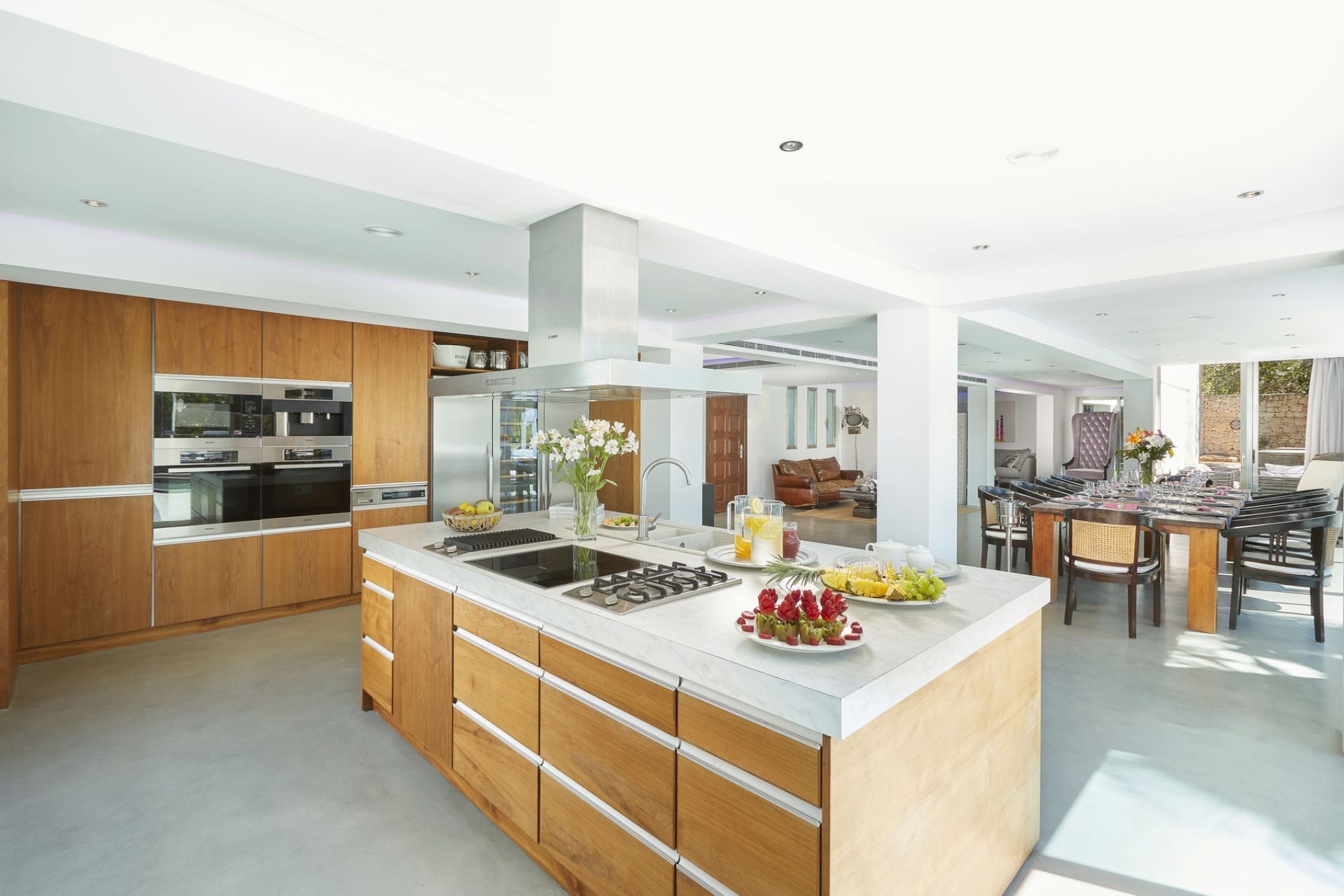 With a modern feel and high-end furnishings, this villa allows guests to feel at home whilst relaxing in comfort and style. The sumptuous sofas in the living room complement the neutral decor, whilst maintaining a bright and airy feel to the open plan space via the large French doors. The modern kitchen and dining area are also an open concept and allows sunlight to flood through the vast glass windows, perfect for entertaining and can host up to 10 diners at the table.