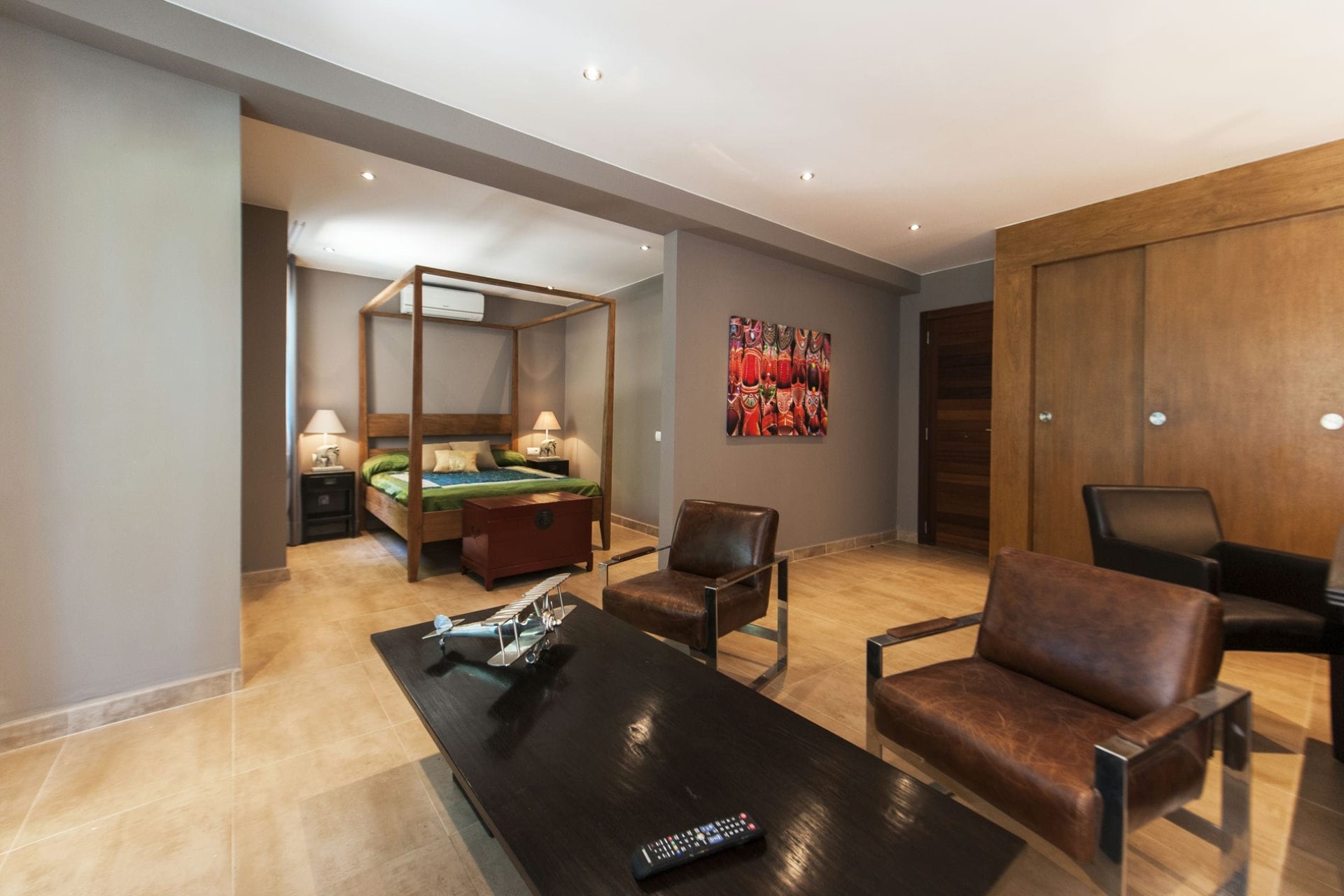 Bedroom 4 – double bed, private living room with desk, en-suite bathroom with shower, and terrace access