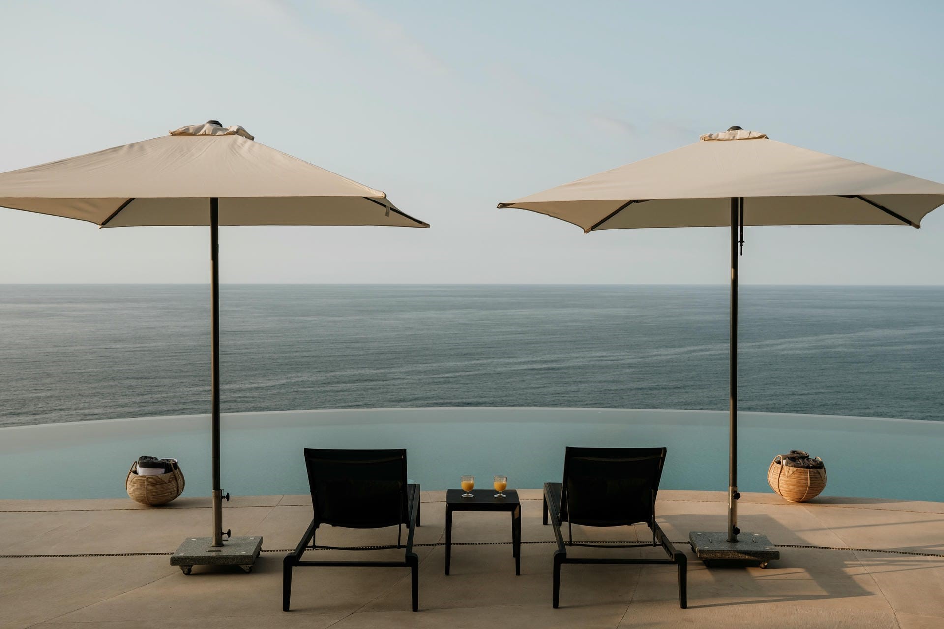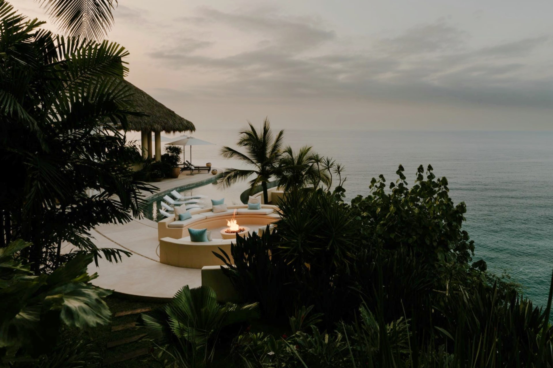An impressive infinity pool wraps around the front of the villa, seemingly spilling into the Pacific below. Sun loungers and umbrellas line the pool’s edge, while in-pool loungers offer a serene place to top up a tan. At one end of the pool is a bubbling Jacuzzi, perfect for a relaxing soak; at the other, a cosy fire pit beckons for sunset cocktails and intimate conversations under a star-filled sky.