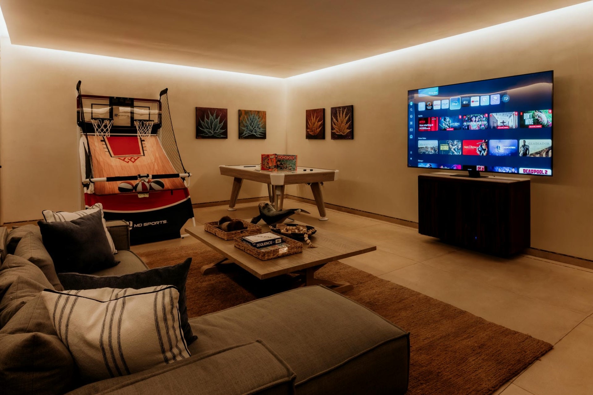 Each of the beautifully appointed bedrooms, offers an en-suite bathroom and a private terrace or balcony. The two master bedrooms are particular highlights, featuring outdoor bathtubs with ocean views. Two rooms are particularly well set-up for those travelling with children. First is the family suite comprising a king-size bed and bunk beds for two. Secondly, there is a dedicated kids’ space on the lower ground floor with a games lounge – complete with air hockey, mini basketball game, a games table and a Smart TV – plus queen-size bunk beds sleeping up to eight.