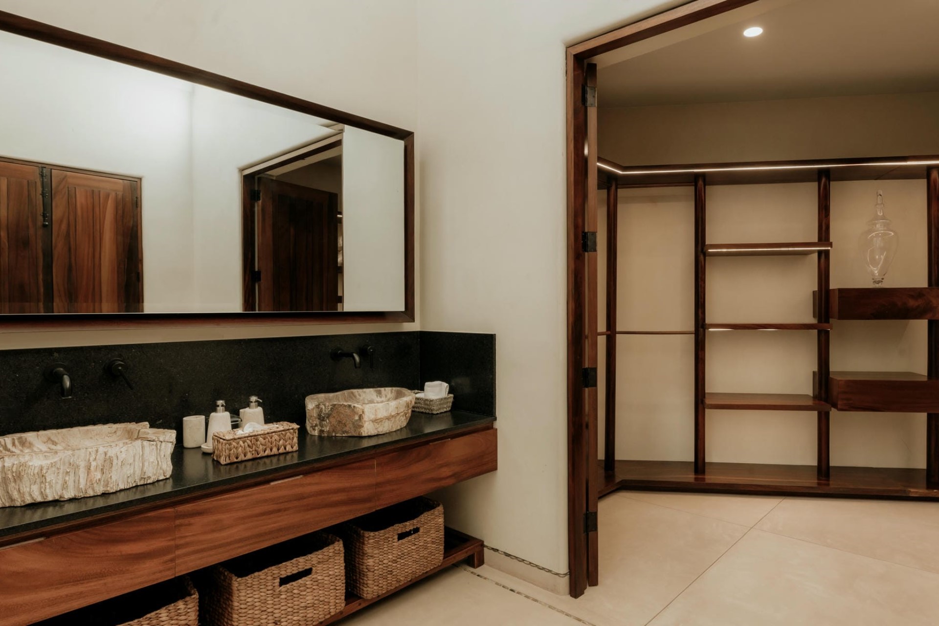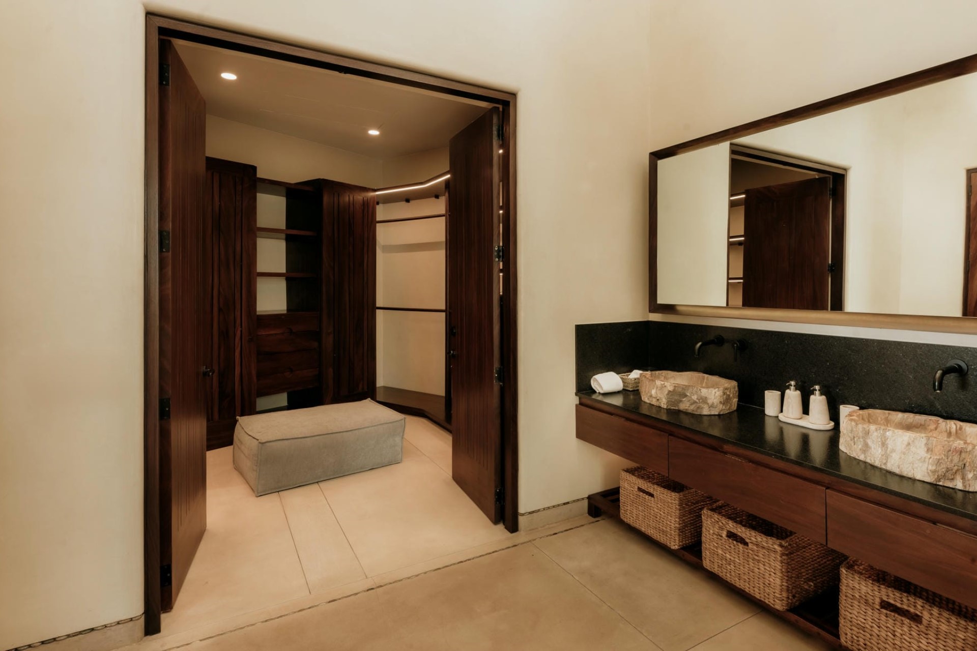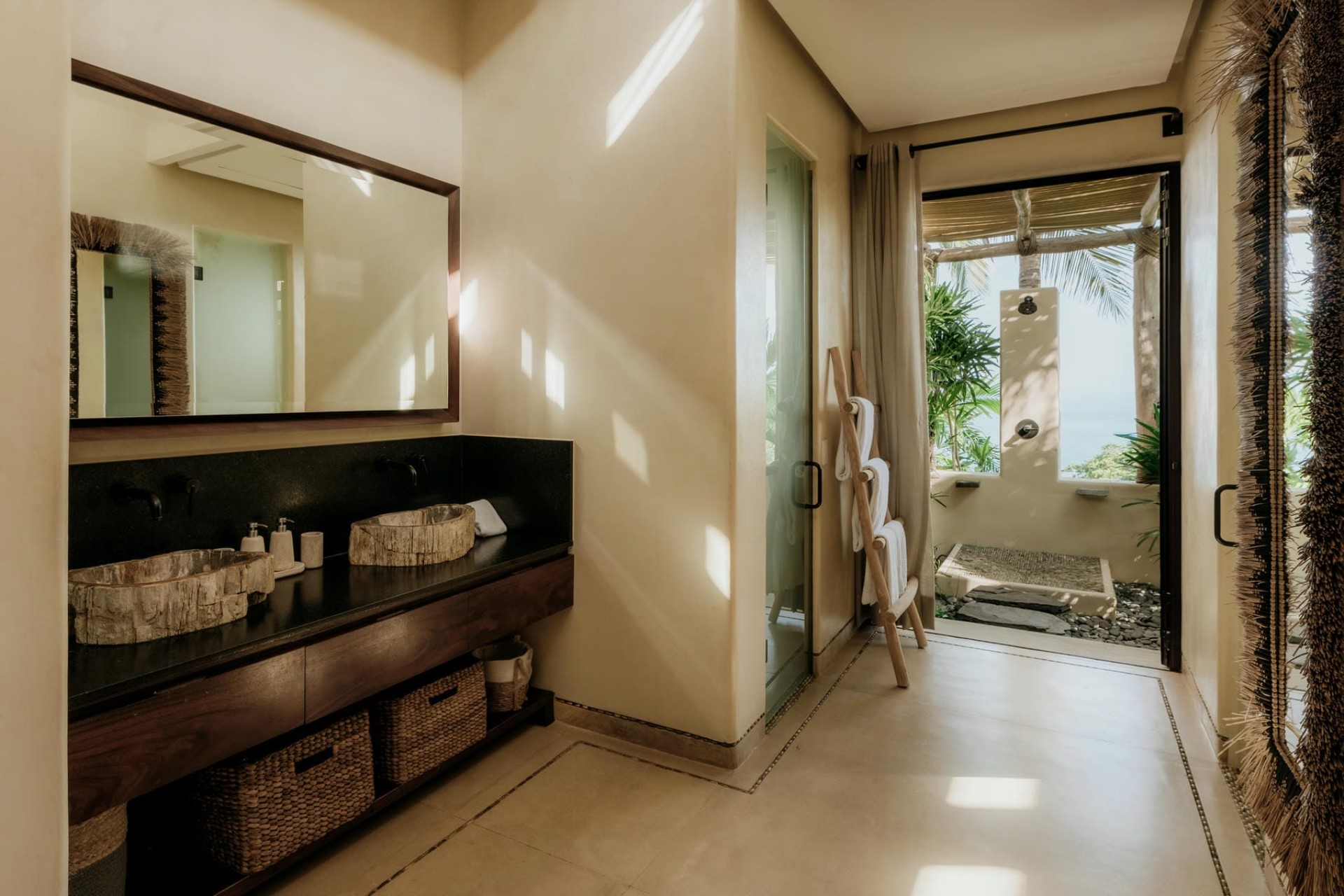 Agua Master Bedroom – king-size bed, dressing room, en-suite bathroom with dual vanity, & shower + outdoor bathtub & separate shower, private terrace, and ocean views