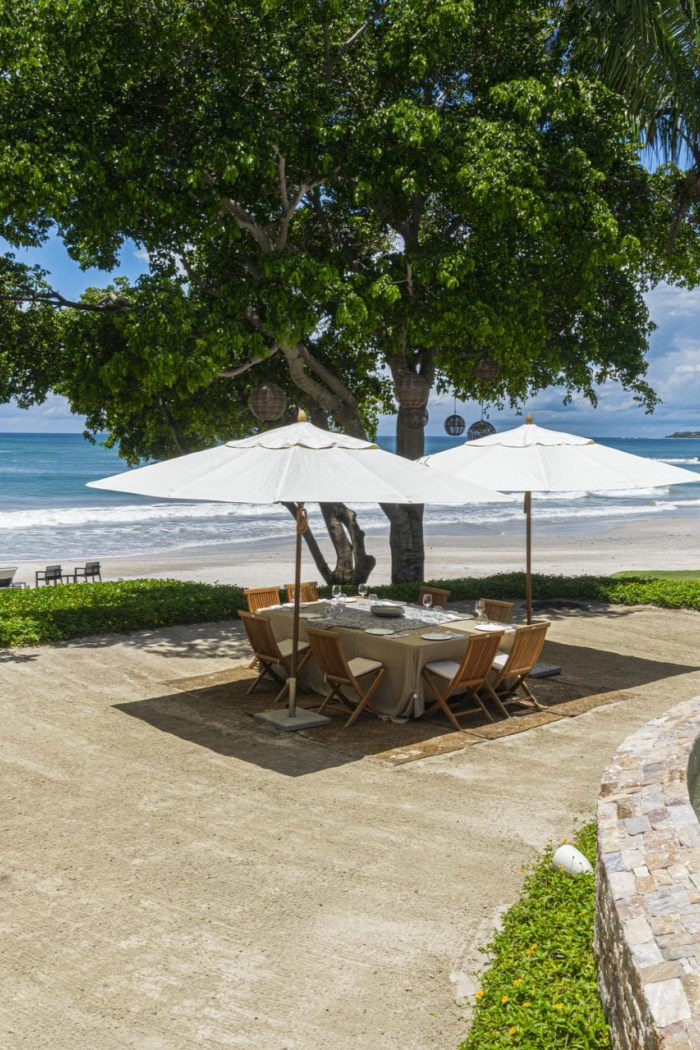 Manicured gardens filled with tropical plants and vibrant flowers surround the property, creating a sense of privacy and seclusion. A path leads to a quiet beach, providing direct access to the pristine waters of the Pacific. Along with direct beach access, the villa boasts a private stretch of sand, shielded by lush vegetation and tall trees. It offers the ideal setting to enjoy al fresco meals under the shade of an umbrella or evening cocktails at the outdoor bar.