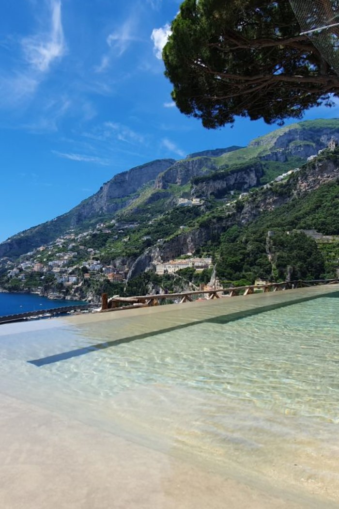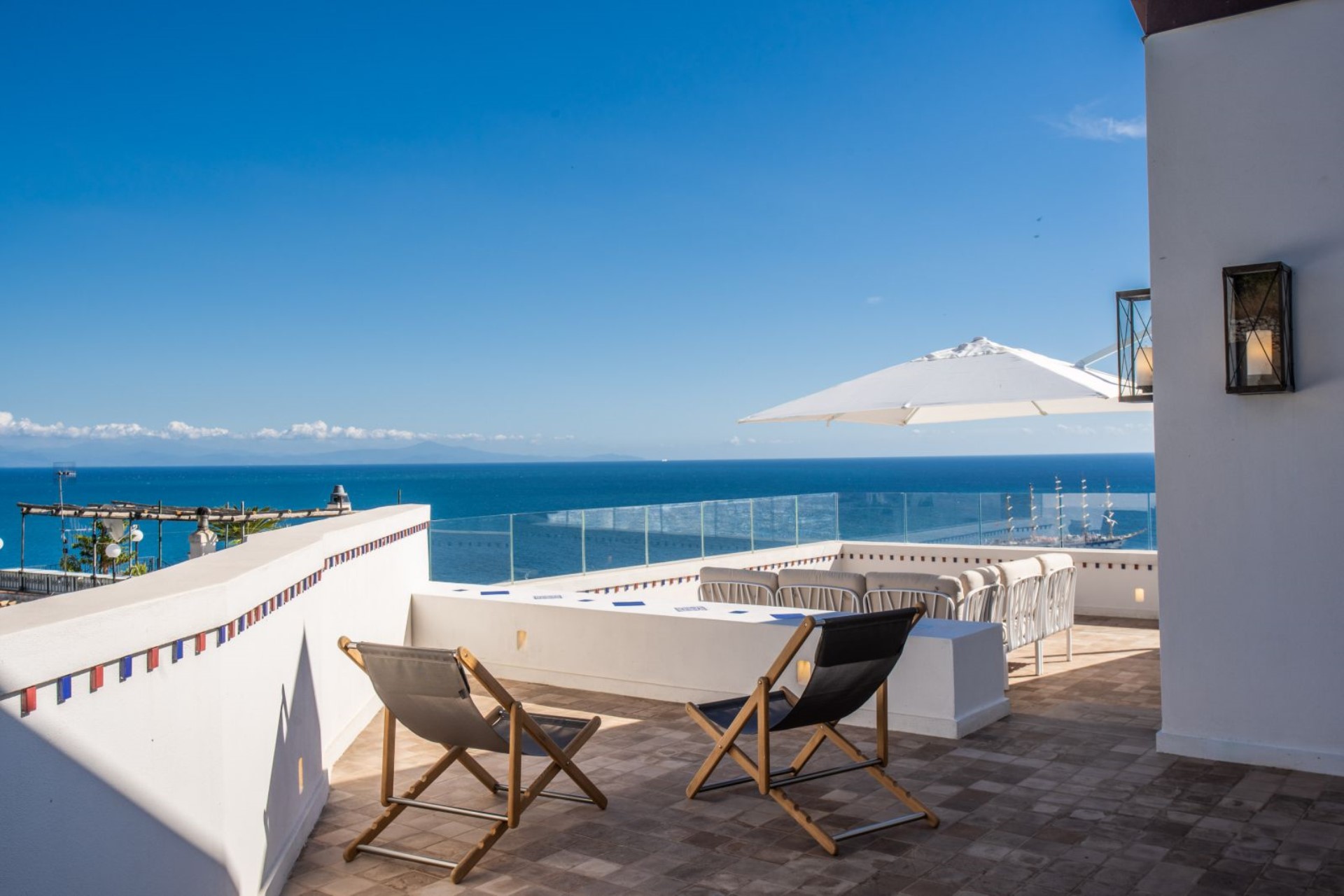 A private terrace runs along the property, offering spectacular views and plenty of space to lounge in the sun and soak up the rays. An infinity swimming pool overlooks the sea and guests can relax and dine al fresco whilst talking in stunning views of the mountainous coastline and sparkling waters.