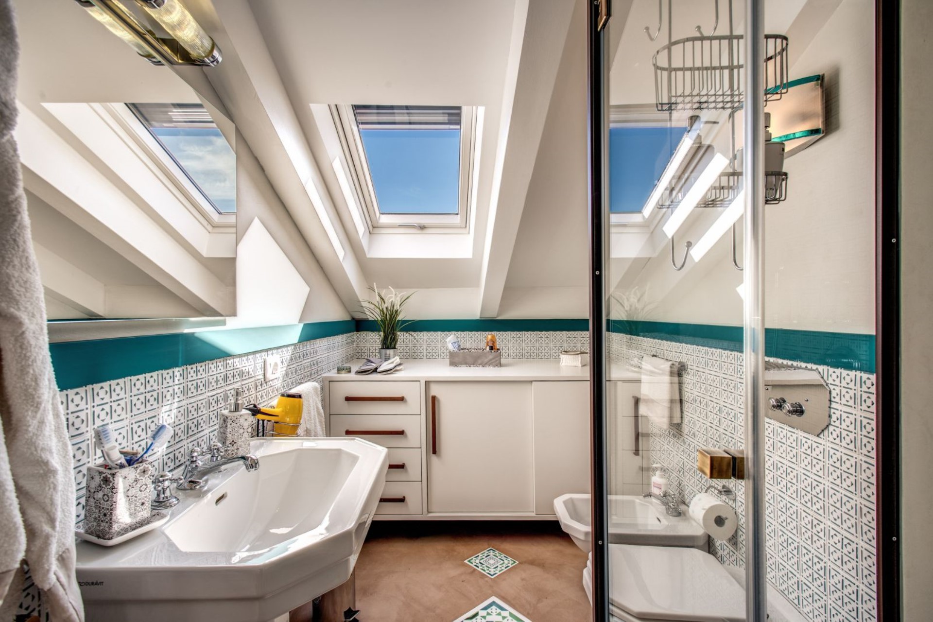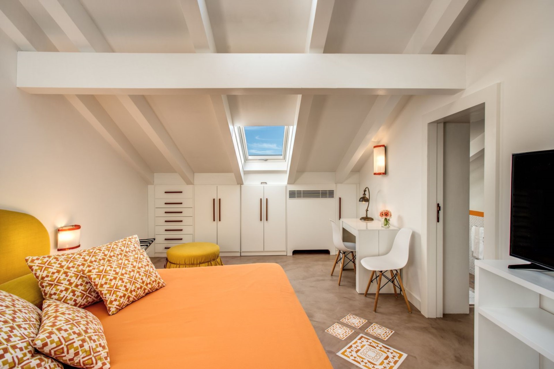 A separate rooftop terrace features a comfortable outdoor lounge setting with sun umbrella; the perfect spot for enjoying a morning coffee or evening aperitifs as the sun sets.