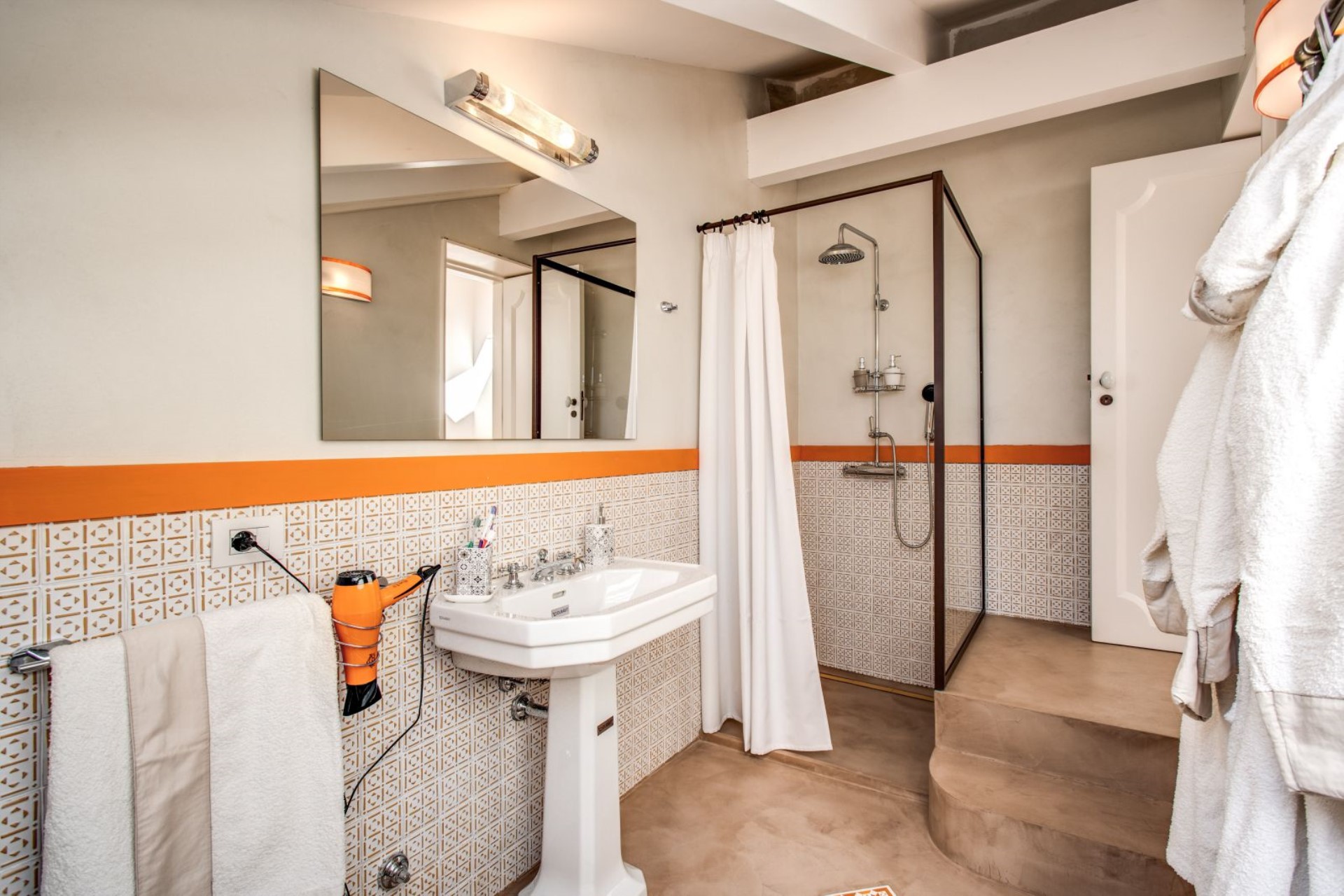 The interiors of this historic property have been beautifully-restored throughout, whilst still offering a traditional feel. The floors are paved with mortar and hand-made tiles, whilst many of the rooms feature sloped ceilings with characteristic exposed wooden beams. Modern furniture and bright furnishings perfectly complement the more traditional features for a welcoming and homely atmosphere.