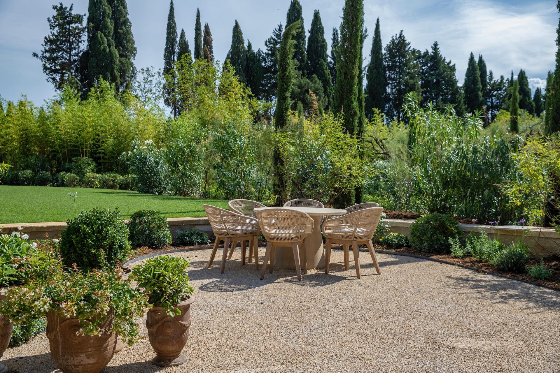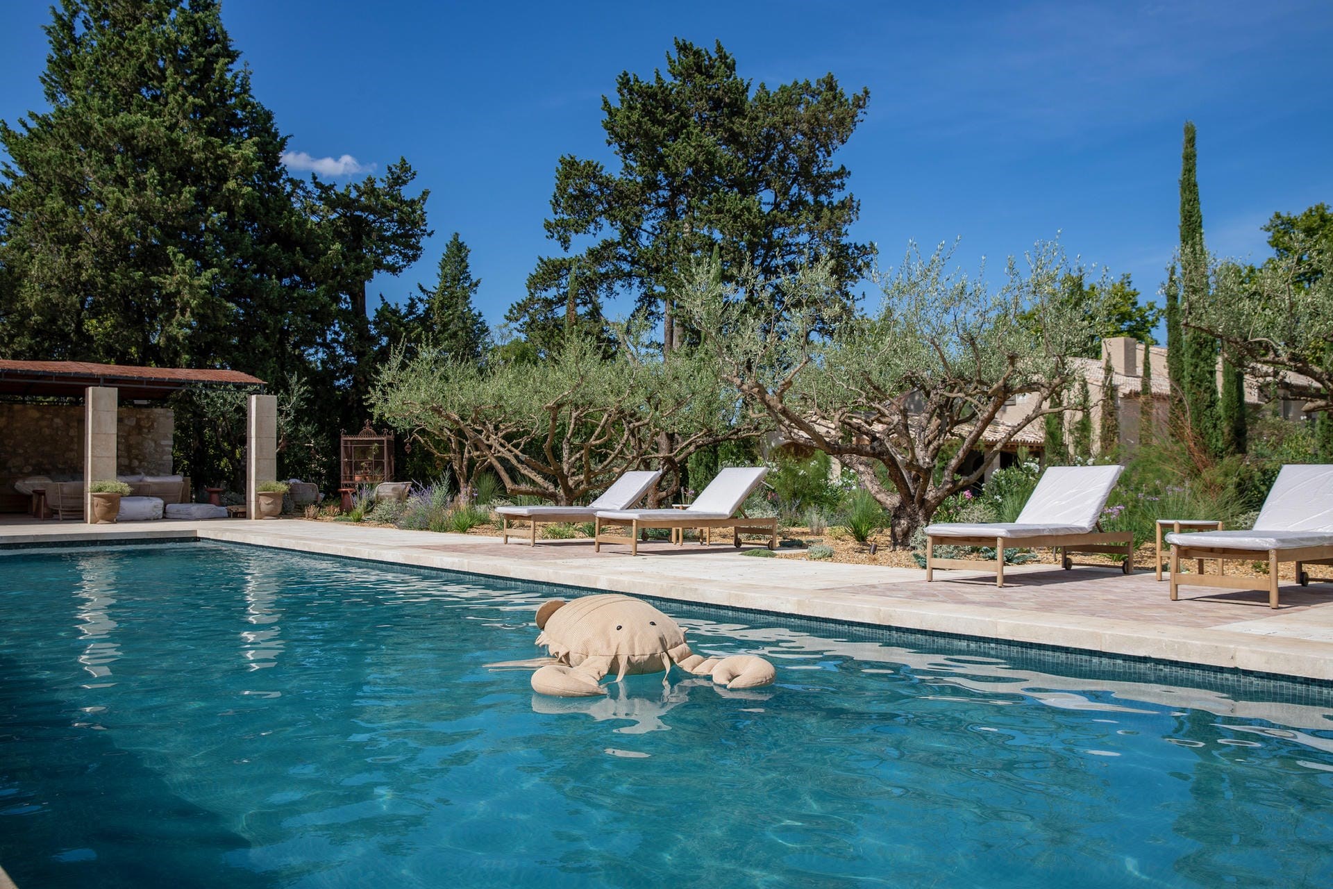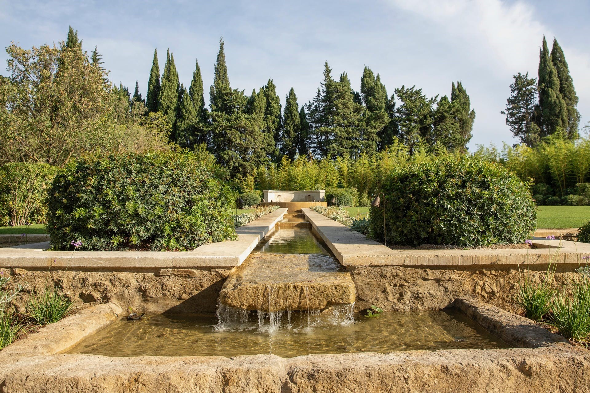 This Provençal mas is nestled within 1.3 hectares of meticulously designed landscaped gardens. Guests can stroll past lavender borders and gentle fountains, explore a vegetable garden filled with seasonal produce, navigate a classic hedge maze, and ascend to a lookout platform that offers sweeping views of the Alpilles. Resident donkeys, chickens, and goats will delight both children and adults alike.