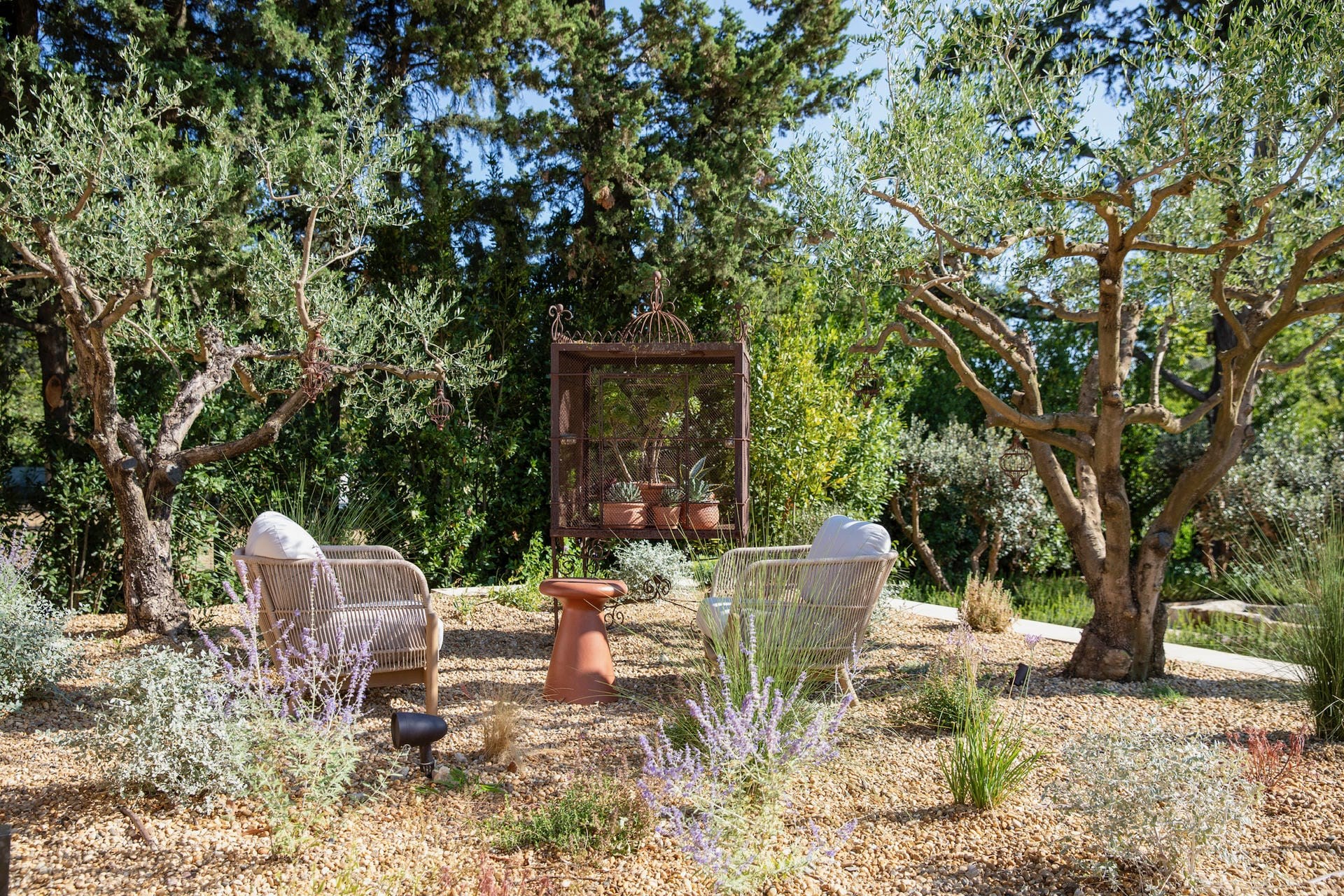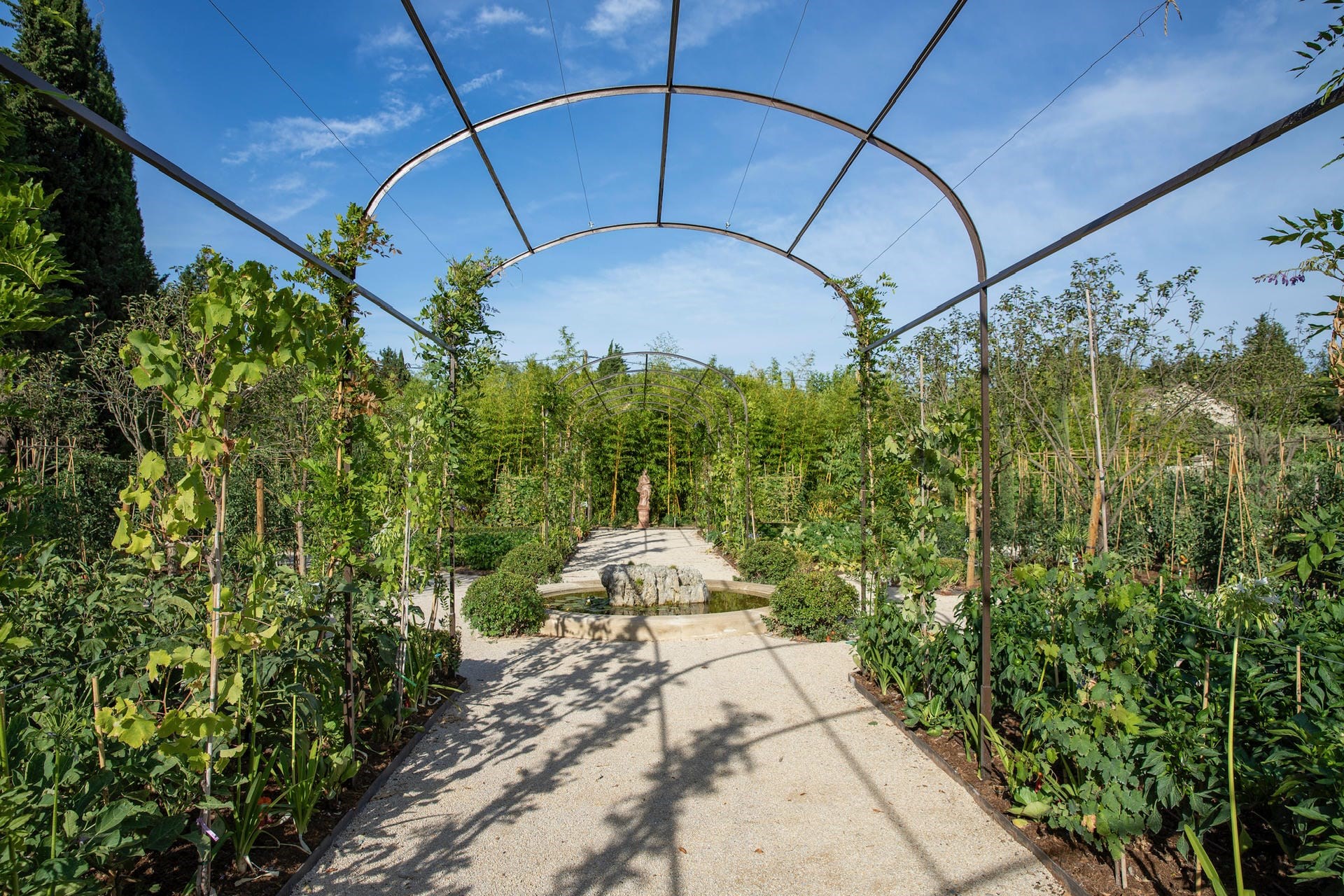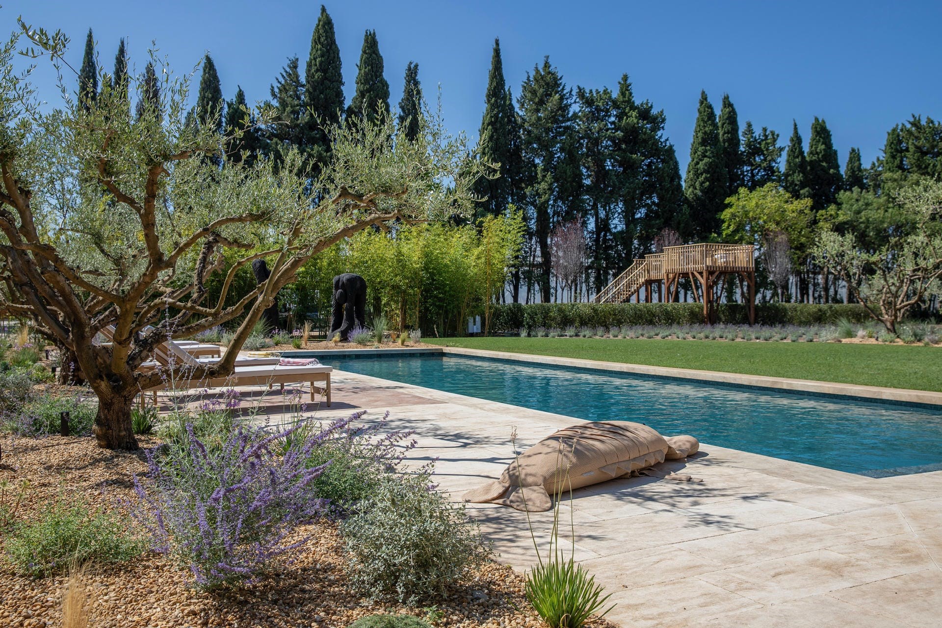 This Provençal mas is nestled within 1.3 hectares of meticulously designed landscaped gardens. Guests can stroll past lavender borders and gentle fountains, explore a vegetable garden filled with seasonal produce, navigate a classic hedge maze, and ascend to a lookout platform that offers sweeping views of the Alpilles. Resident donkeys, chickens, and goats will delight both children and adults alike.