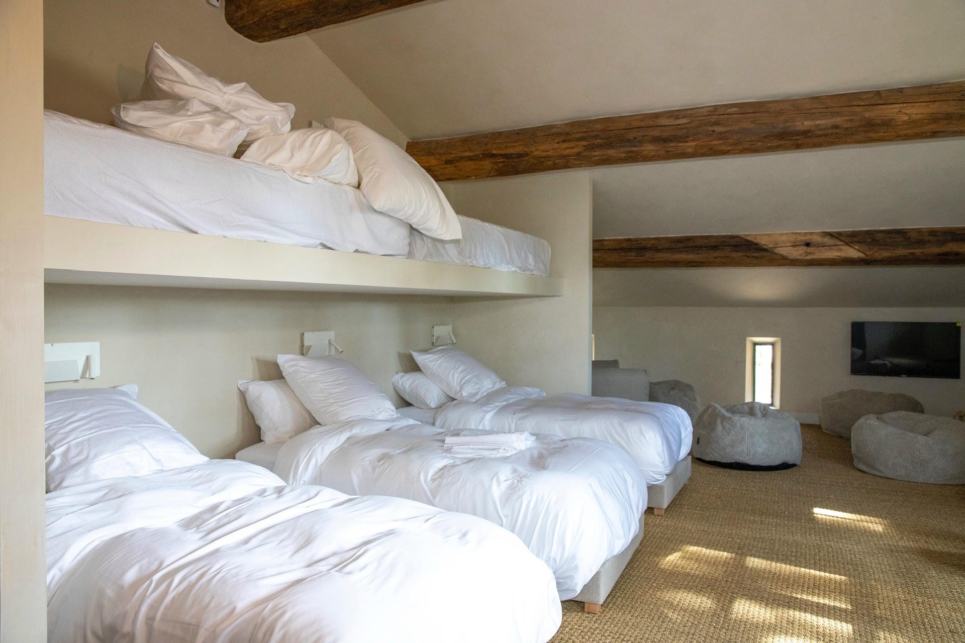 The villa features five spacious double bedrooms with king-size beds and en-suite bathrooms, including one fully accessible room for guests with reduced mobility. Additionally, there is a kids’ dorm with bunk beds and a cosy play area with a TV, which sleeps up to five children.