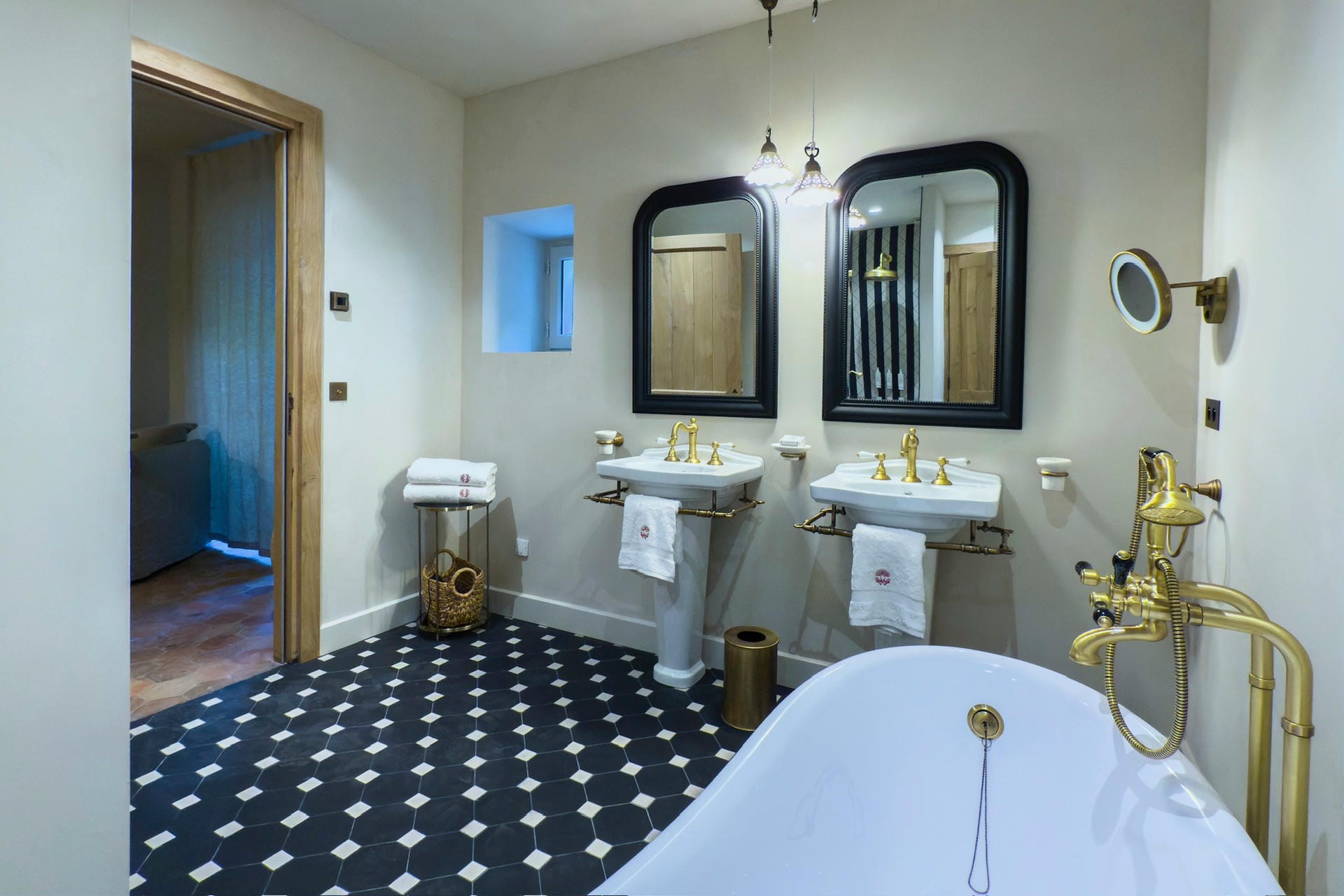 Bedroom 1 – king-size bed, sitting area, en-suite bathroom with dual vanity, bathtub & separate shower, and terrace access