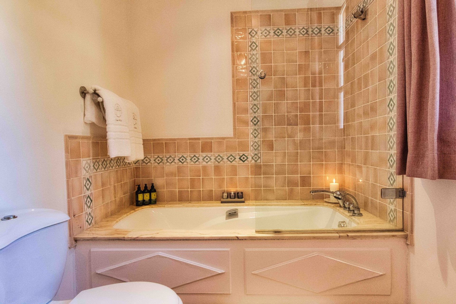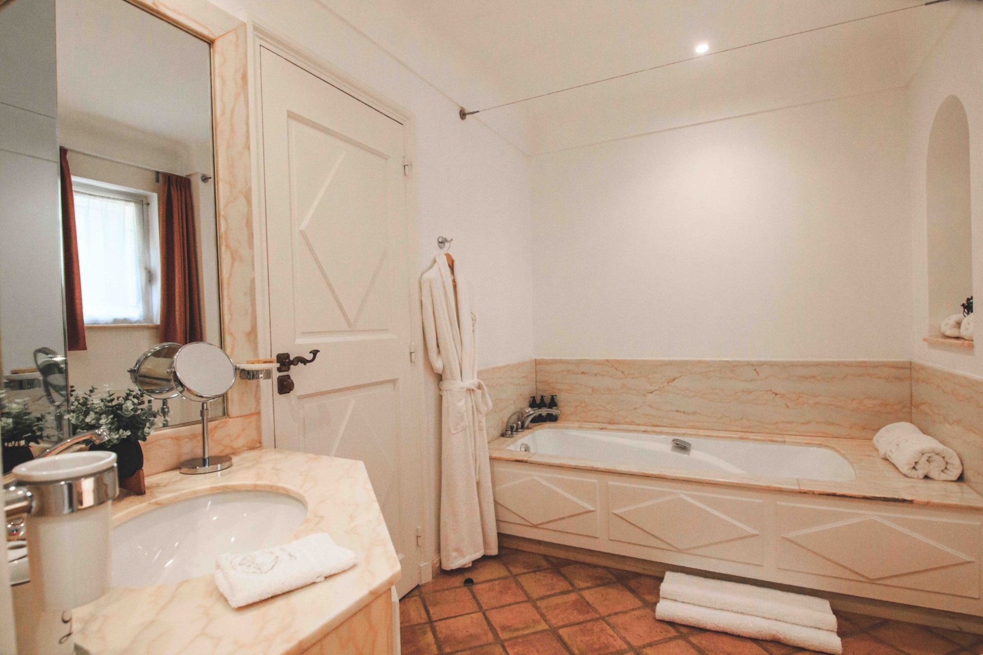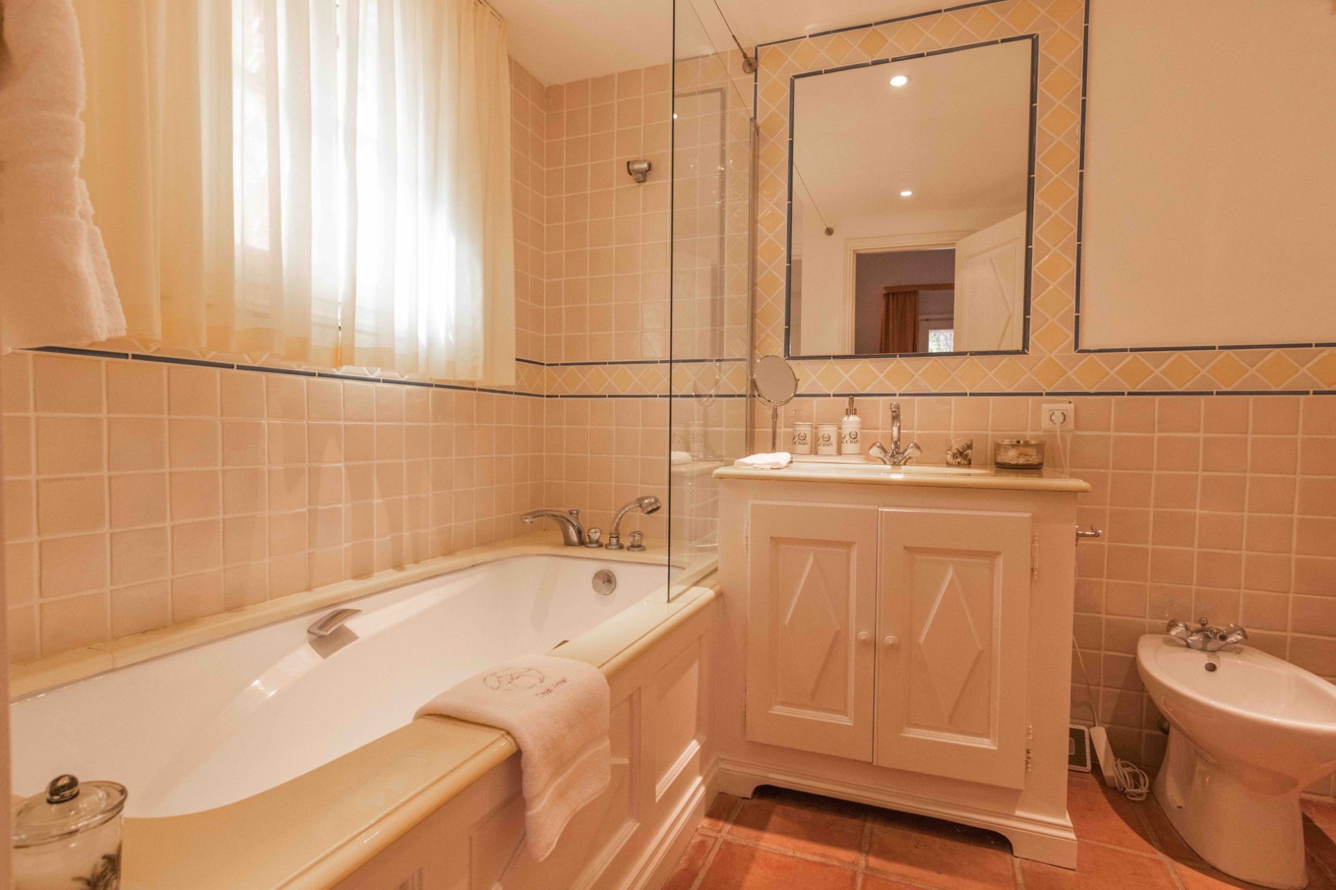 Mistral Bedroom – twin beds (converted to one double on request), dressing room, kitchenette, en-suite bathroom with bathtub/shower, and direct garden access