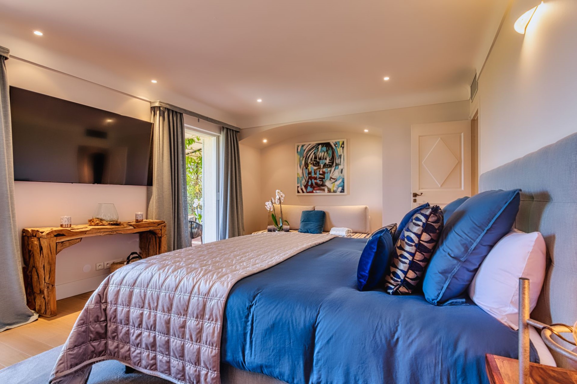 Within the main villa are six well-appointed bedrooms, each with its own unique style. All bedrooms feature a smart TV with video-on-demand, en-suite facilities, and direct garden or balcony access. The master bedroom also boasts two dressing rooms, a second en-suite bathroom, and a private terrace with sea views.