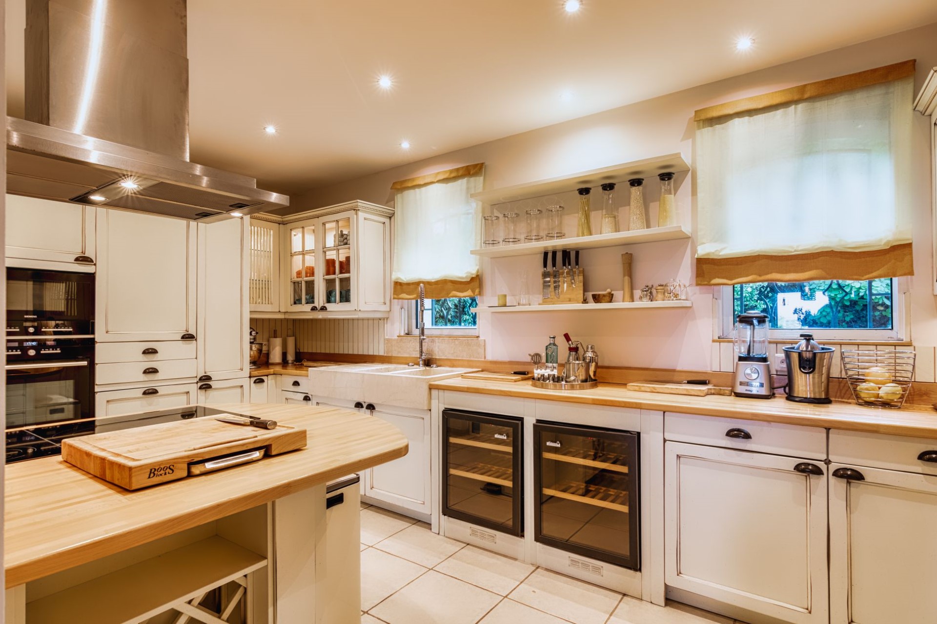 Just off the dining room is the fully-equipped kitchen, which features all the modern appliances needed to prepare anything from light meals to a full feast.