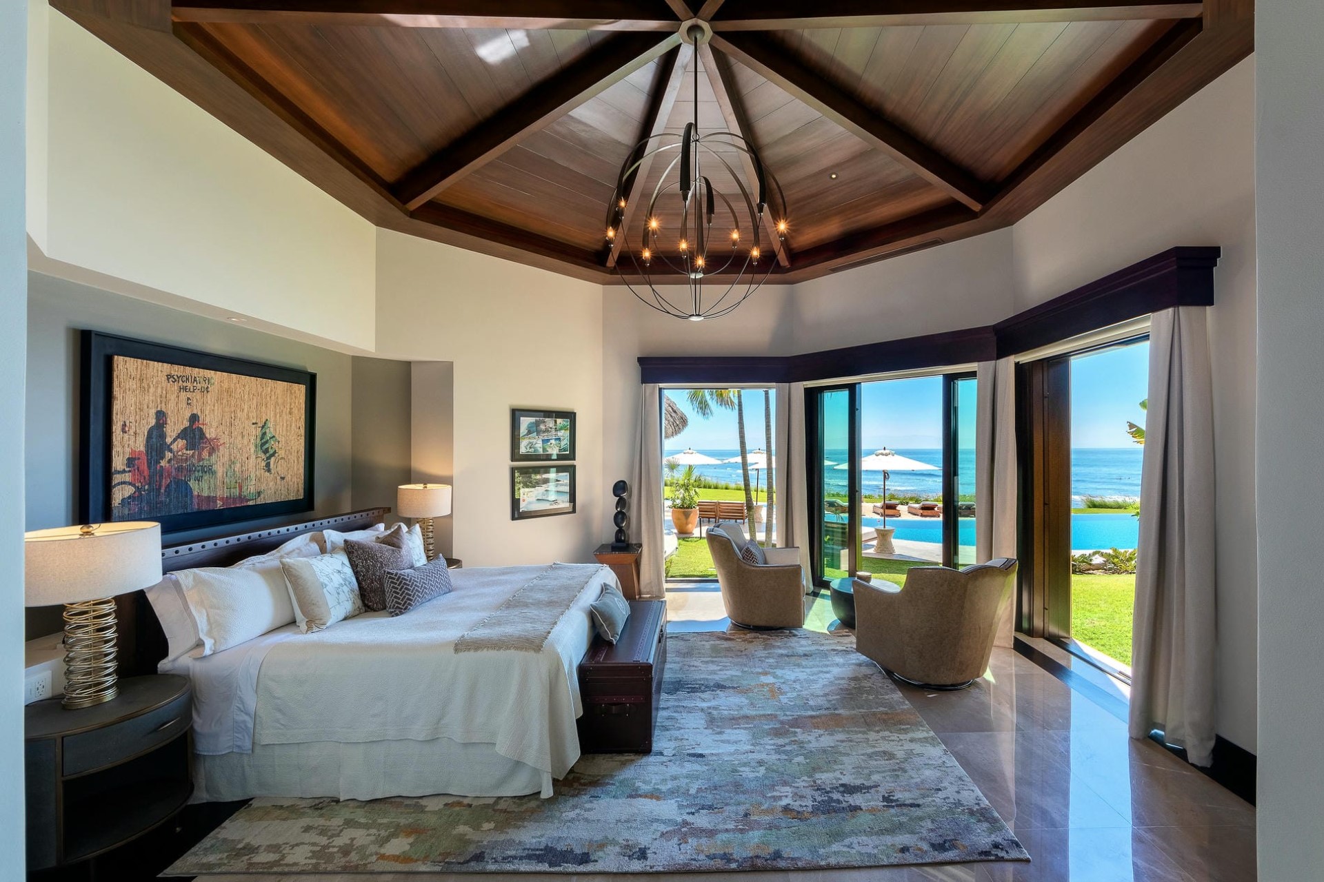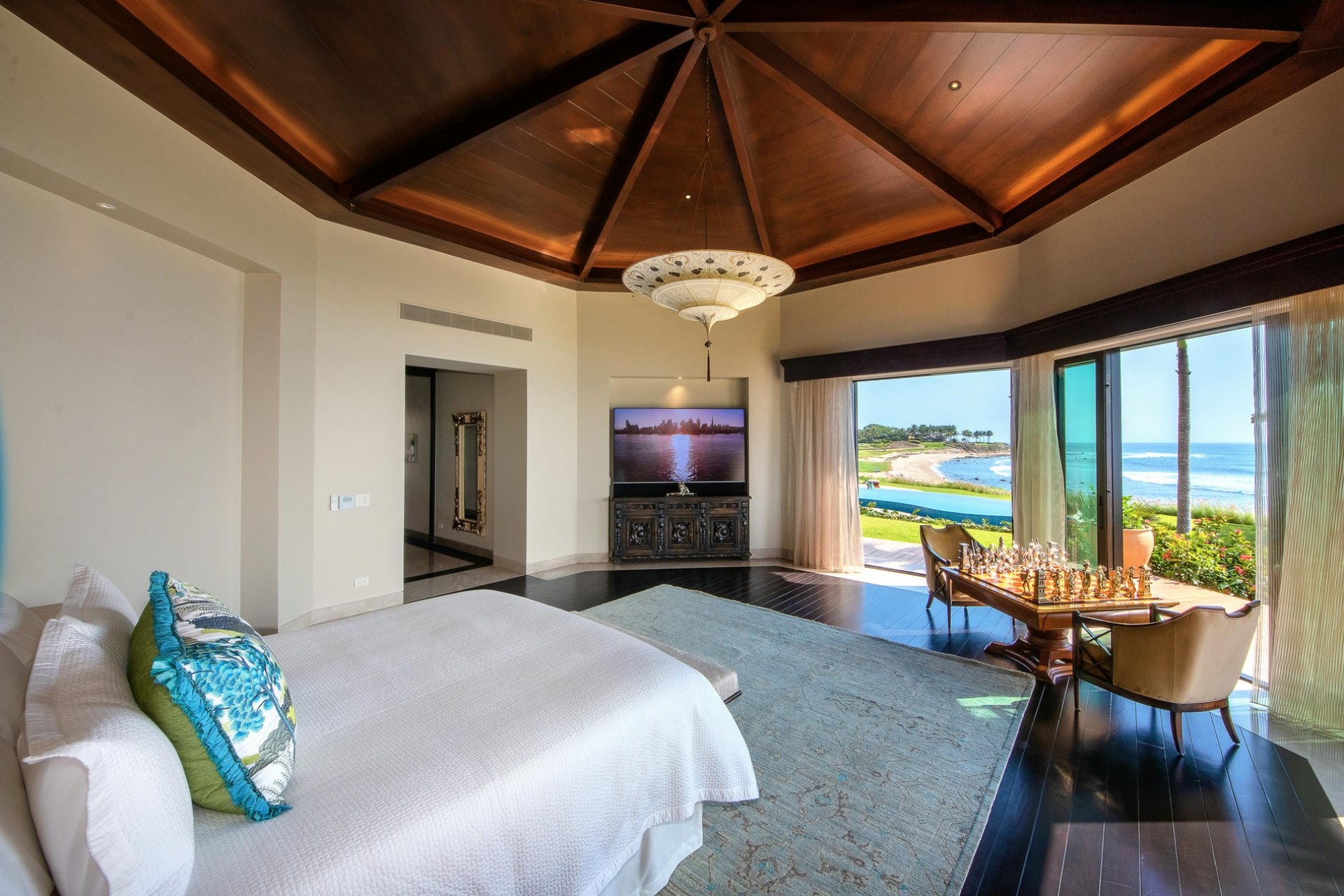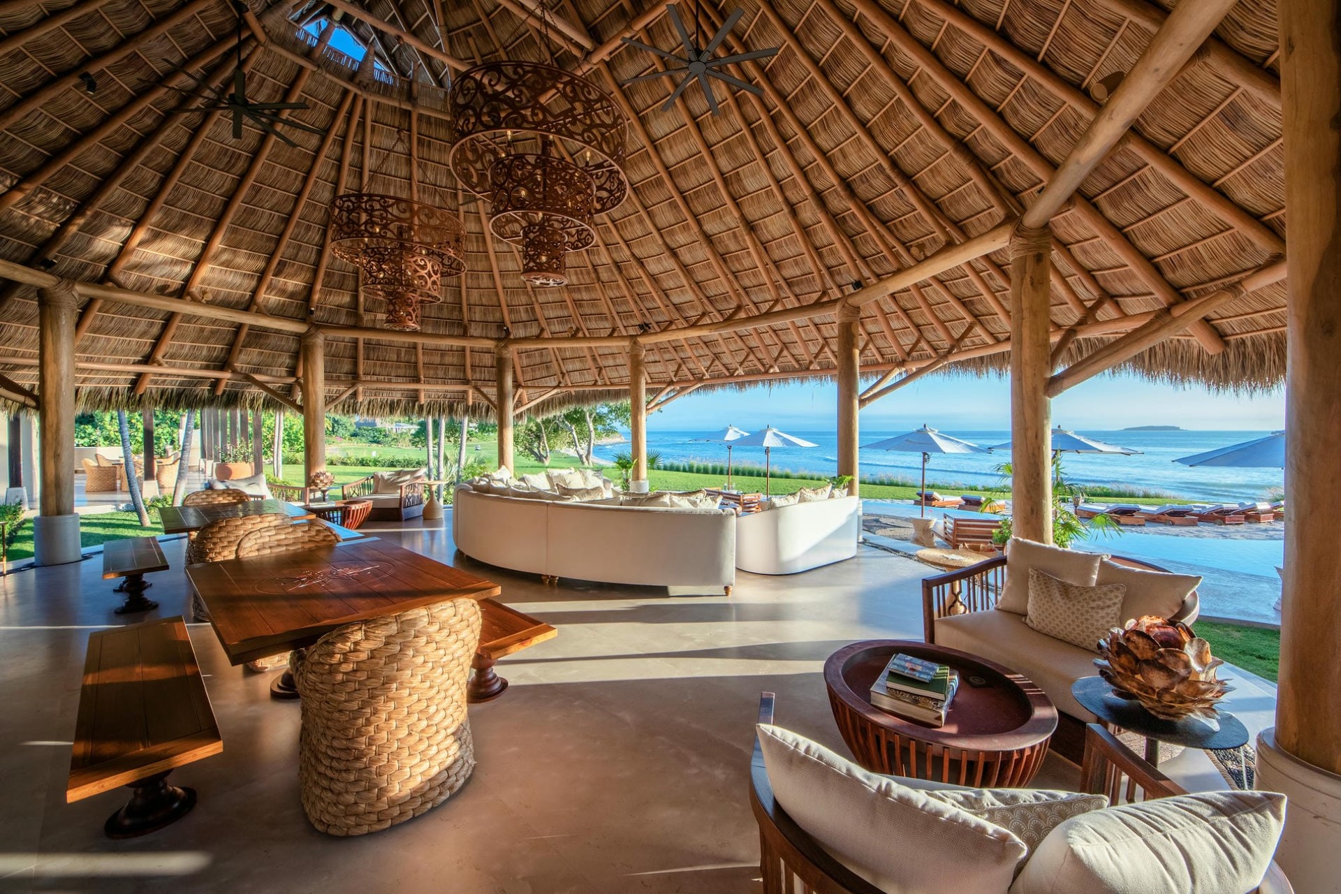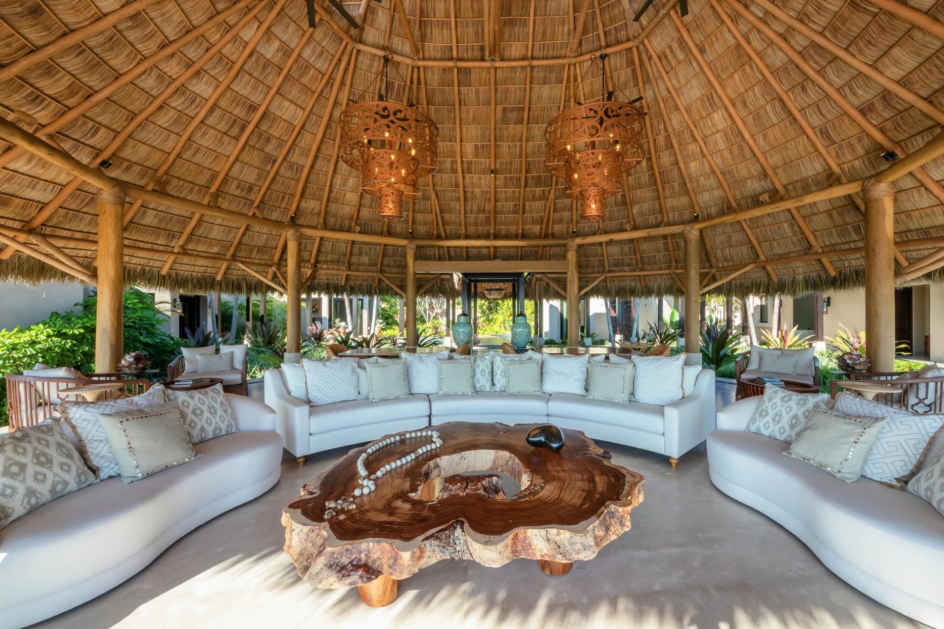 This impressive 24,700-square-foot oceanfront oasis provides ample space for relaxation and socialising with loved ones. At the heart of the villa is the vast outdoor palapa, which connects the separate structures of the estate via wooden walkways. Crafted by local artisans, this traditional palapa features a semi-circle of plush lounges, oversized chairs, games tables, and a beautiful wooden dining table overlooking the pool and the ocean beyond. With free-flowing ocean breezes and stunning views, it’s the perfect place to enjoy casual brunches, sunset cocktails, or elegant dinner parties.